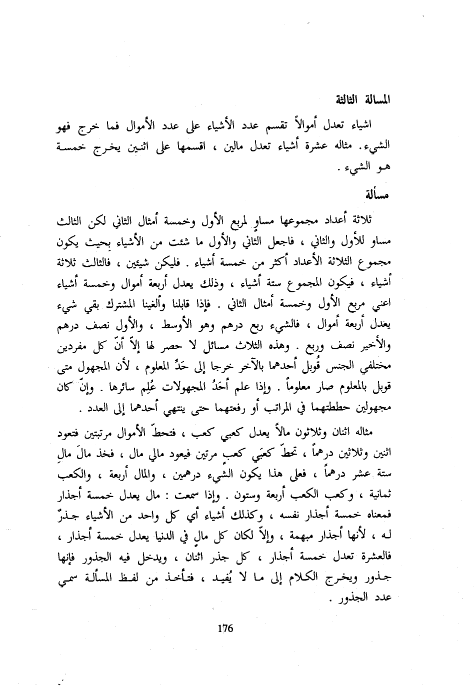 ثَلَاثَةُ أَعْدَادٍ مَجْمُوعُهَا مُسَاوٍ لِمُرَبَّعِ الْأَوَّلِ وَخَمْسَةِ أَمْثَالِ الثَّانِي لَكِنَّ الثَّالِثَ مُسَاوٍ لِلْأَوَّلِ وَالثَّانِي فَاجْعَلِ الثَّانِيَ وَالْأَوَّلَ مَا شِئْتَ مِنَ الْأَشْيَاءِ بِحَيْثُ يَكُونُ مَجْمُوعُ الثَّلَاثَةِ الْأَعْدَادِ أَكْثَرَ مِنْ خَمْسَةِ أَشْيَاءَ فَلْيَكُنْ شَيْئَيْنِ فَالثَّالِثُ ثَلَاثَةُ أَشْيَاءَ فَيَكُونُ الْمَجْمُوعُ سِتَّةَ أَشْيَاءَ وَذَلِكَ يَعْدِلُ أَرْبَعَةَ أَمْوَالٍ وَخَمْسَةَ أَشْيَاءَ أَعْنِي مُرَبَّعَ الْأَوَّلِ وَخَمْسَةَ أَمْثَالِ الثَّانِي فَإِذَا قَابَلْنَا وَأَلْغَيْنَا الْمُشْتَرَكَ بَقِيَ شَيْءٌ يَعْدِلُ أَرْبَعَةَ أَمْوَالٍ فَالشَّيْءُ رُبُعُ دِرْهَمٍ وَهُوَ الْأَوْسَطُ وَالْأَوَّلُ نِصْفُ دِرْهَمٍ وَالْأَخِيرُ نِصْفٌ وَرُبُعٌ وَهَذِهِ الثَّلَاثُ مَسَائِلَ لَا حَصْرَ لَهَا إِلَّا أَنَّ كُلَّ مُفْرَدَيْنِ مُخْتَلِفَيِ الْجِنْسِ قُوبِلَ أَحدهمَا بِالْآخرِ خرجا إِلَى حَدِّ الْمَعْلُومِ لِأَنَّ الْمَجْهُولَ مَتَى قُوبِلَ بِالْمَعْلُومِ صَارَ مَعْلُومًا وَإِذَا عُلِمَ أَحَدُ الْمَجْهُولَاتِ علم سائرها وَإِن كَانَ مَجْهُولَيْنِ حَطَطْتَهُمَا فِي الْمَرَاتِبِ أَوْ رَفَعْتَهُمَا حَتَّى يَنْتَهِيَ أَحَدُهُمَا إِلَى الْعَدَدِ مِثَالُهُ اثْنَانِ وَثَلَاثُونَ مَالًا يَعْدِلُ كَعْبَيْ كَعْبٍ فَتَحُطُّ الْأَمْوَالَ مَرْتَبَتَيْنِ فَتَعُودُ اثْنَيْنِ وَثَلَاثِينَ دِرْهَمًا تَحُطُّ كَعْبَيْ كَعْبٍ مَرَّتَيْنِ فَيَعُودُ مَالَيْ مَالٍ فَخُذْ مالَ مالِ سِتَّةَ عَشَرَ دِرْهَمًا فَعَلَى هَذَا يَكُونُ الشَّيْءُ دِرْهَمَيْنِ وَالْمَالُ أَرْبَعَةٌ وَالْكَعْبُ ثَمَانِيَةٌ وَكَعْبُ الْكَعْبِ أَرْبَعَةٌ وَسِتُّونَ وَإِذَا سَمِعْتَ مَالٌ يَعْدِلُ خَمْسَةَ أَجْذَارٍ فَمَعْنَاهُ خَمْسَةُ أَجْذَارِ نَفْسِهِ وَكَذَلِكَ أَشْيَاءُ أَي كل وَاحِد من أَشْيَاء جِذْرٌ لَهُ لِأَنَّهَا أَجْذَارٌ مُبْهَمَةٌ وَإِلَّا لَكَانَ كُلُّ مَالٍ فِي الدُّنْيَا يَعْدِلُ خَمْسَةَ أَجْذَارٍ فَالْعَشَرَةُ تَعْدِلُ خَمْسَةَ أَجْذَارٍ كُلُّ جِذْرٍ اثْنَانِ وَيَدْخُلُ فِيهِ الْجُذُورُ فَإِنَّهَا جُذُورٌ وَيَخْرُجُ الْكَلَامُ إِلَى مَا لَا يُفِيدُ فَتَأْخُذُ مِنْ لَفْظِ الْمَسْأَلَةِ سُمِّيَ عَدَدُ الْجُذُورِ