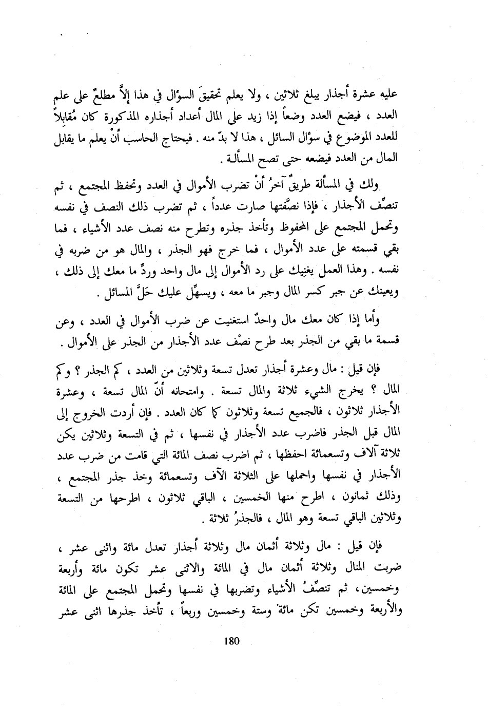 عَلَيْهِ عَشَرَةَ أَجْذَارٍ يَبْلُغُ ثَلَاثِينَ وَلَا يَعْلَمُ تَحْقِيقَ السُّؤَالِ فِي هَذَا إِلَّا مُطَّلِعٌ عَلَى عِلْمِ الْعَدَدِ فَيَضَعُ الْعَدَدَ وَضْعًا إِذَا زِيدَ عَلَى الْمَالِ أَعْدَادُ أَجْذَارِهِ الْمَذْكُورَةِ كَانَ مُقَابِلًا لِلْعَدَدِ الْمَوْضُوعِ فِي سُؤَالِ السَّائِلِ هَذَا لَا بُدَّ مِنْهُ فَيَحْتَاجُ الْحَاسِبُ أَنْ يَعْلَمَ مَا يُقَابِلُ الْمَالَ مِنَ الْعَدَدِ فَيَضَعُهُ حَتَّى تَصِحَّ الْمَسْأَلَةُ وَلَكَ فِي الْمَسْأَلَةِ طَرِيقٌ آخَرُ أَنْ تضرب الْأَمْوَال فِي الْعدَد وَتحفظ الْمُجْتَمع ثمَّ تُنَصِّفُ الْأَجْذَارَ فَإِذَا نَصَّفْتَهَا صَارَتْ عَدَدًا ثُمَّ تَضْرِبُ ذَلِكَ النِّصْفَ فِي نَفْسِهِ وَتَحْمِلُ الْمُجْتَمِعَ عَلَى الْمَحْفُوظِ وَتَأْخُذُ جِذْرَهُ وَتَطْرَحُ مِنْهُ نِصْفَ عَدَدِ الْأَشْيَاءِ فَمَا بَقِيَ قَسَمْتَهُ عَلَى عَدَدِ الْأَمْوَالِ فَمَا خَرَجَ فَهُوَ الْجَذْرُ وَالْمَالُ هُوَ من ضربه فِي نَفسه وَهَذَا الْعَمَل يُغْنِيك عَلَى رَدِّ الْأَمْوَالِ إِلَى مَالٍ وَاحِدٍ وَرَدِّ مَا مَعَك إِلَى ذَلِك ويعينك عَن جَبْرِ كَسْرِ الْمَالِ وَجَبْرِ مَا مَعَهُ وَيُسَهِّلُ عَلَيْكَ حَلَّ الْمَسَائِلِ وَأَمَّا إِذَا كَانَ مَعَكَ مَالٌ وَاحِدٌ اسْتَغْنَيْتَ عَنْ ضَرْبِ الْأَمْوَالِ فِي الْعَدَدِ وَعَنْ قِسْمَةِ مَا بَقِيَ مِنَ الْجَذْرِ بَعْدَ طَرْحِ نِصْفِ عَدَدِ الْأَجْذَارِ مِنَ الْجَذْرِ عَلَى الْأَمْوَالِ فَإِنْ قِيلَ مَالٌ وَعَشَرَةُ أَجْذَارٍ تَعْدِلُ تِسْعَةً وَثَلَاثِينَ مِنَ الْعَدَدِ كَمِ الْجَذْرُ وَكَمِ الْمَالُ يَخْرُجُ الشَّيْءُ ثَلَاثَةً وَالْمَالُ تِسْعَةً وَامْتِحَانُهُ أَنَّ الْمَالَ تِسْعَةٌ وَعَشَرَةُ الْأَجْذَارِ ثَلَاثُونَ فَالْجَمِيعُ تِسْعَةٌ وَثَلَاثُونَ كَمَا كَانَ الْعَدَدُ فَإِنْ أَرَدْتَ الْخُرُوجَ إِلَى الْمَالِ قَبْلَ الْجَذْرِ فَاضْرِبْ عَدَدَ الْأَجْذَارِ فِي نَفْسِهَا ثُمَّ فِي التِّسْعَةِ وَثَلَاثِينَ يَكُنْ ثَلَاثَةَ آلَافٍ وَتِسْعَمِائَةٍ احْفَظْهَا ثُمَّ اضْرِبِ نِصْفَ الْمِائَةِ الَّتِي قَامَتْ مِنْ ضَرْبِ عَدَدِ الْأَجْذَارِ فِي نَفْسِهَا وَاحْمِلْهَا عَلَى الثَّلَاثَةِ آلَافٍ وَتِسْعِمِائَةٍ وَخُذْ جَذْرَ الْمُجْتَمِعِ وَذَلِكَ ثَمَانُونَ اطْرَحْ مِنْهَا الْخَمْسِينَ الْبَاقِي ثَلَاثُونَ اطْرَحْهَا من تِسْعَة وَثَلَاثِينَ الْبَاقِي تِسْعَةٌ وَهُوَ الْمَالُ فَالْجَذْرُ ثَلَاثَةٌ فَإِنْ قِيلَ مَالٌ وَثَلَاثَةُ أَثْمَانِ مَالٍ وَثَلَاثَةُ أجذار تعدل مائَة واثني عشر ضرب المنال وَثَلَاثَةَ أَثْمَانِ مَالٍ فِي الْمِائَةِ وَالِاثْنَيْ عَشَرَ تَكُونُ مِائَةً وَأَرْبَعَةً وَخَمْسِينَ ثُمَّ تُنَصِّفُ الْأَشْيَاءَ وَتَضْرِبُهَا فِي نَفْسِهَا وَتَحْمِلُ الْمُجْتَمِعَ عَلَى الْمِائَةِ وَالْأَرْبَعَةِ وَخَمْسِينَ تَكُنْ مِائَةً وَسِتَّةً وَخَمْسِينَ وَرُبُعًا تَأْخُذ جذرها اثْنَي عشر