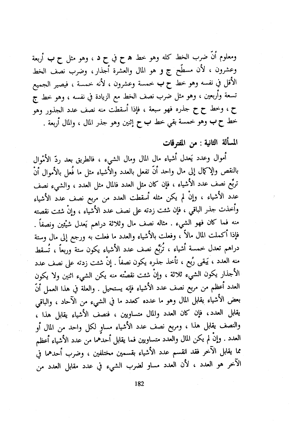 أَمْوَالٌ وَعَدَدٌ يَعْدِلُ أَشْيَاءَ مَالِ الْمَالِ وَمَالَ الشَّيْءِ فَالطَّرِيقُ بَعْدَ رَدِّ الْأَمْوَالِ بِالنَّقْصِ وَالْإِكْمَالِ إِلَى مَال وَاحِد أَن تَفْعَلَ بِالْعَدَدِ وَالْأَشْيَاءِ مِثْلَ مَا فَعَلَ بِالْأَمْوَالِ أَنْ تُرَبِّعَ نِصْفَ عَدَدِ الْأَشْيَاءِ فَإِنْ كَانَ مِثْلَ الْعَدَدِ فَالْمَالُ مِثْلُ الْعَدَدِ وَالشَّيْءُ نِصْفُ عَدَدِ الْأَشْيَاءِ وَإِنْ لَمْ يَكُنْ مِثْلَهُ أَسْقَطْتَ الْعَدَدَ مِنْ مُرَبَّعِ نِصْفِ عَدَدِ الْأَشْيَاءِ وَأَخَذْتَ جَذْرَ الْبَاقِي فَإِنْ شِئْتَ زِدْتَهُ عَلَى نِصْفِ عَدَدِ الْأَشْيَاءِ وَإِنْ شِئْتَ نَقَصْتَهُ مِنْهُ فَمَا كَانَ فَهُوَ الشَّيْءُ مِثَالُهُ نِصْفُ مَالٍ وَثَلَاثَةُ دَرَاهِمَ يَعْدِلُ شَيْئَيْنِ وَنِصْفًا فَإِذَا أَكْمَلْتَ الْمَالَ مَالًا وَفَعَلْتَ بِالْأَشْيَاءِ وَالْعَدَدِ مَا فَعَلْتَ بِهِ وَرَجَعَ إِلَى مَالٍ وَسِتَّةِ دَرَاهِمَ تَعْدِلُ خَمْسَةَ أَشْيَاءَ تُرَبِّعُ نِصْفَ عَدَدِ الْأَشْيَاءِ يَكُونُ سِتَّةً وَرُبُعًا تُسْقِطُ مِنْهُ الْعَدَدَ يَبْقَى رُبُعٌ تَأْخُذُ جِذْرَهُ يَكُونُ نِصْفًا إِنْ شِئْتَ زِدْتَهُ عَلَى نِصْفِ عَدَدِ الْأَجْذَارِ يَكُونُ الشَّيْءُ ثَلَاثَةً وَإِنْ شِئْت نقصته مِنْهُ يكون الشَّيْءُ اثْنَيْنِ وَلَا يَكُونُ الْعَدَدُ أَعْظَمَ مِنْ مُرَبَّعِ نِصْفِ عَدَدِ الْأَشْيَاءِ فَإِنَّهُ يَسْتَحِيلُ وَالْعِلَّةُ فِي هَذَا الْعَمَلِ أَنَّ بَعْضَ الْأَشْيَاءِ يُقَابِلُ الْمَالَ وَهُوَ مَا عَدَدُهُ كَعَدَدِ مَا فِي الشَّيْءِ مِنَ الْآحَادِ وَالْبَاقِيَ يُقَابِلُ الْعَدَدَ فَإِنْ كَانَ الْعَدَدُ وَالْمَالُ مُتَسَاوِيَيْنِ فَنِصْفُ الْأَشْيَاءِ يُقَابِلُ هَذَا وَالنِّصْفُ يُقَابِلُ هَذَا وَمُرَبَّعُ نِصْفِ عَدَدِ الْأَشْيَاءِ مُسَاوٍ لِكُلِّ وَاحِدٍ مِنَ الْمَالِ أَوِ الْعَدَدِ وَإِنْ لَمْ يَكُنْ الْمَالُ وَالْعَدَدُ مُتَسَاوِيَيْنِ فَمَا يُقَابِلُ أَحَدُهُمَا مِنْ عَدَدِ الْأَشْيَاءِ أَعْظَمُ مِمَّا يُقَابِلُ الْآخَرُ فَقَدِ انْقَسَمَ عَدَدُ الْأَشْيَاءِ بِقِسْمَيْنِ مُخْتَلِفَيْنِ وَضَرْبُ أَحَدِهِمَا فِي الْآخَرِ هُوَ الْعَدَدُ لِأَنَّ الْعَدَدَ مُسَاوٍ لِضَرْبِ الشَّيْءِ فِي عَدَدٍ مُقَابِلَ الْعَدَدِ مِنَ