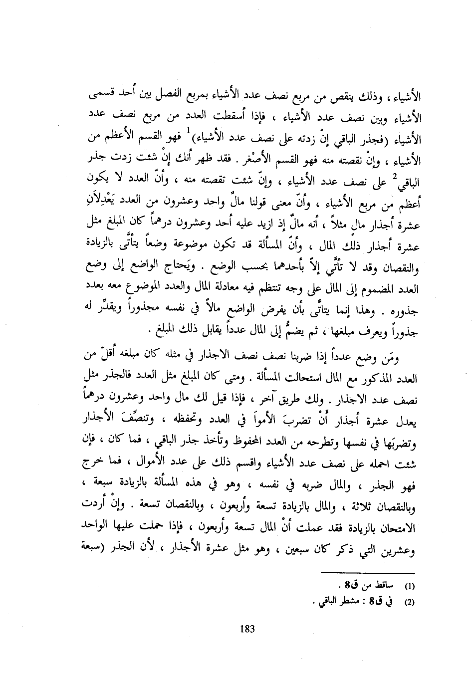 الْأَشْيَاءِ وَذَلِكَ يَنْقُصُ مِنْ مُرَبَّعِ نِصْفِ عَدَدِ الْأَشْيَاءِ بِمُرَبَّعِ الْفَصْلِ بَيْنَ أَحَدِ قِسْمَيِ الْأَشْيَاءِ وَبَيْنَ نِصْفِ عَدَدِ الْأَشْيَاءِ فَإِذَا أَسْقَطْتَ الْعَدَدَ مِنْ مُرَبَّعِ نِصْفِ عَدَدِ الْأَشْيَاءِ فَجَذْرُ الْبَاقِي إِنْ زِدْتَهُ عَلَى نِصْفِ عَدَدِ الْأَشْيَاءِ فَهُوَ الْقِسْمُ الْأَعْظَمُ مِنَ الْأَشْيَاءِ وَإِنْ نَقَصْتَهُ مِنْهُ فَهُوَ الْقِسْمُ الْأَصْغَرُ فَقَدْ ظَهَرَ أَنَّكَ إِنْ شِئْتَ زِدْتَ جَذْرَ الْبَاقِي عَلَى نِصْفِ عَدَدِ الْأَشْيَاءِ وَإِنْ شِئْتَ نَقَصْتَهُ مِنْهُ وَأَنَّ الْعَدَدَ لَا يَكُونُ أَعْظَمَ مِنْ مُرَبَّعِ الْأَشْيَاءِ وَأَنَّ مَعْنَى قَوْلِنَا مَالٌ وَاحِدٌ وَعِشْرُونَ مِنَ الْعَدَدِ يَعْدِلَانِ عَشَرَةَ أَجْذَارِ مَالٍ مَثَلًا أَنَّهُ مَالٌ إِذا أَزِيد عَلَيْهِ أحد وَعِشْرُونَ دِرْهَمًا كَانَ الْمَبْلَغُ مِثْلَ عَشَرَةِ أَجْذَارِ ذَلِكَ الْمَالِ وَأَنَّ الْمَسْأَلَةَ قَدْ تَكُونُ مَوْضُوعَةً وضعا يَتَأَتَّى بِالزِّيَادَةِ وَالنُّقْصَان وَقد لَا تَأتي إِلَّا بِأَحَدِهِمَا بِحَسَبِ الْوَضْعِ وَيَحْتَاجُ الْوَاضِعُ إِلَى وضع الْعدَد المضموم إِلَى الْمَالِ عَلَى وَجْهٍ تَنْتَظِمُ فِيهِ مُعَادَلَةُ الْمَالِ وَالْعَدَدِ الْمَوْضُوعِ مَعَهُ بِعَدَدِ جُذُورِهِ وَهَذَا إِنَّمَا يَتَأَتَّى بِأَنْ يَفْرِضَ الْوَاضِعُ مَالًا فِي نَفْسِهِ مَجْذُورًا وَيُقَدِّرُ لَهُ جُذُورًا وَيَعْرِفُ مَبْلَغَهَا ثُمَّ يَضُمُّ إِلَى الْمَالِ عَدَدًا يُقَابِلُ ذَلِكَ الْمَبْلَغَ وَمَنْ وَضَعَ عَدَدًا إِذَا ضَرَبْنَا نِصْفَ نِصْفِ الْأَجْذَارِ فِي مِثْلِهِ كَانَ مَبْلَغُهُ أَقَلَّ مِنَ الْعَدَدِ الْمَذْكُورِ مَعَ الْمَالِ اسْتَحَالَتِ الْمَسْأَلَةُ وَمَتَى كَانَ الْمَبْلَغُ مِثْلَ الْعَدَدِ فَالْجَذْرُ مِثْلُ نِصْفِ عَدَدِ الْأَجْذَارِ وَلَكَ طَرِيقٌ آخَرُ فَإِذَا قِيلَ لَكَ مَالٌ وَاحِدٌ وَعِشْرُونَ دِرْهَمًا يَعْدِلُ عَشَرَةَ أَجْذَارٍ أَنْ تَضْرِبَ الْأَمْوَالَ فِي الْعَدَدِ وَتَحْفَظَهُ وَتُنَصِّفَ الْأَجْذَارَ وَتَضْرِبَهَا فِي نَفْسِهَا وَتَطْرَحَهُ مِنَ الْعَدَدِ الْمَحْفُوظِ وَتَأْخُذَ جَذْرَ الْبَاقِي فَمَا كَانَ فَإِنْ شِئْتَ احْمِلْهُ عَلَى نِصْفِ عَدَدِ الْأَشْيَاءِ وَاقْسِمْ ذَلِكَ عَلَى عَدَدِ الْأَمْوَالِ فَمَا خرج فَهُوَ الجذر وَالْمَال ضربه فِي نَفْسِهِ وَهُوَ فِي هَذِهِ الْمَسْأَلَةِ بِالزِّيَادَةِ سَبْعَةٌ وَبِالنُّقْصَانِ ثَلَاثَةٌ وَالْمَالُ بِالزِّيَادَةِ تِسْعَةٌ وَأَرْبَعُونَ وَبِالنُّقْصَانِ تِسْعَةٌ وَإِنْ أَرَدْتَ الِامْتِحَانَ بِالزِّيَادَةِ فَقَدْ عملت أَنَّ الْمَالَ تِسْعَةٌ وَأَرْبَعُونَ فَإِذَا حَمَلْتَ عَلَيْهَا الْوَاحِدَ وَعِشْرِينَ الَّتِي ذُكِرَ كَانَ سَبْعِينَ وَهُوَ مِثْلُ عَشَرَةِ الْأَجْذَارِ لِأَنَّ الْجَذْرَ سَبْعَةٌ
