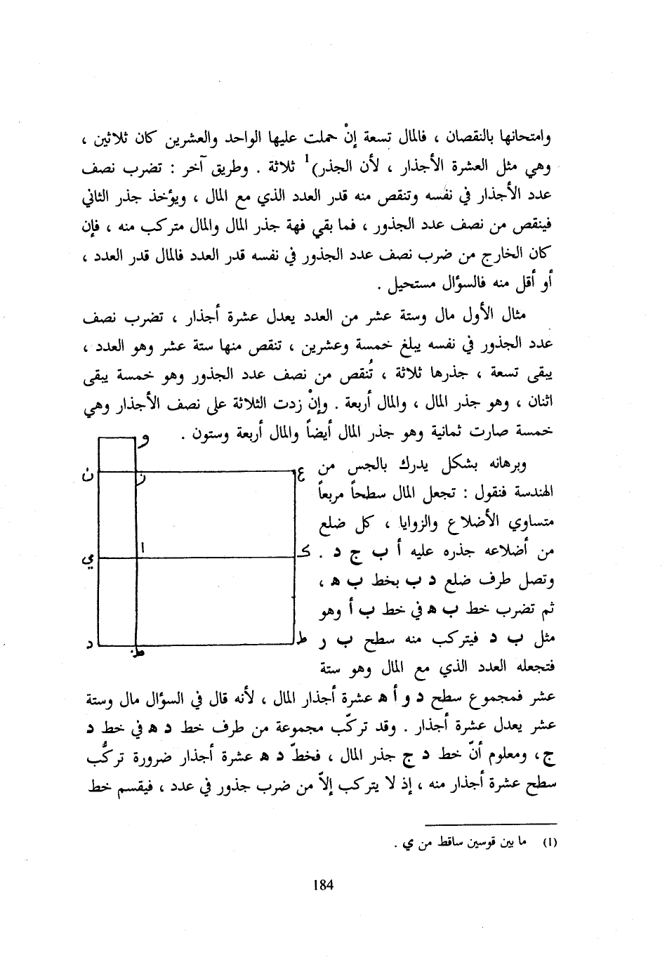 وَامْتِحَانُهَا بِالنُّقْصَانِ فَالْمَالُ تِسْعَةٌ إِنْ حَمَلْتَ عَلَيْهَا الْوَاحِدَ وَالْعِشْرِينَ كَانَ ثَلَاثِينَ وَهِيَ مِثْلُ الْعَشَرَةِ الْأَجْذَارِ لِأَنَّ الْجِذْرَ ثَلَاثَةٌ وَطَرِيقٌ آخَرُ تَضْرِبُ نِصْفَ عَدَدِ الْأَجْذَارِ فِي نَفْسِهِ وَتَنْقُصُ مِنْهُ قَدْرَ الْعَدَدِ الَّذِي مَعَ الْمَالِ وَيُؤْخَذُ جَذْرَ الثَّانِي فَيُنْقَصُ مِنْ نِصْفِ عَدَدِ الْجُذُورِ فَمَا بَقِي فهة جَذْرُ الْمَالِ وَالْمَالُ مُتَرَكِّبٌ مِنْهُ فَإِنْ كَانَ الْخَارِج من ضرب نصف عدد الجذور فِي نَفْسِهِ قُدِّرَ الْعَدَدُ فَالْمَالُ قَدْرُ الْعَدَدِ أَوْ أَقَلُّ مِنْهُ فَالسُّؤَالُ مُسْتَحِيلٌ مِثَالُ الْأَوَّلِ مَالٌ وَسِتَّةَ عَشَرَ مِنَ الْعَدَدِ يَعْدِلُ عَشَرَةَ أَجْذَارٍ تَضْرِبُ نِصْفَ عَدَدِ الْجُذُورِ فِي نَفْسِهِ يَبْلُغُ خَمْسَةً وَعِشْرِينَ تَنْقُصُ مِنْهَا سِتَّةَ عَشَرَ وَهُوَ الْعَدَدُ يَبْقَى تِسْعَةٌ جَذْرُهَا ثَلَاثَةٌ تَنْقُصُ مِنْ نِصْفِ عَدَدِ الْجُذُورِ وَهُوَ خَمْسَةٌ يَبْقَى اثْنَانِ وَهُوَ جَذْرُ الْمَالِ وَالْمَالُ أَرْبَعَةٌ وَإِنْ زِدْتَ الثَّلَاثَةَ عَلَى نِصْفِ الْأَجْذَارِ وَهِيَ خَمْسَةٌ صَارَتْ ثَمَانِيَةً وَهُوَ جَذْرُ الْمَالِ أَيْضًا وَالْمَالُ أَرْبَعَةٌ وَسِتُّونَ وبرهانه بشكل يدْرك بالجس مِنَ الْهَنْدَسَةِ فَنَقُولُ تَجْعَلُ الْمَالَ سَطْحًا مُرَبَّعًا مُتَسَاوِيَ الْأَضْلَاعِ وَالزَّوَايَا كُلُّ ضِلْعٍ مِنْ أَضْلَاعِهِ جَذْرُهُ عَلَيْهِ أَب ج د وَتَصِلُ طَرَفَ ضِلْعِ د ب بِخَطِّ ب هـ ثُمَّ تَضْرِبُ خَطَّ ب هـ فِي خَطِّ ب أوَهُوَ مِثْلُ ب د فَيَتَرَكَّبُ مِنْهُ سَطْحُ ب ر فَتَجْعَلُهُ الْعَدَدَ الَّذِي مَعَ الْمَالِ وَهُوَ سِتَّةَ عَشَرَ فَمَجْمُوعُ سَطْحِ د وأ هـ عَشَرَةُ أَجْذَارِ الْمَالِ لِأَنَّهُ قَالَ فِي السُّؤَالِ مَالٌ وَسِتَّةَ عَشَرَ يَعْدِلُ عَشَرَةَ أَجْذَارٍ وَقَدْ تُرَكِّبُ مَجْمُوعَةً مِنْ طَرَفِ خَطِّ د هـ فِي خَطِّ د ج وَمَعْلُومٌ أَنَّ خَطَّ د ج جَذْرُ الْمَالِ فَخَطُّ د هـ عَشَرَةُ أَجْذَارٍ ضَرُورَةَ تَرَكُّبِ سَطْحِ عَشَرَةِ أَجْذَارٍ مِنْهُ إِذْ لَا يَتَرَكَّبُ إِلَّا مِنْ ضَرْبِ جُذُورٍ فِي عَدَدٍ فَيَقْسِمُ خَطَّ