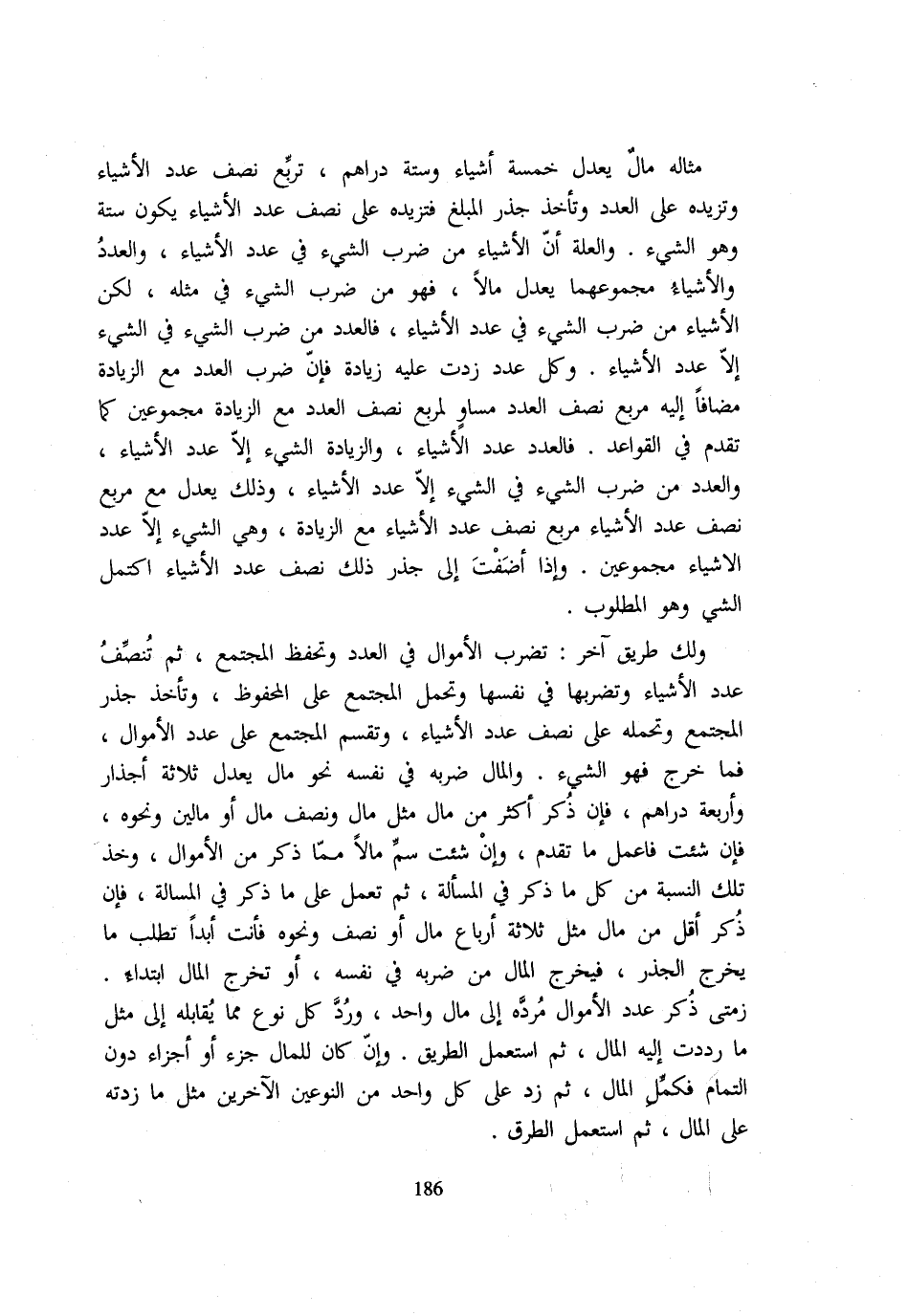 مِثَالُهُ مَالٌ يَعْدِلُ خَمْسَةَ أَشْيَاءَ وَسِتَّةَ دَرَاهِمَ تربع نصف عدد الْأَشْيَاء وتزيده على الْعدَد وَتَأْخُذ جذر الْمبلغ فتزيده على نصف عدد الْأَشْيَاءِ يَكُونُ سِتَّةً وَهُوَ الشَّيْءُ وَالْعِلَّةُ أَنَّ الْأَشْيَاءَ مِنْ ضَرْبِ الشَّيْءِ فِي عَدَدِ الْأَشْيَاءِ وَالْعَدَدُ وَالْأَشْيَاءُ مَجْمُوعُهُمَا يَعْدِلُ مَالًا فَهُوَ مَنْ ضَرْبِ الشَّيْءِ فِي مِثْلِهِ لَكِنَّ الْأَشْيَاءَ مِنْ ضَرْبِ الشَّيْءِ فِي عَدَدِ الْأَشْيَاءِ فَالْعَدَدُ مِنْ ضَرْبِ الشَّيْءِ فِي الشَّيْءِ إِلَّا عَدَدَ الْأَشْيَاءِ وَكُلُّ عَدَدٍ زِدْتَ عَلَيْهِ زِيَادَةً فَإِنَّ ضَرْبَ الْعَدَدِ مَعَ الزِّيَادَةِ مُضَافًا إِلَيْهِ مُرَبَّعُ نِصْفِ الْعَدَدِ مُسَاوٍ لِمُرَبَّعِ نِصْفِ الْعَدَدِ مَعَ الزِّيَادَةِ مَجْمُوعَيْنِ كَمَا تَقَدَّمَ فِي الْقَوَاعِدِ فَالْعَدَدُ عَدَدُ الْأَشْيَاءِ وَالزِّيَادَةُ الشَّيْءُ إِلَّا عَدَدَ الْأَشْيَاءِ وَالْعَدَدُ مِنْ ضَرْبِ الشَّيْءِ فِي الشَّيْءِ إِلَّا عَدَدَ الْأَشْيَاءِ وَذَلِكَ يَعْدِلُ مَعَ مُرَبَّعِ نِصْفِ عَدَدِ الْأَشْيَاءِ مُرَبَّعَ نِصْفِ عَدَدِ الْأَشْيَاءِ مَعَ الزِّيَادَةِ وَهِيَ الشَّيْءُ إِلَّا عَدَدَ الْأَشْيَاءِ مَجْمُوعَيْنِ وَإِذَا أَضَفْتَ إِلَى جَذْرِ ذَلِكَ نِصْفَ عَدَدِ الْأَشْيَاءِ اكتمل الشَّيْء وَهُوَ وَالْمَطْلُوب وَلَكَ طَرِيقٌ آخَرُ تَضْرِبُ الْأَمْوَالَ فِي الْعَدَدِ وَتَحْفَظُ الْمُجْتَمِعَ ثُمَّ تُنَصِّفُ عَدَدَ الْأَشْيَاءِ وَتَضْرِبُهَا فِي نَفْسِهَا وَتَحْمِلُ الْمُجْتَمِعَ عَلَى الْمَحْفُوظِ وَتَأْخُذُ جَذْرَ الْمُجْتَمِعِ وَتَحْمِلُهُ عَلَى نِصْفِ عَدَدِ الْأَشْيَاءِ وَتَقْسِمُ الْمُجْتَمِعَ عَلَى عَدَدِ الْأَمْوَالِ فَمَا خَرَجَ فَهُوَ الشَّيْءُ وَالْمَالُ ضَرْبُهُ فِي نَفْسِهِ نَحْوَ مَالٍ يَعْدِلُ ثَلَاثَةَ أَجْذَارٍ وَأَرْبَعَةَ دَرَاهِمَ فَإِنْ ذُكِرَ أَكْثَرُ مِنْ مَالٍ مِثْلَ مَالٍ وَنِصْفِ مَال أَو مالين وَنَحْوه فَإِن ئشت فَاعْمَلْ مَا تَقَدَّمَ وَإِنْ شِئْتَ سَمِّ مَالًا مِمَّا ذُكِرَ مِنَ الْأَمْوَالِ وَخُذْ تِلْكَ النِّسْبَةَ مِنْ كُلِّ مَا ذُكِرَ فِي الْمَسْأَلَةِ ثُمَّ تَعْمَلُ عَلَى مَا ذُكِرَ فِي الْمَسْأَلَةِ فَإِنْ ذُكِرَ أَقَلُّ مِنْ مَالٍ مِثْلَ ثَلَاثَةِ أَرْبَاعِ مَالٍ أَوْ نِصْفٍ وَنَحْوِهِ فَأَنْتَ أَبَدًا تَطْلُبُ مَا يُخْرِجُ الْجَذْرَ فَيَخْرُجُ الْمَالُ مِنْ ضَرْبِهِ فِي نَفْسِهِ أَوْ تُخْرِجُ الْمَالَ ابْتِدَاءً وَمَتَى ذكر عدد الْأَمْوَال مرده إِلَى مَالٍ وَاحِدٍ وَرُدَّ كُلَّ نَوْعٍ مِمَّا يُقَابِلُهُ إِلَى مِثْلِ مَا رَدَدْتَ إِلَيْهِ الْمَالَ ثُمَّ اسْتَعْمِلِ الطَّرِيقَ وَإِنْ كَانَ لِلْمَالِ جُزْءٌ أَوْ أَجْزَاءٌ دُونَ التَّمَامِ فَكَمِّلِ الْمَالَ ثُمَّ زِدْ عَلَى كُلِّ وَاحِدٍ مِنَ النَّوْعَيْنِ الْآخَرَيْنِ مِثْلَ مَا زِدْتَهُ عَلَى الْمَالِ ثُمَّ اسْتَعْمِلِ الطّرق