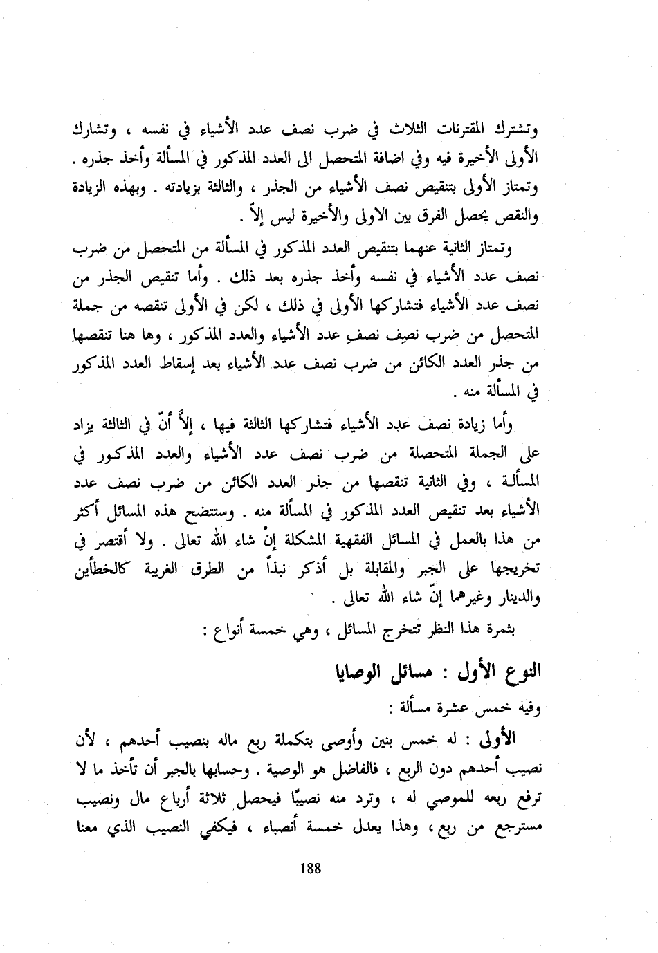 وتشترك المقترنات الثَّلَاثُ فِي ضَرْبِ نِصْفِ عَدَدِ الْأَشْيَاءِ فِي نَفْسِهِ وَتُشَارِكُ الْأُولَى الْأَخِيرَةَ فِيهِ وَفِي إِضَافَةِ الْمُتَحَصِّلِ إِلَى الْعَدَدِ الْمَذْكُورِ فِي الْمَسْأَلَةِ وَأَخْذِ جِذْرِهِ وَتَمْتَازُ الْأُولَى بِتَنْقِيصِ نِصْفِ الْأَشْيَاءِ مِنَ الْجَذْرِ وَالثَّالِثَةُ بِزِيَادَتِهِ وَبِهَذِهِ الزِّيَادَةِ وَالنَّقْصِ يَحْصُلُ الْفَرْقُ بَيْنَ الْأُولَى وَالْأَخِيرَةِ لَيْسَ إِلَّا وَتَمْتَازُ الثَّانِيَةُ عَنْهُمَا بِتَنْقِيصِ الْعَدَدِ الْمَذْكُورِ فِي الْمَسْأَلَةِ مِنَ الْمُتَحَصِّلِ مِنْ ضَرْبِ نِصْفِ عَدَدِ الْأَشْيَاءِ فِي نَفْسِهِ وَأَخْذِ جِذْرِهِ بَعْدَ ذَلِكَ وَأَمَّا تنقيص الجذر من نِصْفِ عَدَدِ الْأَشْيَاءِ فِي نَفْسِهِ وَأَخْذِ جِذْرِهِ بَعْدَ ذَلِكَ وَأَمَّا تَنْقِيصُ الْجَذْرِ مِنْ نِصْفِ عَدَدِ الْأَشْيَاءِ فَتُشَارِكُهَا الْأُولَى فِي ذَلِكَ لَكِنْ فِي الْأُولَى تَنْقُصُهُ مِنْ جُمْلَةِ الْمُتَحَصِّلِ مِنْ ضرب نصف نصف عدد الْأَشْيَاء وَالْعدَد الْمَذْكُور وَهَا هُنَا تَنْقُصُهَا مِنْ جَذْرِ الْعَدَدِ الْكَائِنِ مِنْ ضَرْبِ نِصْفِ عَدَدِ الْأَشْيَاءِ بَعْدَ إِسْقَاطِ الْعَدَدِ الْمَذْكُورِ فِي الْمَسْأَلَةِ مِنْهُ وَأَمَّا زِيَادَةُ نِصْفِ عَدَدِ الْأَشْيَاءِ فَتُشَارِكُهَا الثَّالِثَةُ فِيهَا إِلَّا أَنَّ فِي الثَّالِثَةَ يُزَادُ عَلَى الْجُمْلَةِ الْمُتَحَصَّلَةِ مِنْ ضَرْبِ نِصْفِ عَدَدِ الْأَشْيَاءِ وَالْعَدَدِ الْمَذْكُورِ فِي الْمَسْأَلَةِ وَفِي الثَّانِيَةِ تَنْقُصُهَا مِنْ جَذْرِ الْعَدَدِ الْكَائِنِ مِنْ ضَرْبِ نِصْفِ عَدَدِ الْأَشْيَاءِ بَعْدَ تَنْقِيصِ الْعَدَدِ الْمَذْكُورِ فِي الْمَسْأَلَةِ مِنْهُ وَسَتَتَّضِحُ هَذِهِ الْمَسَائِلُ أَكْثَرُ مِنْ هَذَا بِالْعَمَلِ فِي الْمَسَائِلِ الْفِقْهِيَّةِ الْمُشْكِلَةِ إِنْ شَاءَ اللَّهُ تَعَالَى وَلَا أَقْتَصِرُ فِي تَخْرِيجِهَا عَلَى الْجَبْرِ وَالْمُقَابَلَةِ بَلْ أَذْكُرُ نُبَذًا مِنَ الطُّرُقِ الْغَرِيبَةِ كَالْخَطَأَيْنِ وَالدِّينَارِ وَغَيْرِهِمَا إِنْ شَاءَ اللَّهُ تَعَالَى بثمرة هَذَا النّظر تتخرج الْمسَائِل وَهِي خَمْسَة أَنْوَاع