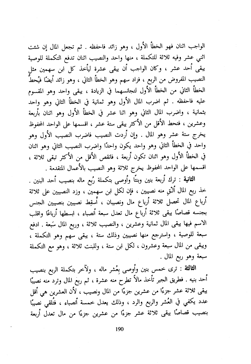 الْوَاجِبِ اثْنَانِ فَهُوَ الْخَطَأُ الْأَوَّلُ وَهُوَ زَائِدٌ فَاحْفَظْهُ ثُمَّ تَجْعَلُ الْمَالَ إِنْ شِئْتَ اثْنَيْ عَشَرَ وَفِيهِ ثَلَاثَةٌ لِلتَّكْمِلَةِ مِنْهَا وَاحِدٌ وَالنَّصِيبُ اثْنَانِ تَدْفَعُ التَّكْمِلَةَ لِلْوَصِيَّةِ يَبْقَى أَحَدَ عَشَرَ وَكَانَ الْوَاجِبُ أَنْ يَبْقَى عَشَرَةٌ لِيَأْخُذَ كُلُّ ابْنٍ سَهْمَيْنِ مِثْلَ النَّصِيبِ الْمَفْرُوضِ مِنَ الرُّبُعِ فَزَادَ سَهْمٌ وَهُوَ الْخَطَأُ الثَّانِي وَهُوَ زَائِدٌ أَيْضًا فَيُحَطُّ الْخَطَأُ الثَّانِي مِنَ الْخَطَأِ الْأَوَّلِ لِتَجَانُسِهِمَا فِي الزِّيَادَةِ يَبْقَى وَاحِدٌ وَهُوَ الْمَقْسُومُ عَلَيْهِ فَاحْفَظْهُ ثُمَّ اضْرِبِ الْمَالَ الْأَوَّلَ وَهُوَ ثَمَانِيَةٌ فِي الْخَطَأِ الثَّانِي وَهُوَ وَاحِدٌ بِثَمَانِيَةٍ وَاضْرِبِ الْمَالَ الثَّانِيَ وَهُوَ اثْنَا عَشَرَ فِي الْخَطَأِ الْأَوَّلِ وَهُوَ اثْنَانِ بِأَرْبَعَةٍ وَعِشْرِينَ فَتَحُطُّ الْأَقَل من الْأَكْثَر يبْقى سِتَّة عشر اقسمها عَلَى الْوَاحِدِ الْمَحْفُوظِ يَخْرُجُ سِتَّةَ عَشَرَ وَهُوَ الْمَالُ وَإِنْ أَرَدْتَ النَّصِيبَ فَاضْرِبِ النَّصِيبَ الْأَوَّلَ وَهُوَ وَاحِدٌ فِي الْخَطَأِ الثَّانِي وَهُوَ وَاحِدٌ يَكُونُ وَاحِدًا وَاضْرِبِ النَّصِيبَ الثَّانِيَ وَهُوَ اثْنَانِ فِي الْخَطَأِ الْأَوَّلِ وَهُوَ اثْنَانِ تَكُونُ أَرْبَعَةً فَانْقُصِ الْأَقَلَّ مِنَ الْأَكْثَرِ تَبْقَى ثَلَاثَةٌ اقْسِمْهَا عَلَى الْوَاحِدِ الْمَحْفُوظِ يَخْرُجُ ثَلَاثَةٌ وَهُوَ النَّصِيبُ بِالْأَعْمَالِ الْمُتَقَدِّمَةِ الثَّانِيَةُ تَرَكَ أَرْبَعَةَ بَنِينَ وَبِنْتًا وَأَوْصَى بِتَكْمِلَةِ رُبُعِ مَالِهِ بِنَصِيبِ أَحَدِ الْبَنِينَ خُذْ رُبُعَ الْمَالِ أَلْقِ مِنْهُ نَصِيبَيْنِ فَإِنَّ لِكُلِّ ابْنٍ سَهْمَيْنِ وَزِدِ النَّصِيبَيْنِ عَلَى ثَلَاثَةِ أَرْبَاعِ الْمَالِ تَحْصُلُ ثَلَاثَةُ أَرْبَاعِ مَالٍ وَنَصِيبَانِ أَسْقِطْ نَصِيبَيْنِ بِنَصِيبَيْنِ الْجِنْسَ بِجِنْسِهِ قِصَاصًا يَبْقَى ثَلَاثَةُ أَرْبَاعِ مَالٍ تَعْدِلُ سَبْعَةَ أَنْصِبَاءَ ابْسُطْهَا أَرْبَاعًا وَاقْلِبْ الِاسْمَ فِيهَا يَبْقَى الْمَالُ ثَمَانِيَةً وَعِشْرِينَ وَالنَّصِيبُ ثَلَاثَةً وَرُبُعُ الْمَالِ سَبْعَةً ادْفَعْ سَبْعَةً لِلْوَصِيَّةِ وَاسْتَرْجِعْ مِنْهَا نَصِيبَيْنِ وَذَلِكَ سِتَّةٌ يَبْقَى سَهْمٌ وَهُوَ التَّكْمِلَةُ وَيَبْقَى مِنَ الْمَالِ سَبْعَةٌ وَعِشْرُونَ لِكُلِّ ابْنٍ سِتَّةٌ وَلِلْبِنْتِ ثَلَاثَةٌ وَهُوَ مَعَ التَّكْمِلَةِ سَبْعَةٌ وَهُوَ رُبُعُ الْمَالِ الثَّالِثَة ترى خمس بَنِينَ وَأَوْصَى بِعُشْرِ مَالِهِ وَلِآخَرَ بِتَكْمِلَةِ الرُّبُعِ بِنَصِيبِ أَحَدِ بَنِيهِ فَطَرِيقُ الْجَبْرِ تَأْخُذُ مَالًا تَطْرَحُ مِنْهُ عَشَرَةً ثُمَّ رُبُعَ الْمَالِ وَتَرُدُّ مِنْهُ نَصِيبًا يَبْقَى ثَلَاثَةَ عَشَرَ جُزْءًا مِنْ عِشْرِينَ جُزْءًا مِنَ الْمَالِ وَنَصِيبٌ لِأَنَّ الْعِشْرِينَ هِيَ أَقَلُّ عَدَدٍ يَكْفِي فِي الْعُشْرِ وَالرُّبُعِ وَالرَّدِّ وَذَلِكَ يَعْدِلُ خَمْسَةَ أَنْصِبَاءَ فَتُلْقِي نَصِيبًا بِنَصِيبٍ قِصَاصًا يَبْقَى ثَلَاثَةَ عَشَرَ جُزْءًا مِنْ عِشْرِينَ جُزْءًا مِنْ مَالٍ تَعْدِلُ أَرْبَعَةَ