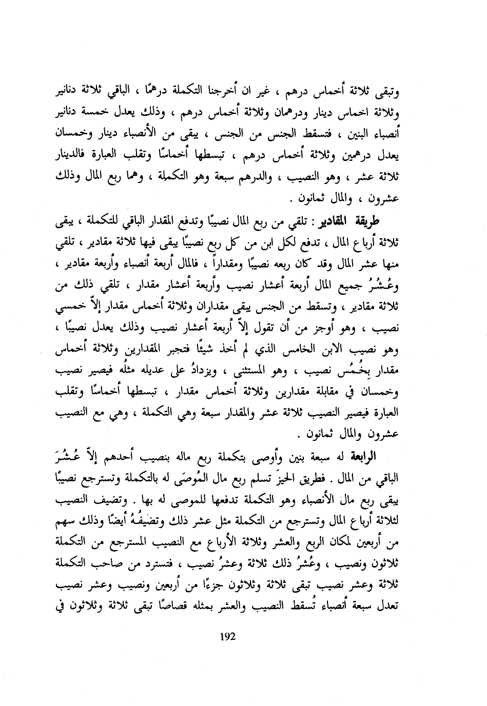 وَتبقى ثَلَاثَة أَخْمَاس دِرْهَم غير أَن أَخْرَجْنَا التَّكْمِلَةَ دِرْهَمًا الْبَاقِي ثَلَاثَةُ دَنَانِيرَ وَثَلَاثَةُ أَخْمَاس دِينَار ودرهمان وَثَلَاثَة أَخْمَاس دِرْهَم وَذَلِكَ يعدل خَمْسَة دَنَانِير أَنْصِبَاءَ الْبَنِينَ فَتُسْقِطُ الْجِنْسَ مِنَ الْجِنْسِ يَبْقَى مِنَ الْأَنْصِبَاءِ دِينَارٌ وَخُمُسَانِ يَعْدِلُ درهمن وَثَلَاثَةَ أَخْمَاسِ دِرْهَمٍ تَبْسُطُهَا أَخْمَاسًا وَتَقْلِبُ الْعِبَارَةَ فَالدِّينَارُ ثَلَاثَةَ عَشَرَ وَهُوَ النَّصِيبُ وَالدِّرْهَمُ سَبْعَةٌ وَهُوَ التكملة وهما رُبُعُ الْمَالِ وَذَلِكَ عِشْرُونَ وَالْمَالُ ثَمَانُونَ طَرِيقَةُ الْمَقَادِيرِ تُلْقِي مِنْ رُبُعِ الْمَالِ نَصِيبًا وَتَدْفَعُ الْمِقْدَارَ الْبَاقِيَ لِلتَّكْمِلَةِ يَبْقَى ثَلَاثَةُ أَرْبَاعِ الْمَالِ تَدْفَعُ لِكُلِّ ابْنٍ مِنْ كُلِّ رُبُعٍ نَصِيبًا يَبْقَى فِيهَا ثَلَاثَةُ مَقَادِيرَ تُلْقِي مِنْهَا عُشْرَ الْمَالِ وَقَدْ كَانَ رُبُعُهُ نَصِيبًا وَمِقْدَارًا فَالْمَالُ أَرْبَعَةُ أَنْصِبَاءَ وَأَرْبَعَةُ مَقَادِيرَ وَعُشْرُ جَمِيعِ الْمَالِ أَرْبَعَةُ أَعْشَارِ نَصِيبٍ وَأَرْبَعَةُ أَعْشَارِ مِقْدَارٍ تُلْقِي ذَلِكَ مِنْ ثَلَاثَةِ مَقَادِيرَ وَتُسْقِطُ مِنَ الْجِنْسِ يَبْقَى مِقْدَارَانِ وَثَلَاثَةُ أَخْمَاسِ مِقْدَارٍ إِلَّا خُمُسَيْ نَصِيبٍ وَهُوَ أَوْجَزُ مِنْ أَنْ تَقُولَ إِلَّا أَرْبَعَةَ أَعْشَارِ نَصِيبٍ وَذَلِكَ يَعْدِلُ نَصِيبًا وَهُوَ نصيب الابْن الْخَامِس الَّذِي لم أَخذ شَيْئًا فَتَجْبُرُ الْمِقْدَارَيْنِ وَثَلَاثَةَ أَخْمَاسِ مِقْدَارٍ بِخُمُسِ نَصِيبٍ وَهُوَ الْمُسْتَثْنَى وَيَزْدَادُ عَلَى عَدِيلِهِ مِثْلُهُ فَيصير نصيب وخمسان فِي مُقَابَلَةِ مِقْدَارَيْنِ وَثَلَاثَةِ أَخْمَاسِ مِقْدَارٍ تَبْسُطُهَا أَخْمَاسًا وَتَقْلِبُ الْعِبَارَةَ فَيَصِيرُ النَّصِيبُ ثَلَاثَةَ عَشَرَ والمقدار سَبْعَة وَهِي التَّكْمِلَةُ وَهِيَ مَعَ النَّصِيبِ عِشْرُونَ وَالْمَالُ ثَمَانُونَ الرَّابِعَةُ لَهُ سَبْعَةُ بَنِينَ وَأَوْصَى بِتَكْمِلَةِ رُبُعِ مَالِهِ بِنَصِيبِ أَحَدِهِمْ إِلَّا عُشْرَ الْبَاقِي مِنَ الْمَالِ فَطَرِيقُ الْحَيِّزِ تُسَلِّمُ رُبُعَ مَالِ الْمُوصَي لَهُ بِالتَّكْمِلَةِ وَتَسْتَرْجِعُ نَصِيبًا يَبْقَى رُبُعُ مَالِ الْأَنْصِبَاءِ وَهُوَ التَّكْمِلَةُ تَدْفَعُهَا لِلْمُوصَي لَهُ بِهَا وَتُضِيفُ النَّصِيبَ لِثَلَاثَةِ أَرْبَاعِ الْمَالِ وَتَسْتَرْجِعُ مِنَ التَّكْمِلَةِ مِثْلَ عُشْرِ ذَلِكَ وَتُضِيفُهُ أَيْضًا وَذَلِكَ سَهْمٌ مِنْ أَرْبَعِينَ لِمَكَانِ الرُّبُعِ وَالْعُشْرِ وَثَلَاثَةِ الْأَرْبَاعِ مَعَ النَّصِيبِ الْمُسْتَرْجَعِ مِنَ التَّكْمِلَةِ ثَلَاثُونَ وَنَصِيبٌ وَعُشْرُ ذَلِكَ ثَلَاثَةٌ وَعُشْرُ نَصِيبٍ فَتَسْتَرِدُّ مِنْ صَاحِبِ التَّكْمِلَةِ ثَلَاثَةً وَعُشْرَ نَصِيبٍ تَبْقَى ثَلَاثَةٌ وَثَلَاثُونَ جُزْءًا مِنْ أَرْبَعِينَ وَنَصِيبٌ وَعُشْرُ نَصِيبٍ تَعْدِلُ سَبْعَةَ أَنْصِبَاءَ تُسْقِطُ النَّصِيبَ وَالْعُشْرَ بِمِثْلِهِ قِصَاصًا تَبْقَى ثَلَاثَةٌ وَثَلَاثُونَ فِي
