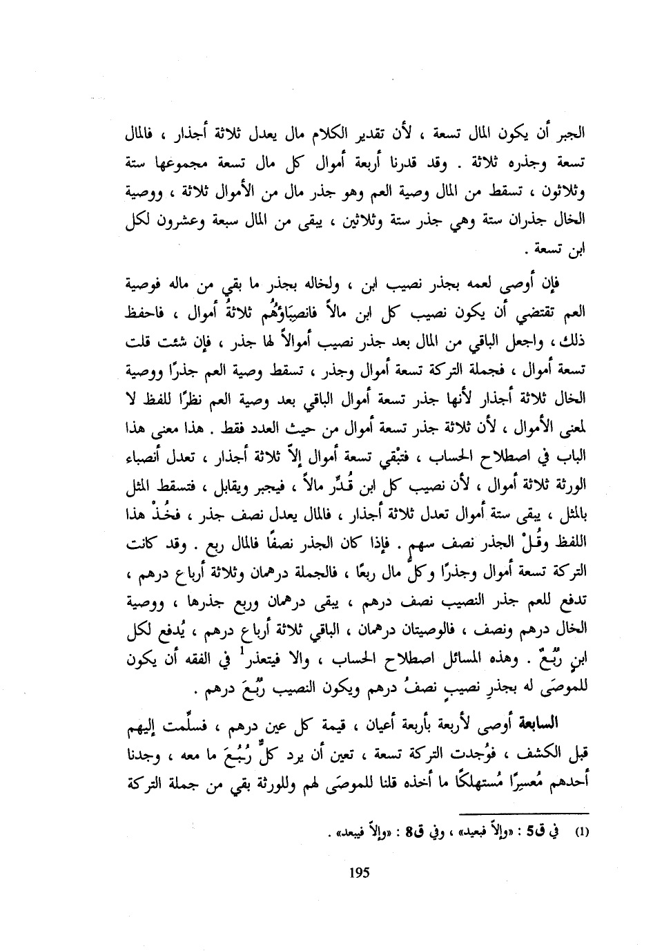 الْجَبْرِ أَنْ يَكُونَ الْمَالُ تِسْعَةً لِأَنَّ تَقْدِيرَ الْكَلَامِ مَالٌ يَعْدِلُ ثَلَاثَةَ أَجْذَارٍ فَالْمَالُ تِسْعَةٌ وَجَذْرُهُ ثَلَاثَةٌ وَقَدْ قَدَّرْنَا أَرْبَعَةَ أَمْوَالٍ كُلُّ مَالٍ تِسْعَةٌ مَجْمُوعُهَا سِتَّةٌ وَثَلَاثُونَ تُسْقِطُ مِنَ الْمَالِ وَصِيَّةَ الْعَمِّ وَهُوَ جَذْرُ مَالٍ مِنَ الْأَمْوَالِ ثَلَاثَةٌ وَوَصِيَّةُ الْخَالِ جِذْرَانِ سِتَّةٌ وَهِيَ جَذْرُ سِتَّةٍ وَثَلَاثِينَ يَبْقَى مِنَ الْمَالِ سَبْعَةٌ وَعِشْرُونَ لِكُلِّ ابْنٍ تِسْعَةٌ فَإِنْ أَوْصَى لِعَمِّهِ بِجذرِ نَصِيبِ ابْنٍ وَلِخَالِهِ بِجَذْرِ مَا بَقِيَ مِنْ مَالِهِ فَوَصِيَّةُ الْعَمِّ تَقْتَضِي أَنْ يَكُونَ نَصِيبُ كُلِّ ابْنٍ مَالًا فَأَنْصِبَاؤُهُمْ ثَلَاثَةُ أَمْوَالٍ فَاحْفَظْ ذَلِكَ وَاجْعَلِ الْبَاقِيَ مِنَ الْمَالِ بَعْدَ جَذْرِ نَصِيبٍ أَمْوَالًا لَهَا جِذْرٌ فَإِنْ شِئْتَ قُلْتَ تِسْعَةَ أَمْوَالٍ فَجُمْلَةُ التَّرِكَةِ تِسْعَةُ أَمْوَالٍ وَجِذْرٌ تُسْقِطُ وَصِيَّةَ الْعَمِّ جِذْرًا وَوَصِيَّةَ الْخَالِ ثَلَاثَة أجذار لِأَنَّهَا جذر سَعَة أَمْوَالِ الْبَاقِي بَعْدَ وَصِيَّةِ الْعَمِّ نَظَرًا لِلَّفْظِ لَا لِمَعْنَى الْأَمْوَالِ لِأَنَّ ثَلَاثَةَ جَذْرُ تِسْعَةِ أَمْوَالٍ مِنْ حَيْثُ الْعَدَدِ فَقَطْ هَذَا مَعْنَى هَذَا الْبَابِ فِي اصْطِلَاحِ الْحِسَابِ فَتَبْقَى تِسْعَةُ أَمْوَالٍ إِلَّا ثَلَاثَةَ أَجْذَارٍ تَعْدِلُ أَنْصِبَاءُ الْوَرَثَةِ ثَلَاثَةَ أَمْوَالٍ لِأَنَّ نَصِيبَ كُلِّ ابْنٍ قُدِّرَ مَالًا فَيُجْبَرُ وَيُقَابَلُ فَتُسْقِطُ الْمِثْلَ بِالْمِثْلِ يَبْقَى سِتَّةُ أَمْوَالٍ تَعْدِلُ ثَلَاثَةَ أَجْذَارٍ فَالْمَالُ يَعْدِلُ نِصْفَ جِذْرٍ فَخُذْ هَذَا اللَّفْظَ وَقُلِ الْجَذْرُ نِصْفَ سَهْمٍ فَإِذَا كَانَ الْجَذْرُ نِصْفًا فَالْمَالُ رُبُعٌ وَقَدْ كَانَتِ التَّرِكَةُ تِسْعَةَ أَمْوَالٍ وَجِذْرًا وَكُلُّ مَالٍ رُبُعًا فَالْجُمْلَةُ دِرْهَمَانِ وَثَلَاثَةُ أَرْبَاعِ درهما تَدْفَعُ لِلْعَمِّ جَذْرَ النَّصِيبِ نِصْفَ دِرْهَمٍ يَبْقَى درهما وَرُبُعٌ جَذْرُهَا وَوَصِيَّةُ الْخَالِ دِرْهَمٌ وَنِصْفٌ فَالْوَصِيَّتَانِ دِرْهَمَانِ الْبَاقِي ثَلَاثَةُ أَرْبَاعِ دِرْهَمٍ يُدْفَعُ لِكُلِّ ابْنٍ رُبُعٌ وَهَذِهِ الْمَسَائِلُ اصْطِلَاحُ الْحِسَابِ وَإِلَّا فَيَتَعَذَّرُ فِي الْفِقْهِ أَنْ يَكُونَ لِلْمُوصَى لَهُ بِجَذْرِ نَصِيبٍ نِصْفُ دِرْهَمٍ وَيَكُونُ النَّصِيبُ رُبُعَ دِرْهَم السَّابِعَة أوصى لأربعة بأَرْبعَة أعينا قِيمَةُ كُلِّ عَيْنٍ دِرْهَمٌ فَسُلِّمَتْ إِلَيْهِمْ قَبْلَ الْكَشْفِ فَوُجِدَتِ التَّرِكَةُ تِسْعَةً تَعَيَّنَ أَنْ يَرُدَّ كُلٌّ رُبُعَ مَا مَعَهُ وَجَدْنَا أَحَدَهُمْ مُعْسِرًا مُسْتَهْلِكًا مَا أَخَذَهُ قُلْنَا لِلْمُوصَى لَهُمْ وَلِلْوَرَثَةِ بَقِيَ مِنْ جُمْلَةِ التَّرِكَةِ