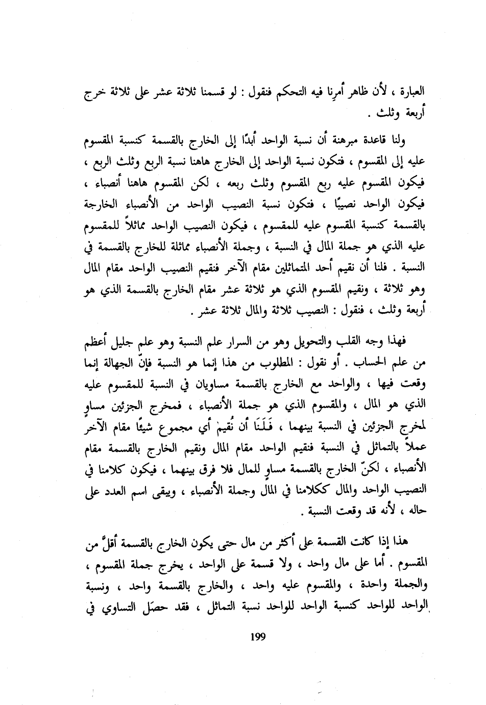 الْعِبَارَةِ لِأَنَّ ظَاهِرَ أَمْرِنَا فِيهِ التَّحَكُّمُ فَنَقُولُ لَوْ قَسَمْنَا ثَلَاثَةَ عَشَرَ عَلَى ثَلَاثَةٍ خَرَجَ أَرْبَعَةٌ وَثُلُثٌ وَلَنَا قَاعِدَةٌ مُبَرْهَنَةٌ أَنَّ نِسْبَةَ الْوَاحِدِ أَبَدًا إِلَى الْخَارِجِ بِالْقِسْمَةِ كَنِسْبَةِ الْمَقْسُومِ عَلَيْهِ إِلَى الْمَقْسُومِ فَتَكُونُ نِسْبَةُ الْوَاحِدِ إِلَى الْخَارِجِ هَاهُنَا نِسْبَةَ الرُّبُعِ وَثُلُثِ الرُّبُعِ فَيَكُونُ الْمَقْسُومُ عَلَيْهِ رُبُعَ الْمَقْسُومِ وَثُلُثَ رُبُعِهِ لَكِنَّ الْمَقْسُومَ هَاهُنَا أَنْصِبَاءُ فَيَكُونُ الْوَاحِدُ نَصِيبًا فَتَكُونُ نِسْبَةُ النَّصِيبِ الْوَاحِدِ مِنَ الْأَنْصِبَاءِ الْخَارِجَةِ بِالْقِسْمَةِ كَنِسْبَةِ الْمَقْسُومِ عَلَيْهِ لِلْمَقْسُومِ فَيَكُونُ النَّصِيبُ الْوَاحِدُ مُمَاثِلًا لِلْمَقْسُومِ عَلَيْهِ الَّذِي هُوَ جُمْلَةُ الْمَالِ فِي النِّسْبَةِ وَجُمْلَةُ الْأَنْصِبَاءِ مُمَاثِلَةٌ لِلْخَارِجِ بِالْقِسْمَةِ فِي النِّسْبَة فلنا أَن نُقِيم أحد المتماثلين مقَام الآخر فنقيم النَّصِيب الْوَاحِد مقَام المَال وَهُوَ ثَلَاثَة وَنُقِيم الْمَقْسُومَ الَّذِي هُوَ ثَلَاثَةَ عَشَرَ مَقَامَ الْخَارِجِ بِالْقِسْمَةِ الَّذِي هُوَ أَرْبَعَةٌ وَثُلُثٌ فَنَقُولُ النَّصِيبُ ثَلَاثَةٌ وَالْمَالُ ثَلَاثَةَ عَشَرَ فَهَذَا وَجْهُ الْقَلْبِ والتحويل وَهُوَ من السرَار عِلْمِ النِّسْبَةِ وَهُوَ عِلْمٌ جَلِيلٌ أَعْظَمُ مِنْ عِلْمِ الْحِسَابِ أَوْ نَقُولُ الْمَطْلُوبُ مِنْ هَذَا إِنَّمَا هُوَ النِّسْبَةُ فَإِنَّ الْجَهَالَةَ إِنَّمَا وَقَعَتْ فِيهَا وَالْوَاحد مَعَ الْخَارِج بِالْقِسْمَةِ مساويان فِي النِّسْبَةِ لِلْمَقْسُومِ عَلَيْهِ الَّذِي هُوَ الْمَالُ والمقسوم الَّذِي هُوَ جملَة الْأَنْصِبَاء فمخرج الجزئين مسَاوٍ لمخرج الجزئين فِي النِّسْبَةِ بَيْنَهُمَا فَلَنَا أَنْ نُقِيمَ أَيَّ مَجْمُوع شَيْئا مَقَامَ الْآخَرِ عَمَلًا بِالتَّمَاثُلِ فِي النِّسْبَةِ فَنُقِيمُ الْوَاحِدَ مَقَامَ الْمَالِ وَنُقِيمُ الْخَارِجَ بِالْقِسْمَةِ مَقَامَ الْأَنْصِبَاءِ لَكِنَّ الْخَارِجَ بِالْقِسْمَةِ مُسَاوٍ لِلْمَالِ فَلَا فَرْقَ بَيْنَهُمَا فَيَكُونُ كَلَامُنَا فِي النَّصِيبِ الْوَاحِدِ وَالْمَالِ كَكَلَامِنَا فِي الْمَالِ وَجُمْلَةِ الْأَنْصِبَاءِ وَيَبْقَى اسْمُ الْعَدَدِ عَلَى حَالِهِ لِأَنَّهُ قَدْ وَقَعَتِ النِّسْبَةُ هَذَا إِذَا كَانَتِ الْقِسْمَةُ عَلَى أَكْثَرِ مِنْ مَالٍ حَتَّى يَكُونَ الْخَارِجُ بِالْقِسْمَةِ أَقَلَّ مِنَ الْمَقْسُومِ أَمَّا عَلَى مَالٍ وَاحِدٍ وَلَا قِسْمَةَ عَلَى الْوَاحِدِ يَخْرُجُ جُمْلَةُ الْمَقْسُومِ وَالْجُمْلَةُ وَاحِدَةٌ وَالْمَقْسُومُ عَلَيْهِ وَاحِدٌ وَالْخَارِجُ بِالْقِسْمَةِ وَاحِدٌ وَنسبَة الْوَاحِد للْوَاحِد كنسبة الْوَاحِد نِسْبَةَ التَّمَاثُلِ فَقَدْ حَصَلَ التَّسَاوِي فِي