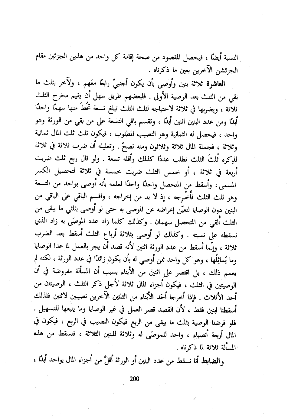 النِّسْبَةِ أَيْضًا فَيَحْصُلُ الْمَقْصُودُ مِنْ صِحَّةِ إِقَامَةِ كل وَاحِد من هذَيْن الجزئين مقَام الجزنشن الآخرين بِعَين مَا ذَكَرْنَاهُ الْعَاشِرَةُ ثَلَاثَةُ بَنِينَ وَأَوْصَى بِأَنْ يَكُونَ أَجْنَبِيٌّ رَابِعًا مَعَهُمْ وَلِآخَرَ بِثُلُثِ مَا بَقِيَ مِنَ الثُّلُثِ بَعْدَ الْوَصِيَّةِ الْأُولَى فَلِبَعْضِهِمْ طَرِيقٌ سَهْلٌ أَنْ يُقِيمَ مَخْرَجَ الثُّلُثِ ثَلَاثَةً وَيَضْرِبَهَا فِي ثَلَاثَةٍ لِاحْتِيَاجِهِ لِثُلُثِ الثُّلُثِ تَبْلُغُ تِسْعَةً تَحُطُّ مِنْهَا سَهْمًا وَاحِدًا أَبَدًا وَمِنْ عَدَدِ الْبَنِينَ اثْنَيْنِ أَبَدًا وَتَقْسِمُ بَاقِيَ التِّسْعَةِ عَلَى مَنْ بَقِيَ مِنَ الْوَرَثَةِ وَهُوَ وَاحِدٌ فَيَحْصُلُ لَهُ الثَّمَانِيَةُ وَهُوَ النَّصِيبُ الْمَطْلُوبُ فَيَكُونُ ثُلُثُ ثُلُثِ الْمَالِ ثَمَانِيَةً وَثَلَاثَةً فَجُمْلَةُ الْمَالِ ثَلَاثَةٌ وَثَلَاثُونَ وَمِنْهُ تَصِحُّ وَتَعْلِيلُهُ أَنَّ ضَرْبَ ثَلَاثَةٍ فِي ثَلَاثَةٍ لِذِكْرِهِ ثُلُثَ الثُّلُثِ تَطَلَّبَ عَدَدًا كَذَلِكَ وَأَقَلُّهُ تِسْعَةٌ وَلَوْ قَالَ رُبُعَ ثُلُثٍ ضَرَبْتَ أَرْبَعَةً فِي ثَلَاثَةٍ أَوْ خُمُسَ الثُّلُث ضربت خَمْسَة فِي ثَلَاثَة لتحصل الْكَسْرِ الْمُسَمَّى وَأَسْقَطَ مِنَ الْمُتَحَصِّلِ وَاحِدًا وَاحِدًا لِعِلْمِهِ بِأَنَّهُ أَوْصَى بِوَاحِدٍ مِنَ التِّسْعَةِ وَهُوَ ثُلُثُ الثُّلُثِ فَأَخْرِجْهُ إِذْ لَا بُدَّ مِنْ إِخْرَاجِهِ وَاقْسِمِ الْبَاقِيَ عَلَى الْبَاقِي مِنَ الْبَنِينَ دُونَ الْوَصَايَا لِتَعَيُّنِ إِعْرَاضِهِ عَنِ الْمُوصَى بِهِ حَتَّى لَوْ أَوْصَى بِثُلُثَيْ مَا يَبْقَى مِنَ الثُّلُث ألقِي مِنَ الْمُتَحَصِّلِ سَهْمَانِ وَكَذَلِكَ كُلَّمَا زَادَ عَدَدُ الْمُوصَى بِهِ زَادَ الَّذِي نُسْقِطُهُ عَلَى نِسْبَتِهِ وَكَذَلِكَ لَوْ أَوْصَى بِثَلَاثَةِ أَرْبَاعِ الثُّلُثِ أَسْقَطَ بَعْدَ الضَّرْبِ ثَلَاثَةً وَإِنَّمَا أَسْقَطَ مِنْ عَدَدِ الْوَرَثَة اثْنَيْنِ لِأَنَّهُ قصد أَن يجر بِالْعَمَلِ لِمَا عَدَا الْوَصَايَا وَمَا يُمَاثِلُهَا وَهُوَ كُلُّ وَاحِدٍ مِمَّنْ أُوصِيَ لَهُ بِأَنْ يَكُونَ زَائِدًا فِي عَدَدِ الْوَرَثَةِ لَكِنَّهُ لَمْ يُعَمِّمْ ذَلِكَ بَلِ اقْتَصَرَ عَلَى اثْنَيْنِ مِنَ الْأَبْنَاءِ بِسَبَبِ أَنَّ الْمَسْأَلَةَ مَفْرُوضَةٌ فِي أَنَّ الْوَصِيَّتَيْنِ فِي الثُّلُثِ فَيَكُونُ أَجْزَاءُ الْمَالِ ثَلَاثَةً لِأَجْلِ ذِكْرِ الثُّلُث الوصيتان مِنْ أَحَدِ الْأَثْلَاثِ فَإِذَا أَخْرَجَا أَحَدَ الْأَبْنَاءِ مِنَ الثُّلُثَيْنِ الْآخَرَيْنِ نَصِيبَيْنِ لِاثْنَيْنِ فَلِذَلِكَ أَسْقَطْنَا ابْنَيْنِ فَقَطْ لِأَنَّ الْقَصْدَ قَصْرُ الْعَمَلِ فِي غير الْوَصَايَا وَمَا يتتبعها لِلتَّسْهِيلِ فَلَوْ فَرَضْنَا الْوَصِيَّةَ بِثُلُثِ مَا يَبْقَى مِنَ الرُّبُعِ فَيَكُونُ النَّصِيبُ فِي الرُّبُعِ فَيَكُونُ فِي الْمَالِ أَرْبَعَةُ أَنْصِبَاءَ وَاحِدٌ لِلْمُوصَى لَهُ وَثَلَاثَةٌ لِلْبَنِينَ الثَّلَاثَةِ فَتُسْقِطُ مِنْ هَذِهِ الْمَسْأَلَةِ ثَلَاثَةً لِمَا ذَكَرْنَاهُ وَالضَّابِطُ أَنَّا نُسْقِطُ مِنْ عَدَدِ الْبَنِينَ أَوِ الْوَرَثَةِ أَقَلَّ مِنْ أَجْزَاءِ الْمَالِ بِوَاحِدٍ أَبَدًا