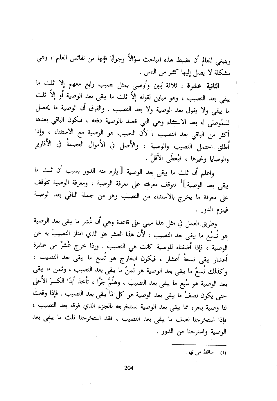 وَيَنْبَغِي لِلْعَالِمِ أَنْ يَضْبِطَ هَذِهِ الْمَبَاحِثَ سُؤَالًا وَجَوَابًا فَإِنَّهَا مِنْ نَفَائِسِ الْعِلْمِ وَهِيَ مُشْكِلَةٌ لَا يَصِلُ إِلَيْهَا كَثِيرٌ مِنَ النَّاسِ الثَّانِيَةَ عَشْرَةَ ثَلَاثَةُ بَنِينَ وَأَوْصَى بِمِثْلِ نَصِيبِ رَابِعٍ مَعَهُمْ إِلَّا ثُلُثَ مَا يَبْقَى بَعْدَ النَّصِيبِ وَهُوَ مُبَايِنٌ لِقَوْلِهِ إِلَّا ثُلُثَ مَا يَبْقَى بَعْدَ الْوَصِيَّةِ أَوْ إِلَّا ثُلُثَ مَا يَبْقَى وَلَا يَقُولُ بَعْدَ الْوَصِيَّةِ وَلَا بَعْدَ النَّصِيبِ وَالْفَرْقُ أَنَّ الْوَصِيَّةَ مَا يَحْصُلُ لِلْمُوصَى لَهُ بَعْدَ الِاسْتِثْنَاءِ وَهِيَ الَّتِي قَصَدَ بِالْوَصِيَّةِ دَفْعَهُ فَيَكُونُ الْبَاقِي بَعْدَهَا أَكْثَرَ مِنَ الْبَاقِي بَعْدَ النَّصِيبِ لِأَنَّ النَّصِيبَ هُوَ الْوَصِيَّةُ مَعَ الِاسْتِثْنَاءِ وَإِذَا أُطْلِقَ احْتَمَلَ النَّصِيبَ وَالْوَصِيَّةَ وَالْأَصْلُ فِي الْأَمْوَالِ الْعِصْمَةُ فِي الْأَقَارِيرِ وَالْوَصَايَا وَغَيْرِهَا فَيُعْطَى الْأَقَلَّ وَاعْلَمْ أَنَّ ثُلُثَ مَا يَبْقَى بَعْدَ الْوَصِيَّةِ يَلْزَمُ مِنْهُ الدَّوْرُ بِسَبَبِ أَنَّ ثُلُثَ مَا يَبْقَى بَعْدَ الْوَصِيَّةِ تَتَوَقَّفُ مَعْرِفَتُهُ عَلَى مَعْرِفَةِ الْوَصِيَّةِ وَمَعْرِفَةُ الْوَصِيَّةِ تَتَوَقَّفُ عَلَى مَعْرِفَةِ مَا يَخْرُجُ بِالِاسْتِثْنَاءِ مِنَ النَّصِيبِ وَهُوَ مِنْ جُمْلَةِ الْبَاقِي بَعْدَ الْوَصِيَّةِ فَيَلْزَمُ الدَّوْرُ وَطَرِيقُ الْعَمَلِ فِي مِثْلِ هَذَا مَبْنِيٌّ عَلَى قَاعِدَةٍ وَهِيَ أَنَّ عُشْرَ مَا يَبْقَى بَعْدَ الْوَصِيَّةِ هُوَ تُسْعُ مَا يَبْقَى بَعْدَ النَّصِيبِ لِأَنَّ هَذَا الْعُشْرَ هُوَ الَّذِي امْتَازَ النَّصِيبُ بِهِ عَنِ الْوَصِيَّةِ فَإِذَا أَضَفْنَاه لِلْوَصِيَّةِ كَانَتْ هِيَ النَّصِيبَ وَإِذَا خَرَجَ عُشْرٌ مِنْ عَشَرَةِ أَعْشَارٍ يَبْقَى تِسْعَةُ أَعْشَارٍ فَيَكُونُ الْخَارِجُ هُوَ تُسْعُ مَا يَبْقَى بَعْدَ النَّصِيبِ وَكَذَلِكَ تُسْعُ مَا يَبْقَى بَعْدَ الْوَصِيَّةِ هُوَ ثُمْنُ مَا يَبْقَى بَعْدَ النَّصِيبِ وَثُمْنُ مَا يَبْقَى بَعْدَ الْوَصِيَّةِ هُوَ سُبُعُ مَا يَبْقَى بَعْدَ النَّصِيبِ وَهَلُمَّ جَرَّا تَأْخُذُ أَبَدًا الْكَسْرَ الْأَعْلَى حَتَّى يَكُونَ نِصْفُ مَا يَبْقَى بَعْدَ الْوَصِيَّةِ هُوَ كُلُّ مَا يَبْقَى بَعْدَ النَّصِيبِ فَإِذَا وَقَعَتْ لَنَا وَصِيَّةٌ بِجُزْءٍ مِمَّا يَبْقَى بَعْدَ الْوَصِيَّةِ نَسْتَخْرِجُهُ بِالْجُزْءِ الَّذِي فَوْقَهُ بَعْدَ النَّصِيبِ فَإِذَا اسْتَخْرَجْنَا نِصْفَ مَا يَبْقَى بَعْدَ النَّصِيبِ فَقَدِ اسْتَخْرَجْنَا ثُلُثَ مَا يَبْقَى بَعْدَ الْوَصِيَّةِ وَاسْتَرَحْنَا مِنَ الدّور