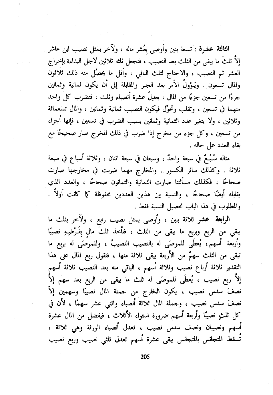 الثَّالِثَةَ عَشْرَةَ تِسْعَةُ بَنِينَ وَأَوْصَى بِعُشْرِ مَالِهِ وَلِآخَرَ بِمِثْلِ نَصِيبِ ابْنٍ عَاشِرٍ إِلَّا ثُلُثَ مَا يَبْقَى مِنَ الثُّلُثِ بَعْدَ النَّصِيبِ فَتَجْعَلُ ثُلُثَهُ ثَلَاثِينَ لِأَجْلِ الْبَدَاءَةِ بِإِخْرَاجِ الْعُشْرِ ثُمَّ النَّصِيب والاحتاج لِثُلُثِ الْبَاقِي وَأَقَلُّ مَا يَحْصُلُ مِنْهُ ذَلِكَ ثَلَاثُونَ وَالْمَال تسعون ويؤول الْأَمْرُ بَعْدَ الْجَبْرِ وَالْمُقَابَلَةِ إِلَى أَنْ يَكُونَ ثَمَانِيَةً وَثَمَانِينَ جُزْءًا مِنْ تِسْعِينَ جُزْءًا مِنَ المَال يعدل عشرَة أنصباء وَثلث فَتَضْرِبُ كُلَّ وَاحِدٍ مِنْهُمَا فِي تِسْعِينَ وَتَقْلِبُ وَتُحَوِّلُ فَيَكُونُ النَّصِيبُ ثَمَانِيَةً وَثَمَانِينَ وَالْمَالُ تِسْعَمِائَةٍ وَثَلَاثِينَ وَلَا يَتَغَيَّرُ عَدَدُ الثَّمَانِيَةِ وَثَمَانِينَ بِسَبَبِ الضَّرْبِ فِي تِسْعِينَ فَإِنَّهَا أَجْزَاءٌ مِنْ تِسْعِينَ وَكُلُّ جُزْءٍ مِنْ مَخْرَجٍ إِذَا ضُرِبَ فِي ذَلِكَ الْمَخْرَجِ صَارَ صَحِيحًا مَعَ بَقَاءِ الْعَدَدِ عَلَى حَالِهِ مِثَالُهُ سُبُعٌ فِي سَبْعَةٍ وَاحِدٌ وَسُبُعَانِ فِي سَبْعَةٍ اثْنَانِ وَثَلَاثَةُ أَسْبَاعٍ فِي سَبْعَةٍ ثَلَاثَةٌ وَكَذَلِكَ سَائِرُ الْكُسُورِ وَالْمَخَارِجُ مَهْمَا ضُرِبَتْ فِي مَخَارِجِهَا صَارَتْ صِحَاحًا فَكَذَلِكَ مَسْأَلَتُنَا صَارَتِ الثَّمَانِيَةُ وَالثَمَانُونَ صِحَاحًا وَالْعَدَدُ الَّذِي يُقَابِلُهُ أَيْضًا صِحَاحًا وَالنِّسْبَةُ بَيْنَ هَذَيْنِ الْعَدَدَيْنِ مَحْفُوظَةٌ كَمَا كَانَتْ أَوَّلًا وَالْمَطْلُوبُ فِي هَذَا الْبَابِ تَحْصِيل النِّسْبَة فَقَط الرَّابِعَة عشر ثَلَاثَةُ بَنِينَ وَأَوْصَى بِمِثْلِ نَصِيبِ رَابِعٍ وَلِآخَرَ بِثُلُثِ مَا يَبْقَى مِنَ الرُّبُعِ وَبِرُبُعِ مَا يَبْقَى مِنَ الثُّلُثِ فَنَأْخُذُ ثُلُثَ مَالٍ بِفَرْضِهِ نَصِيبًا وَأَرْبَعَةَ أَسْهُمٍ يُعْطَى لِلْمُوصَى لَهُ بِالنَّصِيبِ النَّصِيبُ وَلِلْمُوصَى لَهُ بِرُبُعِ مَا تَبَقَّى مِنَ الثُّلُثِ سَهْمٌ مِنَ الْأَرْبَعَةِ يَبْقَى ثَلَاثَةٌ مِنْهَا فَنَقُولُ رُبُعُ الْمَالِ عَلَى هَذَا التَّقْدِيرِ ثَلَاثَةُ أَرْبَاعِ نَصِيبٍ وَثَلَاثَةُ أَسْهُمٍ الْبَاقِي مِنْهُ بَعْدَ النَّصِيبِ ثَلَاثَةُ أَسْهُمٍ إِلَّا رُبُعَ نَصِيبٍ يُعْطَى لِلْمُوصَى لَهُ ثُلُثَ مَا يَبْقََى مِنَ الرُّبُعِ بَعْدَ سَهْمٍ إِلَّا نِصْفَ سُدُسِ نَصِيبٍ يَكُونُ الْخَارِجُ مِنْ جُمْلَةِ الْمَالِ نَصِيبًا وَسَهْمَيْنِ إِلَّا نِصْفَ سُدْسِ نَصِيبٍ وَجُمْلَةُ الْمَالِ ثَلَاثَةُ أَنْصِبَاءَ وَاثْنَيْ عَشَرَ سَهْمًا لِأَنَّ فِي كُلِّ ثُلُثٍ نَصِيبًا وَأَرْبَعَةَ أَسْهُمٍ ضَرُورَةَ اسْتِوَاءِ الْأَثْلَاثِ فَيَفْضُلُ مِنَ الْمَالِ عَشَرَةُ أَسْهُمٍ وَنَصِيبَانِ وَنِصْفُ سُدْسِ نَصِيبٍ تَعْدِلُ أَنْصِبَاءَ الْوَرَثَةِ وَهِيَ ثَلَاثَةٌ تُسْقِطُ الْمُتَجَانِسَ بِالْمُتَجَانِسِ يَبْقَى عَشَرَةُ أَسْهُمٍ تَعْدِلُ ثُلُثَيْ نَصِيبٍ وَرُبُعَ نَصِيبٍ