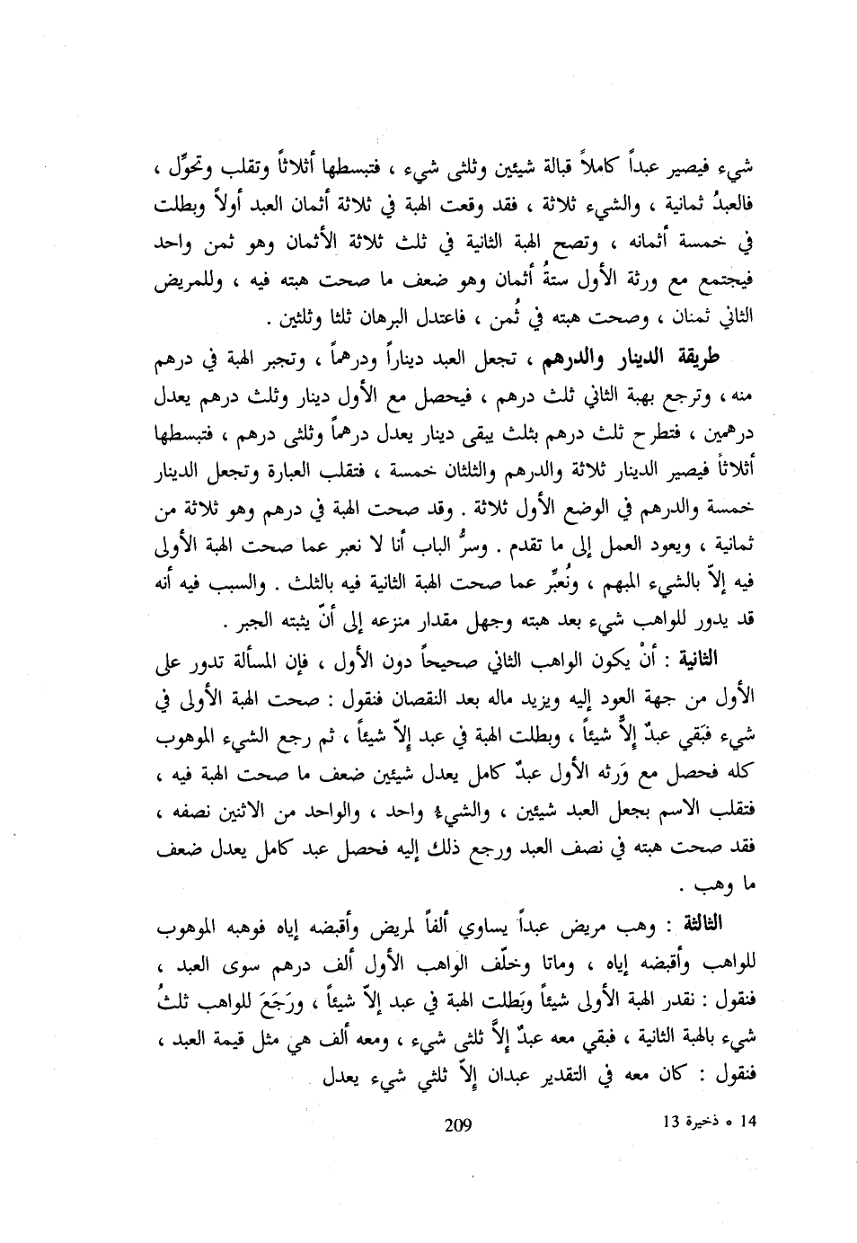 شَيْء فَيصير عبدا كَامِلا قُبَالَةَ شَيْئَيْنِ وَثُلُثَيْ شَيْءٍ فَتَبْسُطُهَا أَثْلَاثًا وَتَقْلِبُ وَتُحَوِّلُ فَالْعَبْدُ ثَمَانِيَةٌ وَالشَّيْءُ ثَلَاثَةٌ فَقَدْ وَقَعَتِ الْهِبَةُ فِي ثَلَاثَةِ أَثْمَانِ الْعَبْدِ أَوَّلًا وَبَطَلَتْ فِي خَمْسَةِ أَثْمَانِهِ وَتَصِحُّ الْهِبَةُ الثَّانِيَةُ فِي ثُلُثِ ثَلَاثَةِ الْأَثْمَانِ وَهُوَ ثُمْنٌ وَاحِدٌ فَيَجْتَمِعُ مَعَ وَرَثَةِ الْأَوَّلِ سِتَّةُ أَثْمَانٍ وَهُوَ ضِعْفُ مَا صحت هِبته فِيهِ وللمريض الثَّانِي ثَمَان وَصَحَّتْ هِبَتُهُ فِي ثُمُنٍ فَاعْتَدَلَ الْبُرْهَانُ ثُلُثًا وَثُلُثَيْنِ طَرِيقَةُ الدِّينَارِ وَالدِّرْهَمِ تَجْعَلُ الْعَبْدَ دِينَارًا وَدِرْهَمًا وَتَجْبُرُ الْهِبَةَ فِي دِرْهَمٍ مِنْهُ وَتَرْجِعُ بِهِبَةِ الثَّانِي ثُلُثَ دِرْهَمٍ فَيَحْصُلُ مَعَ الْأَوَّلِ دِينَارٌ وَثُلُثُ دِرْهَمٍ يَعْدِلُ دِرْهَمَيْنِ فَتَطْرَحُ ثُلُثَ دِرْهَمٍ بِثُلُثٍ يَبْقَى دِينَارٌ يَعْدِلُ دِرْهَمًا وَثُلُثَيْ دِرْهَمٍ فَتَبْسُطُهَا أَثْلَاثًا فَيَصِيرُ الدِّينَارُ ثَلَاثَةً وَالدِّرْهَمُ وَالثُّلُثَانِ خَمْسَةً فَتَقْلِبُ الْعِبَارَةَ وَتَجْعَلُ الدِّينَارَ خَمْسَةً وَالدِّرْهَمَ فِي الْوَضْعِ الْأَوَّلِ ثَلَاثَةً وَقَدْ صَحَّتِ الْهِبَةُ فِي دِرْهَمٍ وَهُوَ ثَلَاثَةٌ مِنْ ثَمَانِيَةٍ وَيَعُودُ الْعَمَلُ إِلَى مَا تَقَدَّمَ وَسِرُّ الْبَابِ أَنَّا لَا نُعَبِّرُ عَمَّا صَحَّتِ الْهِبَةُ الْأُولَى فِيهِ إِلَّا بِالشَّيْءِ الْمُبْهَمِ وَنُعَبِّرُ عَمَّا صَحَّتِ الْهِبَةُ الثَّانِيَةُ فِيهِ بِالثُّلُثِ وَالسَّبَبُ فِيهِ أَنَّهُ قَدْ يَدُورُ لِلْوَاهِبِ شَيْءٌ بَعْدَ هِبَتِهِ وَجُهِلَ مِقْدَارُ مَنْزَعِهِ إِلَى أَنْ يُثْبِتَهُ الْجَبْرُ الثَّانِيَةُ أَنْ يَكُونَ الْوَاهِبُ الثَّانِي صَحِيحًا دُونَ الْأَوَّلِ فَإِنَّ الْمَسْأَلَةَ تَدُورُ عَلَى الْأَوَّلِ مِنْ جِهَةِ الْعَوْدِ إِلَيْهِ وَيَزِيدُ مَالُهُ بَعْدَ النُّقْصَانِ فَنَقُولُ صَحَّتِ الْهِبَةُ الْأُولَى فِي شَيْءٍ فَبَقِيَ عَبْدٌ إِلَّا شَيْئًا وَبَطَلَتِ الْهِبَةُ فِي عَبْدٍ إِلَّا شَيْئًا ثُمَّ رَجَعَ الشَّيْءُ الْمَوْهُوبُ كُلُّهُ فَحَصَلَ مَعَ وَرَثَةِ الْأَوَّلِ عَبْدٌ كَامِلٌ يَعْدِلُ شَيْئَيْنِ ضِعْفَ مَا صَحَّتِ الْهِبَةُ فِيهِ فَتَقْلِبُ الِاسْمَ بِجَعْلِ الْعَبْدِ شَيْئَيْنِ وَالشَّيْءُ وَاحِدٌ وَالْوَاحِدُ مِنَ الِاثْنَيْنِ نِصْفُهُ فَقَدْ صَحَّتْ هِبَتُهُ فِي نِصْفِ الْعَبْدِ وَرَجَعَ ذَلِكَ إِلَيْهِ فَحَصَلَ عَبْدٌ كَامِلٌ يَعْدِلُ ضِعْفَ مَا وَهَبَ الثَّالِثَةُ وَهَبَ مَرِيضٌ عَبْدًا يُسَاوِي أَلْفًا لِمَرِيضٍ وَأَقْبَضَهُ إِيَّاهُ فَوَهَبَهُ الْمَوْهُوبُ لِلْوَاهِبِ وَأَقْبَضَهُ إِيَّاهُ وَمَاتَا وَخَلَّفَ الْوَاهِبُ الْأَوَّلُ أَلْفَ دِرْهَمٍ سِوَى الْعَبْدِ فَنَقُولُ نُقَدِّرُ الْهِبَةَ الْأُولَى شَيْئًا وَبَطَلَتِ الْهِبَةُ فِي عَبْدٍ إِلَّا شَيْئًا وَرَجَعَ لِلْوَاهِبِ ثُلُثُ شَيْءٍ بِالْهِبَةِ الثَّانِيَةِ فَبَقِيَ مَعَهُ عَبْدٌ إِلَّا ثُلُثَيْ شَيْءٍ وَمَعَهُ أَلْفٌ هِيَ مِثْلُ قِيمَةِ الْعَبْدِ فَنَقُولُ كَانَ مَعَهُ فِي التَّقْدِيرِ عَبْدَانِ إِلَّا ثُلُثَيْ شَيْء يعدل