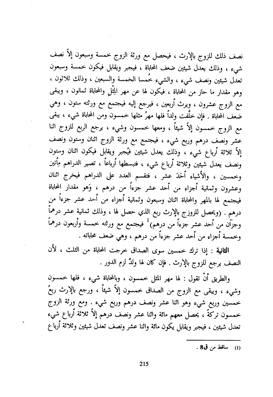 نِصْفُ ذَلِكَ لِلزَّوْجِ بِالْإِرْثِ فَيَحْصُلُ مَعَ وَرَثَةِ الزَّوْجِ خَمْسَةٌ وَسَبْعُونَ إِلَّا نِصْفَ شَيْءٍ وَذَلِكَ يَعْدِلُ شَيْئَيْنِ ضِعْفَ الْمُحَابَاةِ فَيُجْبَرُ وَيُقَابَلُ فَيَكُونُ خَمْسَةٌ وَسَبْعُونَ تَعْدِلُ شَيْئَيْنِ وَنِصْفَ شَيْءٍ وَالشَّيْءُ خُمُسَا الْخَمْسَةِ وَالسَّبْعِينَ وَذَلِكَ ثَلَاثُونَ وَهُوَ مِقْدَارُ مَا حَازَ مِنَ الْمُحَابَاةِ فَيَكُونُ لَهَا عَنْ مَهْرِ الْمِثْلِ وَالْمُحَابَاةِ ثَمَانُونَ وَيَبْقَى مَعَ الزَّوْجِ عِشْرُونَ وَيَرِثُ أَرْبَعِينَ فَيَرْجِعُ إِلَيْهِ فَيَجْتَمِعُ مَعَ وَرَثَتِهِ سِتُّونَ وَهِيَ ضِعْفُ الْمُحَابَاةِ فَإِنْ خَلَّفَتْ وَلَدًا فَلَهَا مَهْرُ مِثْلِهَا خَمْسُونَ وَمِنَ الْمُحَابَاةِ شَيْءٌ يَبْقَى مَعَ الزَّوْجِ خَمْسُونَ إِلَّا شَيْئًا وَمَعَهَا خَمْسُونَ وَشَيْءٌ يَرْجِعُ الرُّبُعُ لِلزَّوْجِ اثْنَا عَشَرَ وَنِصْفُ دِرْهَمٍ وَرُبُعُ شَيْءٍ فَيَجْتَمِعُ مَعَ وَرَثَةِ الزَّوْجِ اثْنَانِ وَسِتُّونَ وَنِصْفٌ إِلَّا ثَلَاثَةَ أَرْبَاعِ شَيْءٍ وَذَلِكَ يَعْدِلُ شَيْئَيْنِ فَيُجْبَرُ وَيُقَابَلُ فَيَكُونُ اثْنَانِ وَسِتُّونَ وَنِصْفٌ يَعْدِلُ شَيْئَيْنِ وَثَلَاثَةَ أَربَاع شَيْء فتبسطها أَربَاعًا تصير الدَّرَاهِم مأتين وَخَمْسِينَ وَالْأَشْيَاءُ أَحَدَ عَشَرَ فَتَقْسِمُ الْعَدَدَ عَلَى الدَّرَاهِمِ فَيَخْرُجُ اثْنَانِ وَعِشْرُونَ وَثَمَانِيَةُ أَجْزَاءٍ مِنْ أَحَدَ عَشَرَ جُزْءًا مِنْ دِرْهَمٍ وَهُوَ مِقْدَارُ الْمُحَابَاةِ فَيَجْتَمِعُ لَهَا بِالْمَهْرِ وَالْمُحَابَاةِ اثْنَانِ وَسَبْعُونَ وَثَمَانِيَةُ أَجْزَاءٍ مِنْ أَحَدَ عَشَرَ جُزْءًا مِنْ دِرْهَمٍ وَيَحْصُلُ لِلزَّوْجِ بِالْإِرْثِ رُبُعُ الَّذِي حَصَلَ لَهَا وَذَلِكَ ثَمَانِيَةَ عَشَرَ دِرْهَمًا وَجُزْآنِ مِنْ أَحَدَ عَشَرَ جُزْءًا مِنْ دِرْهَمٍ فَيَجْتَمِعُ مَعَ وَرَثَتِهِ خَمْسَةٌ وَأَرْبَعُونَ دِرْهَمًا وَخَمْسَةُ أَجْزَاءٍ مِنْ أَحَدَ عَشَرَ جُزْءًا مِنْ دِرْهَمٍ وَهِيَ ضِعْفُ مُحَابَاتِهِ الثَّانِيَةُ إِذَا تَرَكَ خَمْسِينَ سِوَى الصَّدَاقِ خَرَجَتِ الْمُحَابَاةُ مِنَ الثُّلُثِ لِأَنَّ النِّصْفَ يَرْجِعُ لِلزَّوْجِ بِالْإِرْثِ فَإِنْ كَانَ لَهَا وَلَدٌ لَزِمَ الدَّوْرُ وَالطَّرِيقُ أَنْ تَقُولَ لَهَا مَهْرُ الْمِثْلِ خَمْسُونَ وَبِالْمُحَابَاةِ شَيْءٌ فَلَهَا خَمْسُونَ وَشَيْءٌ وَيَبْقَى مَعَ الزَّوْجِ مِنَ الصَّدَاقِ خَمْسُونَ إِلَّا شَيْئًا وَرَجَعَ بِالْإِرْثِ رُبُعُ خَمْسِينَ وَرُبُعُ شَيْءٍ وَهُوَ اثْنَا عَشَرَ وَنِصْفُ دِرْهَمٍ وَرُبُعُ شَيْءٍ وَمَعَ وَرَثَةِ الزَّوْجِ خَمْسُونَ تَرِكَةً يَحْصُلُ مَعَهُمْ مِائَةٌ وَاثْنَا عَشَرَ وَنِصْفُ دِرْهَمٍ إِلَّا ثَلَاثَةَ أَرْبَاعِ شَيْءٍ تَعْدِلُ شَيْئَيْنِ فَيُجْبَرُ وَيُقَابَلُ يَكُونُ مِائَةٌ وَاثْنَا عَشَرَ وَنِصْفٌ تَعْدِلُ شَيْئَيْنِ وَثَلَاثَةَ أَرْبَاعِ