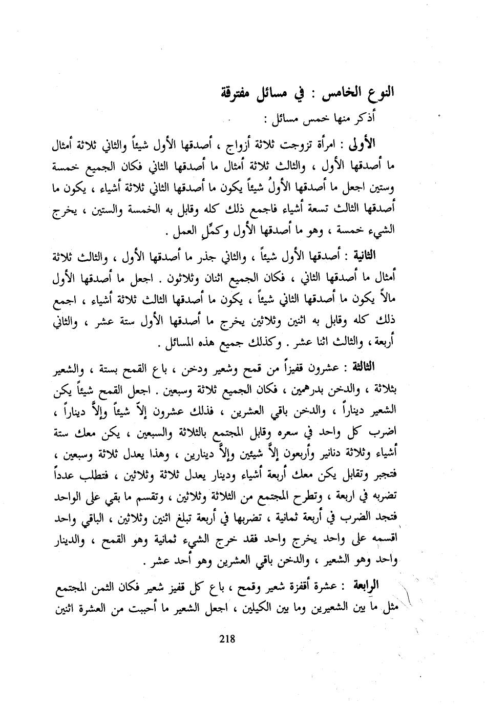 أَذْكُرُ مِنْهَا خَمْسَ مَسَائِلَ الْأُولَى امْرَأَةٌ تَزَوَّجَتْ ثَلَاثَةَ أَزْوَاجٍ أَصْدَقَهَا الْأَوَّلُ شَيْئًا وَالثَّانِي ثَلَاثَةَ أَمْثَالِ مَا أَصْدَقَهَا الْأَوَّلُ وَالثَّالِثُ ثَلَاثَةَ أَمْثَالِ مَا أَصْدَقَهَا الثَّانِي فَكَانَ الْجَمِيعُ خَمْسَةً وَسِتِّينَ اجْعَلْ مَا أَصْدَقَهَا الْأَوَّلُ شَيْئًا يَكُونُ مَا أَصْدَقَهَا الثَّانِي ثَلَاثَةَ أَشْيَاءَ يَكُونُ مَا أَصْدَقَهَا الثَّالِثُ تِسْعَةَ أَشْيَاءَ فَاجْمَعْ ذَلِكَ كُلَّهُ وَقَابِلْ بِهِ الْخَمْسَةَ وَالسِتِّينَ يَخْرُجُ الشَّيْءُ خَمْسَةً وَهُوَ مَا أَصْدَقَهَا الْأَوَّلُ وَكَمِّلِ الْعَمَلَ الثَّانِيَةُ أَصْدَقَهَا الْأَوَّلُ شَيْئًا وَالثَّانِي جِذْرَ مَا أَصْدَقَهَا الْأَوَّلُ وَالثَّالِثُ ثَلَاثَةَ أَمْثَالِ مَا أَصْدَقَهَا الثَّانِي فَكَانَ الْجَمِيعُ اثْنَانِ وَثَلَاثُونَ اجْعَلْ مَا أَصْدَقَهَا الْأَوَّلُ مَالًا يَكُونُ مَا أَصْدَقَهَا الثَّانِي شَيْئًا يَكُونُ مَا أَصْدَقَهَا الثَّالِثُ ثَلَاثَةَ أَشْيَاءَ اجْمَعْ ذَلِكَ كُلَّهُ وَقَابِلْ بِهِ اثْنَيْنِ وَثَلَاثِينَ يَخْرُجُ مَا أَصْدَقَهَا الْأَوَّلُ سِتَّةَ عَشَرَ وَالثَّانِي أَرْبَعَةٌ وَالثَّالِثُ اثْنَا عَشَرَ وَكَذَلِكَ جَمِيعُ هَذِهِ الْمَسَائِلِ الثَّالِثَةُ عِشْرُونَ قَفِيزًا مِنْ قَمْحٍ وَشَعِيرٍ وَدَخَنٍ بَاعَ الْقَمْحَ بِسِتَّةٍ وَالشَّعِيرَ بِثَلَاثَةٍ وَالدَّخَنَ بِدِرْهَمَيْنِ فَكَانَ الْجَمِيعُ ثَلَاثَةً وَسَبْعِينَ اجْعَلِ الْقَمْحَ شَيْئًا يَكُنِ الشَّعِيرُ دِينَارًا وَالدَّخَنُ بَاقِيَ الْعِشْرِينَ فَذَلِكَ عِشْرُونَ إِلَّا شَيْئًا وَإِلَّا دِينَارًا اضْرِبْ كُلَّ وَاحِدٍ فِي سِعْرِهِ وَقَابِلِ الْمُجْتَمِعَ بِالثَّلَاثَةِ وَالسَبْعِينَ يَكُنْ مَعَكَ سِتَّةُ أَشْيَاءَ وَثَلَاثَةُ دَنَانِيرَ وَأَرْبَعُونَ إِلَّا شَيْئَيْنِ وَإِلَّا دِينَارَيْنِ وَهَذَا يَعْدِلُ ثَلَاثَةً وَسَبْعِينَ فَتَجْبُرُ وَتُقَابِلُ يَكُنْ مَعَكَ أَرْبَعَةُ أَشْيَاءَ وَدِينَارٌ يَعْدِلُ ثَلَاثَةً وَثَلَاثِينَ فَتَطْلُبُ عَدَدًا تَضْرِبُهُ فِي أَرْبَعَة وتطرح الْمُجْتَمع من الثَّلَاثَة وَالثَّلَاثِينَ وَتَقْسِمُ مَا بَقِيَ عَلَى الْوَاحِدِ فَتَجِدُ الضَّرْبَ فِي أَرْبَعَة ثَمَانِيَة تضربها فِي أَربع تَبْلُغُ اثْنَيْنِ وَثَلَاثِينَ الْبَاقِي وَاحِدٌ اقْسِمْهُ عَلَى وَاحِدٍ يَخْرُجُ وَاحِدٌ فَقَدْ خَرَجَ الشَّيْءُ ثَمَانِيَةٌ وَهُوَ الْقَمْحُ وَالدِّينَارُ وَاحِدٌ وَهُوَ الشَّعِيرُ وَالدَّخَنُ بَاقِي الْعِشْرِينَ وَهُوَ أَحَدَ عَشَرَ الرَّابِعَةُ عَشَرَةُ أَقْفِزَةِ شَعِيرٍ وَقَمْحٍ بَاعَ كُلَّ قَفِيزِ شَعِيرٍ فَكَانَ الثَّمَنُ الْمُجْتَمِعُ مِثْلَ مَا بَيْنَ الشَّعِيرَيْنِ وَمَا بَيْنَ الْكَيْلَيْنِ اجْعَلِ الشَّعِيرَ مَا أَحْبَبْتَ مِنَ الْعَشَرَةِ اثْنَيْنِ