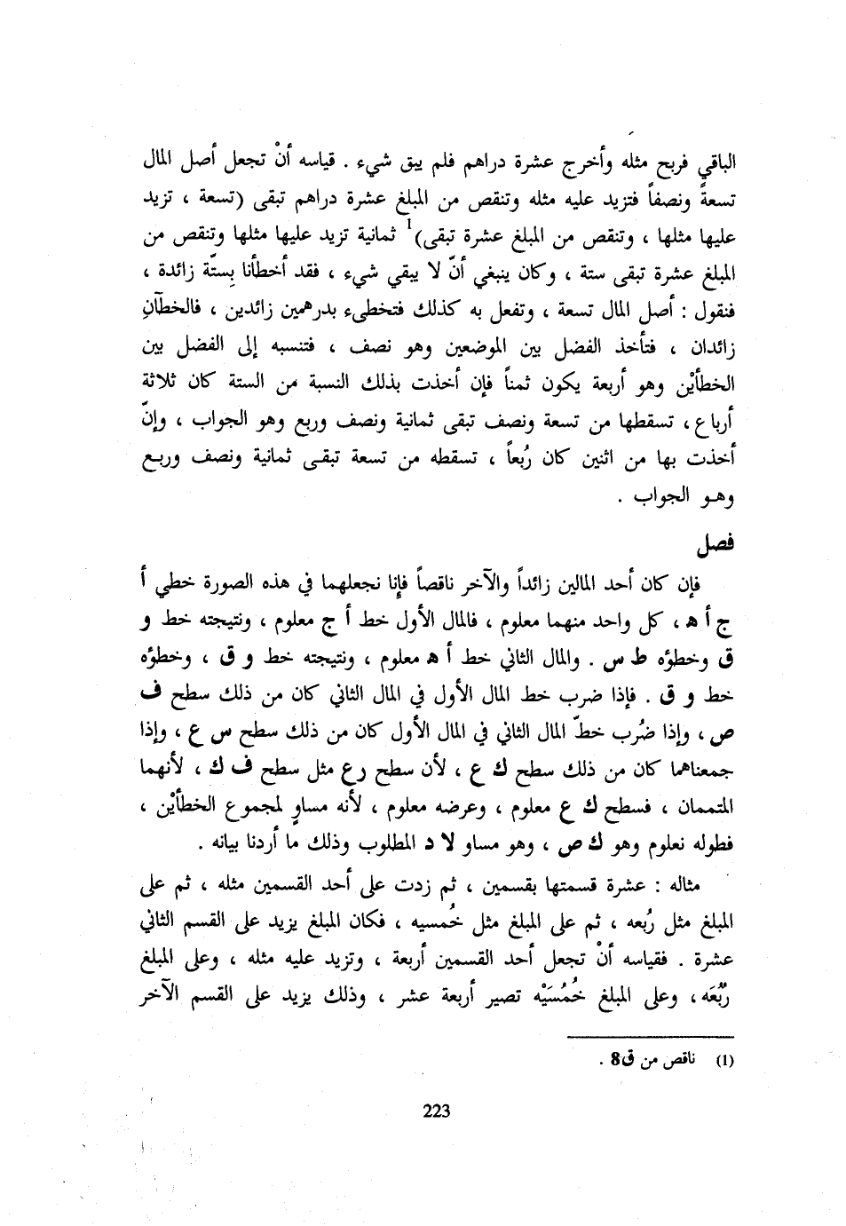 فَإِنْ كَانَ أَحَدُ الْمَالَيْنِ زَائِدًا وَالْآخَرُ نَاقِصًا فَإِنَّا نَجْعَلُهُمَا فِي هَذِهِ الصُّورَةِ خَطَّيْ أج أهـ كُلُّ وَاحِدٍ مِنْهُمَا مَعْلُومٌ فَالْمَالُ الْأَوَّلُ خَطُّ أج مَعْلُومٌ وَنَتِيجَتُهُ خَطُّ وق وَخَطَؤُهُ ط س وَالْمَالُ الثَّانِي خَطُّ أهـ مَعْلُومٌ وَنَتِيجَتُهُ خَطُّ وق وَخَطَؤُهُ خَطُّ وق فَإِذَا ضُرِبَ خَطُّ الْمَالِ الْأَوَّلِ فِي الْمَالِ الثَّانِي كَانَ مِنْ ذَلِكَ سَطْحُ ف ص وَإِذَا ضُرِبَ خَطُّ الْمَالِ الثَّانِي فِي الْمَالِ الْأَوَّلِ كَانَ مِنْ ذَلِكَ سَطْحُ س ع وَإِذَا جَمَعْنَاهُمَا كَانَ مِنْ ذَلِكَ سَطْحُ ك ع لِأَنَّ سَطْحَ ر ع مِثْلُ سَطْحِ ف ك لِأَنَّهُمَا الْمُتَمِّمَانِ فَسَطْحُ ك ع مَعْلُومٌ وَعَرْضُهُ مَعْلُومٌ لِأَنَّهُ مُسَاوٍ لِمَجْمُوعِ الْخَطَأَيْنِ فَطُولُهُ مَعْلُومٌ وَهُوَ ك ص وَهُوَ مُسَاوٍ لَا د الْمَطْلُوبِ وَذَلِكَ مَا أَرَدْنَا بَيَانَهُ مِثَالُهُ عَشَرَةٌ قَسَمْتَهَا بِقِسْمَيْنِ ثُمَّ زِدْتَ عَلَى أَحَدِ الْقِسْمَيْنِ مِثْلَهُ ثُمَّ عَلَى الْمَبْلَغِ مِثْلَ رُبُعِهِ ثُمَّ عَلَى الْمَبْلَغِ مِثْلَ خُمُسَيْهِ فَكَانَ الْمَبْلَغُ يَزِيدُ عَلَى الْقِسْمِ الثَّانِي عَشَرَةً فَقِيَاسُهُ أَنْ تَجْعَلَ أَحَدَ الْقِسْمَيْنِ أَرْبَعَةً وَتَزِيدُ عَلَيْهِ مِثْلَهُ وَعَلَى الْمَبْلَغِ رُبُعَهُ وَعَلَى الْمَبْلَغِ خُمُسَيْهِ تَصِيرُ أَرْبَعَةَ عَشَرَ وَذَلِكَ يَزِيدُ عَلَى الْقِسْمِ الْآخَرِ