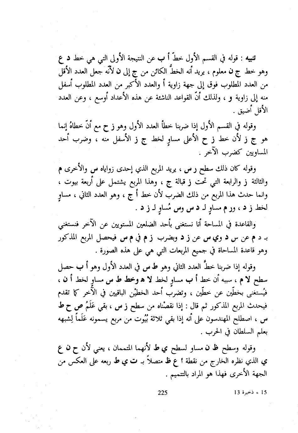 تَنْبِيهٌ قَوْلُهُ فِي الْقِسْمِ الْأَوَّلِ خَطُّ أَب عَنِ النَّتِيجَةِ الْأُولَى الَّتِي هِيَ خَطُّ د ع وَهُوَ خَطُّ ج ن مَعْلُومٌ يُرِيدُ أَنَّهُ الْخَطّ الْكَائِن مِنْ ج إِلَى ن لِأَنَّهُ جَعَلَ الْعَدَدَ الْأَقَلَّ مِنَ الْعَدَدِ الْمَطْلُوبِ فَوق إِلَى جِهَة زَاوِيَة أوالعدد الْأَكْبَرَ مِنَ الْعَدَدِ الْمَطْلُوبِ أَسْفَلَ مِنْهُ إِلَى زَاوِيَة وولذلك أَنَّ الْقَوَاعِدَ النَّاشِئَةَ عَنْ هَذِهِ الْأَعْدَادِ أَوْسَعُ وَعَنِ الْعَدَدِ الْأَقَلِّ أَضْيَقُ وَقَوْلُهُ فِي الْقِسْمِ الْأَوَّلِ إِذَا ضَرَبْنَا خَطَأَ الْعَدَدِ الْأَوَّلِ وَهُوَ ز ح مَعَ أَن خطاه إِنَّمَا هُوَ ج ز لِأَنَّ خَطَّ ز ح الْأَعْلَى مُسَاوٍ لِخَطِّ ج ز الْأَسْفَلِ مِنْهُ وَضَرْبُ أَحَدِ الْمُسَاوِيَيْنِ كَضَرْبِ الْآخَرِ وَقَوْلُهُ كَانَ ذَلِكَ سَطْحَ ر س يُرِيدُ الْمُرَبَّعَ الَّذِي إِحْدَى زَوَايَاهُ س وَالْأُخْرَى م وَالثَّالِثَةُ ز وَالرَّابِعَةُ الَّتِي تَحْتَ ز قُبَالَةَ ج وَهَذَا الْمُرَبَّعُ يَشْتَمِلُ عَلَى أَرْبَعَةِ بُيُوتٍ وَإِنَّمَا حَدَثَ هَذَا الْمُرَبَّعُ مِنْ ذَلِكَ الضَّرْبِ لِأَنَّ خَطَّ أج وَهُوَ الْعَدَدُ الثَّانِي مُسَاوٍ لِخَطِّ ز د ور م مسَاوٍ ل د س وس مُسَاوٍ ل ز د وَالْقَاعِدَةُ فِي الْمِسَاحَةِ أَنَّا نَسْتَغْنِي بِأَحَدِ الضِّلْعَيْنِ الْمُسْتَوِيَيْنِ عَنِ الْآخَرِ فَنَسْتَغْنِي بِ د م عَنْ س د وي س عَنْ ز د وَبِضَرْبِ ز م فِي م س فَيَحْصُلُ الْمُرَبَّعُ الْمَذْكُورُ وَهُوَ قَاعِدَة المساحاة فِي جَمِيعِ الْمُرَبَّعَاتِ الَّتِي هِيَ عَلَى هَذِهِ الصُّورَةِ وَقَوْلُهُ إِذَا ضَرَبْنَا خَطَّ الْعَدَدِ الثَّانِي وَهُوَ ط س فِي الْعَدَدِ الْأَوَّلِ وَهُوَ أَب حَصَلَ سَطْحُ لَا م سَبَبُهُ أَنَّ خَطَّ أَب مُسَاوٍ لِخَطِّ لَا هـ وَخَطُّ ط س مُسَاوٍ لِخَطِّ أَن فَيُسْتَغْنَى بِخَطَّيْنِ عَنْ خَطَّيْنِ وَتَضْرِبُ أَحَدَ الْخَطَّيْنِ الْبَاقِيَيْنِ فِي الْآخَرِ كَمَا تَقَدَّمَ فَيَحْدُثُ الْمُرَبَّعُ الْمَذْكُورُ ثُمَّ قَالَ إِذَا نَقَصْنَاهُ مِنْ سَطْحِ ز س بَقِيَ عَلَمُ ص ح ط س اصْطَلَحَ الْمُهَنْدِسُونَ عَلَى أَنَّهُ إِذَا بَقِيَ ثَلَاثَةُ بُيُوتٍ مِنْ مُرَبَّعٍ يُسَمُّونَهُ عَلَمًا لِشَبَهِهِ بِعَلَمِ السُّلْطَانِ فِي الْحَرْبِ وَقَوْلُهُ وَسَطْحُ ظ ن مُسَاوٍ لِسَطْحِ ي ط لِأَنَّهُمَا الْمَتُمِّمَانِ يَعْنِي لِأَنَّ ح ن ع ي الَّذِي نَظَرُهُ الْخَارِجُ مِنْ نُقْطَةِ أع ظ مُتَّصِلًا ب ت ي ط رُبُعُهُ عَلَى الْعَكْسِ مِنَ الْجِهَةِ الْأُخْرَى فَهَذَا هُوَ الْمُرَادُ بِالتَّتْمِيمِ