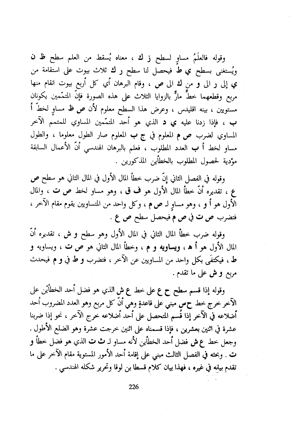 وَقَوْلُهُ فَالْعَلَمُ مُسَاوٍ لِسَطْحِ ز ك مَعْنَاهُ يُسْقَطُ مِنَ الْعَلَمِ سَطْحُ ظ ن وَيُسْتَغْنَى بِسَطْحِ ي ط فَيَحْصُلُ لَنَا سَطْحُ ر ك ثَلَاثَ بُيُوتٍ عَلَى اسْتِقَامَةٍ مِنْ ي إِلَى ر إِلَى وَمن ك إِلَى ص وَقَامَ الْبُرْهَانُ أَيْ كُلُّ أَربع بيُوت انقام مِنْهَا مُرَبَّعٌ وَقَطَعَهُمَا خَطٌّ مَارٌّ بِالزَّوَايَا الثَّلَاثِ عَلَى هَذِهِ الصُّورَةِ فَإِنَّ الْمُتَمِّمَيْنِ يَكُونَانِ مُسْتَوِيَيْنِ بَيَّنَهُ إِقْلِيدِسُ وَعَرْضُ هَذَا السَّطْحِ مَعْلُومٌ لِأَنَّ ص ظ مُسَاوٍ لِخَطِّ أَب فَإِذَا زِدْنَا عَلَيْهِ ي د الَّذِي هُوَ أَحَدُ الْمُتَمِّمَيْنِ الْمُسَاوِي لِلْمُتَمِّمِ الْآخَرِ الْمُسَاوِي لِضَرْبِ ص م الْمَعْلُومِ فِي ج ب الْمَعْلُومِ صَارَ الطُّولُ مَعْلُومًا وَالطُّولُ مُسَاوٍ لِخَطِّ أَب الْعَدَدِ الْمَطْلُوبِ فَعُلِمَ بِالْبُرْهَانِ الْهَنْدَسِيِّ أَنَّ الْأَعْمَالَ السَّابِقَةَ مُؤَدِّيَةٌ لِحُصُولِ الْمَطْلُوبِ بِالْخَطَأَيْنِ الْمَذْكُورَيْنِ وَقَوْلُهُ فِي الْفَصْلِ الثَّانِي إِنْ ضُرِبَ خَطَأُ الْمَالِ الْأَوَّلِ فِي الْمَالِ الثَّانِي هُوَ سَطْحُ ص ع تَقْدِيرُهُ أَنَّ خَطَأَ الْمَالِ الْأَوَّلِ هُوَ ف ق وَهُوَ مُسَاوٍ لِخَطِّ ص ت وَالْمَالُ الْأَوَّلُ هُوَ أووهو مُسَاوٍ لِ ص م وَكُلُّ وَاحِدٍ مِنَ الْمُتَسَاوِيَيْنِ يَقُومُ مَقَامَ الْآخَرِ فَتَضْرِبُ ص ت فِي ص م فَيَحْصُلُ سَطْحُ ص ع وَقَوْلُهُ ضَرْبُ خَطَأِ الْمَالِ الثَّانِي فِي الْمَالِ الْأَوَّلِ وَهُوَ سَطْحُ وش تَقْدِيرُهُ أَنَّ الْمَالَ الأول هُوَ أهـ ويساويه ر م وَخَطَأُ الْمَالِ الثَّانِي هُوَ ص ت وَيُسَاوِيهِ وط فَيُكْتَفَى بِكُلِّ وَاحِدٍ مِنَ الْمُسَاوِيَيْنِ عَنِ الْآخَرِ فَتَضْرِبُ وط فِي وم فَيَحْدُثُ مُرَبَّعُ وش عَلَى مَا تَقَدَّمَ وَقَوْلُهُ إِذَا قُسِمَ سَطْحُ ح ع عَلَى خَطِّ ع ش الَّذِي هُوَ فَضْلُ أَحَدِ الْخَطَأَيْنِ عَلَى الْآخَرِ خَرَجَ خَطُّ ح س مَبْنِيٌّ عَلَى قَاعِدَةٍ وَهِيَ أَنَّ كُلَّ مُرَبَّعٍ وَهُوَ الْعَدَدُ الْمَضْرُوبُ أَحَدُ أَضْلَاعِهِ فِي الْآخَرِ إِذَا قُسِمَ الْمُتَحَصِّلُ عَلَى أَحَدِ أَضْلَاعِهِ خَرَجَ الْآخَرُ نَحْوُ إِذَا ضَرَبْنَا عَشَرَةً فِي اثْنَيْنِ بِعِشْرِينَ فَإِذَا قَسَمْنَاهُ على اثْنَيْنِ خرجت عَشَرَةٌ وَهُوَ الضِّلْعُ الْأَطْوَلُ وَجُعِلَ خَطُّ ع ش فَضْلَ أَحَدِ الْخَطَأَيْنِ لِأَنَّهُ مُسَاوٍ لِ ث ت الَّذِي هُوَ فَضْلُ خَطَأِ وت وَبَحْثُهُ فِي الْفَصْلِ الثَّالِثِ مَبْنِيٌّ عَلَى إِقَامَةِ أَحَدِ الْأُمُورِ الْمُسْتَوِيَةِ مَقَامَ الْآخَرِ عَلَى مَا تَقَدَّمَ بَيَانُهُ فِي غَيْرِهِ فَهَذَا بَيَانُ كَلَامِ قِسْطَا بْنِ لُوقَا وَتَحْرِيرُ شَكْلِهِ الْهَنْدَسِيِّ