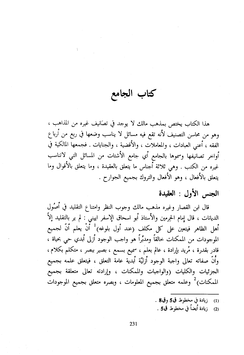هَذَا الْكِتَابُ يَخْتَصُّ بِمَذْهَبِ مَالِكٍ لَا يُوجَدُ فِي تَصَانِيفِ غَيْرِهِ مِنَ الْمَذَاهِبِ وَهُوَ مِنْ مَحَاسِنِ التَّصْنِيفِ لِأَنَّهُ تَقَعُ فِيهِ مَسَائِلُ لَا يُنَاسِبُ وَضْعُهَا فِي رُبْعٍ مِنْ أَرْبَاعِ الْفِقْهِ أَعْنِي الْعِبَادَاتِ وَالْمُعَامَلَاتِ وَالْأَقْضِيَةَ وَالْجِنَايَاتِ فَجَمَعَهَا الْمَالِكِيَّةُ فِي أَوَاخِرِ تَصَانِيفِهَا وَسَمَّوْهَا بِالْجَامِعِ أَيْ جَامِعِ الْأَشْتَاتِ مِنَ الْمَسَائِلِ الَّتِي لَا تُنَاسِبُ غَيْرَهُ مِنَ الْكُتُبِ وَهِيَ ثَلَاثَةُ أَجْنَاسٍ مَا يَتَعَلَّقُ بِالْعَقِيدَةِ وَمَا يَتَعَلَّقُ بِالْأَقْوَالِ وَمَا يَتَعَلَّقُ بِالْأَفْعَالِ وَهُوَ الْأَفْعَالُ وَالتُّرُوكُ بِجَمِيعِ الْجَوَارِحِ