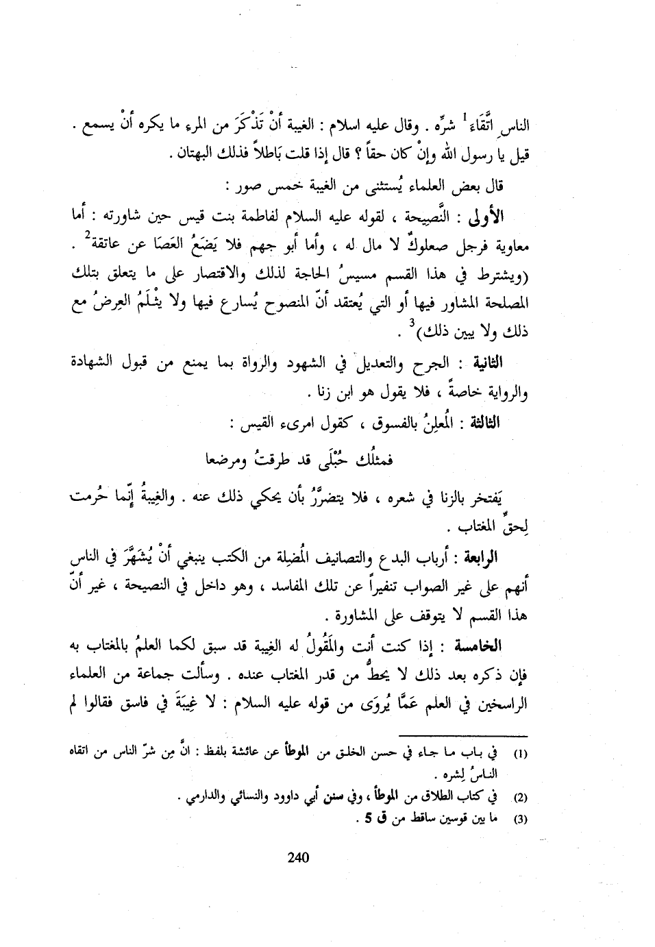 (الْغِيبَةُ أَنْ تَذْكُرَ مِنَ الْمَرْءِ مَا يَكْرَهُ أَنْ يَسْمَعَ) قِيلَ يَا رَسُولَ اللَّهِ وَإِنْ كَانَ حَقًّا قَالَ إِذَا قُلْتَ بَاطِلًا فَذَلِكَ الْبُهْتَانُ قَالَ بَعْضُ الْعُلَمَاءِ يُسْتَثْنَى مِنَ الْغِيبَةِ خمس صور الأولى النَّصِيحَة لقَوْله - صَلَّى اللَّهُ عَلَيْهِ وَسَلَّم َ - لِفَاطِمَةَ بِنْتِ قَيْسٍ حِينَ شَاوَرَتْهُ أَمَّا مُعَاوِيَةُ فَرَجُلٌ صُعْلُوكٌ لَا مَالَ لَهُ وَأما أَوب جَهْمٍ فَلَا يَضَعُ الْعَصَا عَنْ عَاتِقِهِ وَيُشْتَرَطُ فِي هَذَا الْقِسْمِ مَسِيسُ الْحَاجَةِ لِذَلِكَ وَالِاقْتِصَارُ عَلَى مَا يَتَعَلَّقُ بِتِلْكَ الْمَصْلَحَةِ الْمُشَاوَرِ فِيهَا أَوِ الَّتِي يُعْتَقَدُ أَنَّ الْمَنْصُوحَ يُسَارِعُ فِيهَا وَلَا يُثْلَمُ الْعِرْضُ مَعَ ذَلِكَ وَلَا يُبَيَّنُ ذَلِكَ الثَّانِيَةُ الْجَرْحُ وَالتَّعْدِيلُ فِي الشُّهُودِ وَالرُّوَاةِ بِمَا يَمْنَعُ مِنْ قَبُولِ الشَّهَادَةِ وَالرِّوَايَةِ خَاصَّةً فَلَا يَقُول هُوَ ابْن زنا الثَّالِثَةُ الْمُعْلِنُ بِالْفُسُوقِ كَقَوْلِ امْرِئِ الْقَيْسِ: