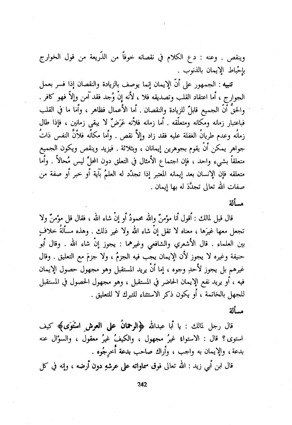 قَالَ رَجُلٌ لِمَالِكٍ يَا أَبَا عَبْدِ اللَّهِ {الرَّحْمَنُ عَلَى الْعَرْش اسْتَوَى} كَيْفَ اسْتَوَى قَالَ الِاسْتِوَاءُ غَيْرُ مَجْهُولٍ وَالْكَيْفُ غَيْرُ مَعْقُولٍ وَالسُّؤَالُ عَنْهُ بِدْعَةٌ وَالْإِيمَانُ بِهِ وَاجِبٌ وَأُرَاكَ صَاحِبَ بِدْعَةٍ أَخْرِجُوهُ قَالَ ابْنُ أَبِي زَيْدٍ اللَّهُ تَعَالَى فَوْقَ سَمَاوَاتِهِ عَلَى عَرْشِهِ دُونَ أَرْضِهِ وَإِنَّهُ فِي كُلِّ
