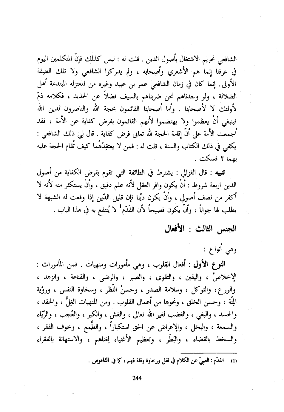 الشَّافِعِي تَحْرِيمُ الِاشْتِغَالِ بِأُصُولِ الدِّينِ قَلَتُ لَهُ لَيْسَ كَذَلِكَ فَإِنَّ الْمُتَكَلِّمِينَ الْيَوْمَ فِي عُرْفِنَا إِنَّمَا هُوَ الْأَشْعَرِيُّ وَأَصْحَابُهُ وَلَمْ يُدْرِكُوا الشَّافِعِيَّ وَلَا تِلْكَ الطَّبَقَةَ الْأُولَى إِنَّمَا كَانَ فِي زَمَانِ الشَّافِعِيِّ عمر بْنُ عَبِيدٍ وَغَيْرُهُ مِنَ الْمُعْتَزِلَةِ الْمُبْتَدِعَةِ أَهْلِ الضَّلَالَةِ وَلَوْ وَجَدْنَاهُمْ نَحْنُ ضَرَبْنَاهُمْ بِالسَّيْفِ فَضْلًا عَنِ الْحَدِيدِ فَكَلَامُهُ ذَمٌّ لِأُولَئِكَ لَا لِأَصْحَابِنَا وَأَمَّا أَصْحَابُنَا الْقَائِمُونَ بِحُجَّةِ اللَّهِ وَالنَّاصِرُونَ لِدِينِ اللَّهِ فَيَنْبَغِي أَنْ يُعَظَّمُوا وَلَا يُهْتَضَمُوا لِأَنَّهُمُ الْقَائِمُونَ بِفَرْضِ كِفَايَةٍ عَنِ الْأُمَّةِ فَقَدْ أَجْمَعَتِ الْأُمَّةُ عَلَى أَنَّ إِقَامَةَ الْحُجَّةِ لِلَّهِ تَعَالَى فَرْضُ كِفَايَةٍ قَالَ لِي ذَلِكَ الشَّافِعِيُّ يَكْفِي فِي ذَلِكَ الْكِتَابُ وَالسُّنَّةُ قُلْتُ لَهُ فَمَنْ لَا يَعْتَقِدُهُمَا كَيْفَ تُقَامُ الْحُجَّةُ عَلَيْهِ بِهِمَا فَسكت تبيه قَالَ الْغَزَالِيُّ يُشْتَرَطُ فِي الطَّائِفَةِ الَّتِي تَقُومُ بِفَرْضِ الْكِفَايَةِ مِنْ أُصُولِ الدِّينِ أَرْبَعَةُ شُرُوطٍ أَنْ يَكُونَ وَافِرَ الْعَقْلِ لِأَنَّهُ عِلْمٌ دَقِيقٌ وَأَنْ يَسْتَكْثِرَ مِنْهُ لِأَنَّهُ لَا أَكْفَرَ مِنْ نِصْفِ أُصُولِيٍّ وَأَنْ يَكُونَ دَيِّنًا فَإِنَّ قَلِيلَ الدِّينِ إِذَا وَقَعَتْ لَهُ الشُّبْهَةُ لَا يَطْلُبُ لَهَا جَوَابًا وَأَنْ يَكُونَ فَصِيحًا لِأَنَّ الْفَدْمَ لَا يُنْتَفَعُ بِهِ فِي هَذَا الْبَابِ