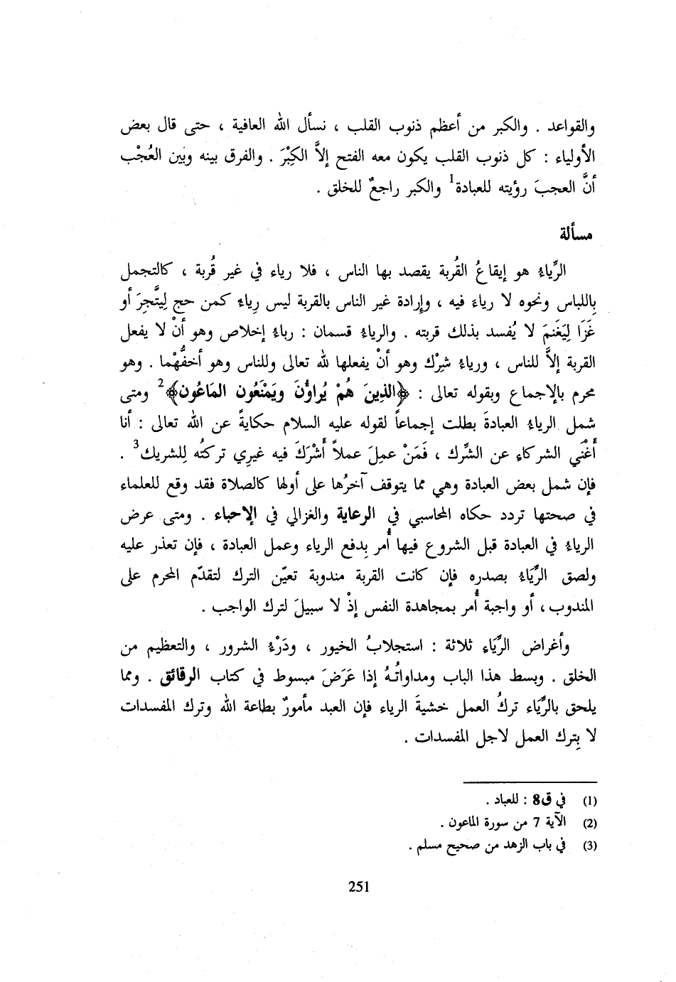 الرِّيَاءُ هُوَ إِيقَاعُ الْقُرْبَةِ يَقْصِدُ بِهَا النَّاسَ فَلَا رِيَاءَ فِي غَيْرِ قُرْبَةٍ كَالتَّجَمُّلِ بِاللِّبَاسِ وَنَحْوِهِ لَا رِيَاء فِيهِ وَإِرَادَة غير النَّاس بالقربة لَيْسَ رِيَاءً كَمَنْ حَجَّ لِيَتَّجِرَ أَوْ غَزَا لِيَغْنَمَ لَا يُفْسِدُ بِذَلِكَ قُرْبَتَهُ وَالرِّيَاءُ قِسْمَانِ رِيَاءُ إِخْلَاصٍ وَهُوَ أَنْ لَا يَفْعَلَ الْقُرْبَةَ إِلَّا لِلنَّاسِ وَرِيَاءُ شِرْكٍ وَهُوَ أَنْ يَفْعَلَهَا لِلَّهِ تَعَالَى وَلِلنَّاسِ وَهُوَ أَخَفُّهُمَا وَهُوَ مُحَرَّمٌ بِالْإِجْمَاع وَبِقَوْلِهِ تَعَالَى {الَّذين هم يراؤن وَيمْنَعُونَ الماعون} وَمَتَى شَمِلَ الرِّيَاءُ الْعِبَادَةَ بَطَلَتْ إِجْمَاعًا لقَوْله - صَلَّى اللَّهُ عَلَيْهِ وَسَلَّم َ - حِكَايَةً عَنِ اللَّهِ تَعَالَى أَنَا أَغْنَى الشُّرَكَاءِ عَنِ الشِّرْكِ فَمَنْ عَمِلَ عَمَلًا أَشَرَكَ فِيهِ غَيْرِي تَرَكْتُهُ لِلشَّرِيكِ فَإِنْ شَمِلَ بَعْضَ الْعِبَادَةِ وَهِيَ مِمَّا يَتَوَقَّفُ آخِرُهَا عَلَى أَوَّلِهَا كَالصَّلَاةِ فَقَدْ وَقَعَ لِلْعُلَمَاءِ فِي صِحَّتِهَا تَرَدُّدٌ حَكَاهُ المحاسبي فِي الرِّعَايَة وَالْغَزالِيّ فِي الإحباء وَمَتَى عَرَضَ الرِّيَاءُ فِي الْعِبَادَةِ قَبْلَ الشُّرُوعِ فِيهَا أَمر بِدفع الرقاء وَعَمَلِ الْعِبَادَةِ فَإِنْ تَعَذَّرَ عَلَيْهِ وَلَصِقَ الرِّيَاءُ بِصَدْرِهِ فَإِنْ كَانَتِ الْقُرْبَةُ مَنْدُوبَةً تَعَيَّنَ التَّرْكُ لِتَقَدُّمِ الْمُحَرَّمِ عَلَى الْمَنْدُوبِ أَوْ وَاجِبَةً أُمِرَ بِمُجَاهَدَةِ النَّفْسِ إِذْ لَا سَبِيلَ لِتَرْكِ الْوَاجِبِ وَأَغْرَاضُ الرِّيَاءِ ثَلَاثَةٌ اسْتِجْلَابُ الْخُيُورِ وَدَرْءُ الشُّرُورِ وَالتَّعْظِيمُ مِنَ الْخَلْقِ وَبَسْطُ هَذَا الْبَابِ وَمُدَاوَاتُهُ إِذَا عَرَضَ مَبْسُوطٌ فِي كِتَابِ الرَّقَائِقِ وَمِمَّا يَلْحَقُ بِالرِّيَاءِ تَرْكُ الْعَمَلِ خَشْيَةَ الرِّيَاءِ فَإِنَّ الْعَبْدَ مَأْمُورٌ بِطَاعَةِ اللَّهِ وَتَرْكِ الْمُفْسِدَاتِ لَا بِتَرْكِ الْعَمَلِ لِأَجَلِ الْمُفْسِدَاتِ