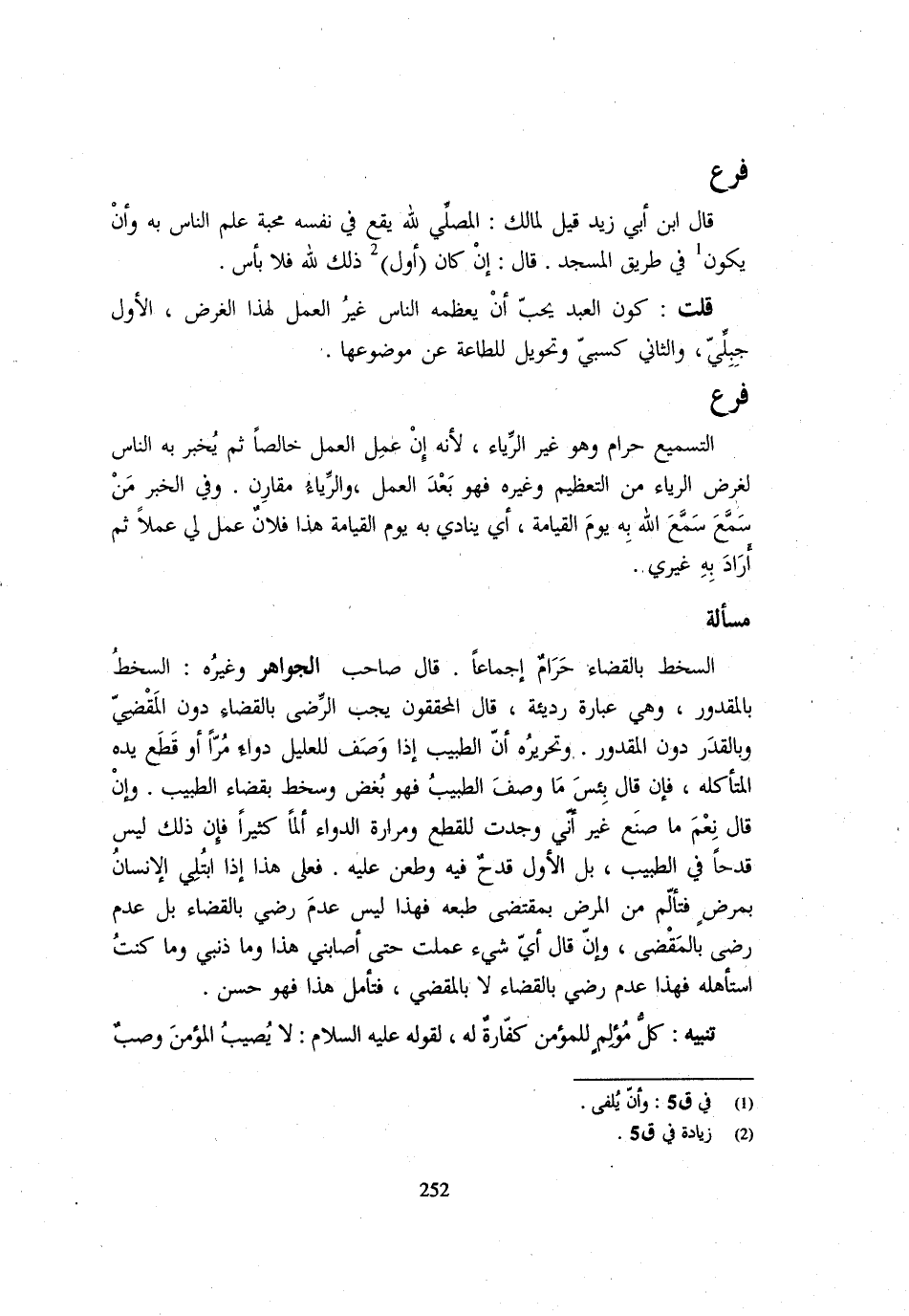 قَالَ ابْنُ أَبِي زَيْدٍ قِيلَ لِمَالِكٍ الْمُصَلِّي لِلَّهِ يَقَعُ فِي نَفْسِهِ مَحَبَّةُ عِلْمِ النَّاسِ بِهِ وَأَنْ يَكُونَ فِي طَرِيقِ الْمَسْجِدِ قَالَ إِنْ كَانَ أَوَّلُ ذَلِكَ لِلَّهِ فَلَا بَأْسَ قُلْتُ كَوْنُ الْعَبْدِ يُحِبُّ أَنْ يُعَظِّمَهُ النَّاسُ غَيْرُ الْعَمَلِ لِهَذَا الْغَرَضِ الْأَوَّلُ جِبِلِّيٌّ وَالثَّانِي كسبي وتحويل الطَّاعَة عَن موضوعها