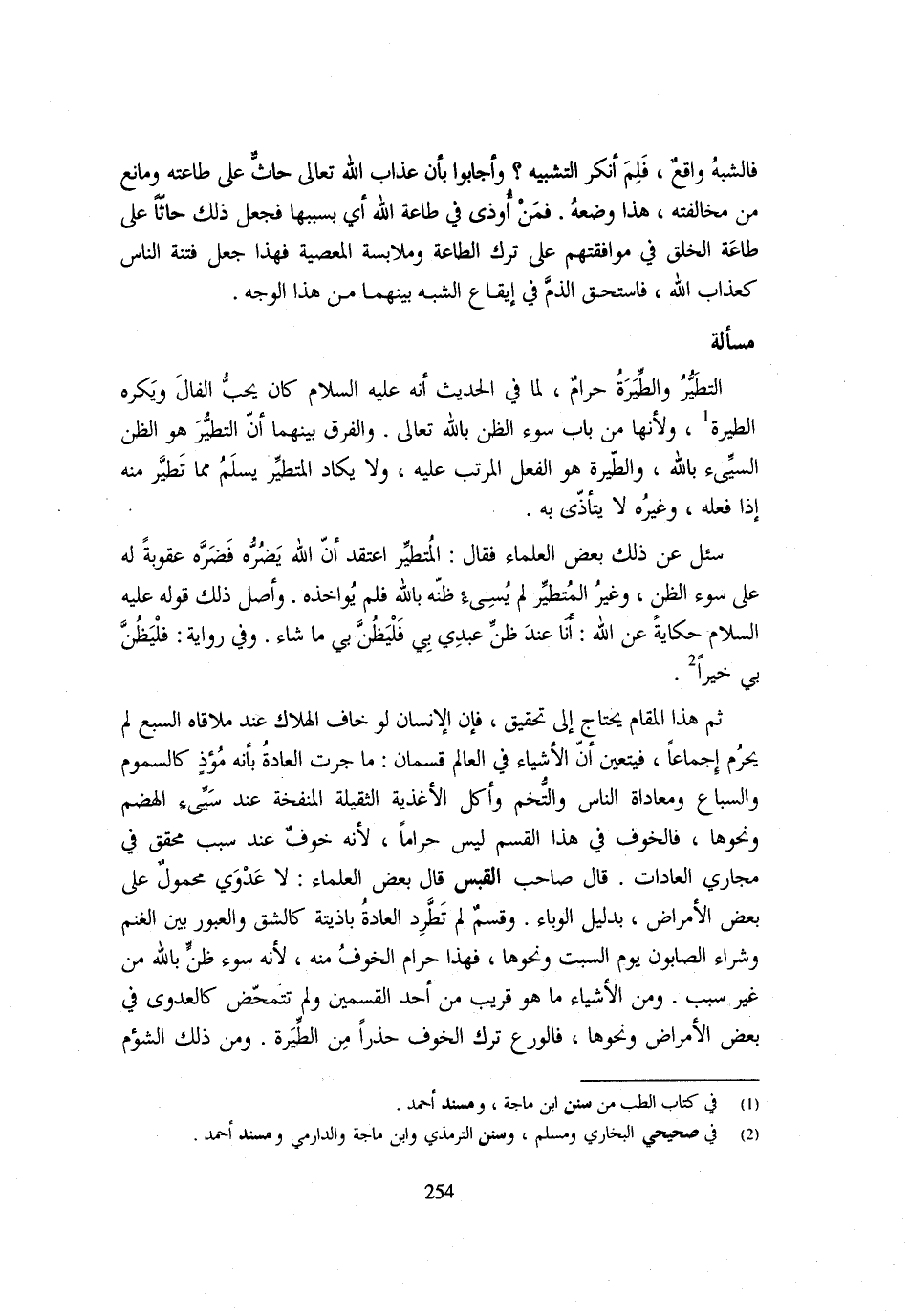 (أَنَا عِنْدَ ظَنِّ عَبْدِي بِي فَلْيَظُنَّ بِي مَا شَاءَ) وَفِي رِوَايَةٍ فَلْيَظُنَّ بِي خَيْرًا ثُمَّ هَذَا الْمَقَامُ يَحْتَاجُ إِلَى تَحْقِيقٍ فَإِنَّ الْإِنْسَانَ لَوْ خَافَ الْهَلَاكَ عِنْدَ مُلَاقَاةِ السَّبُعِ لَمْ يَحْرُمْ إِجْمَاعًا فَيَتَعَيَّنُ أَنَّ الْأَشْيَاءَ فِي الْعَالَمِ قِسْمَانِ مَا جَرَتِ الْعَادة بِأَن مُؤْذٍ كَالسُّمُومِ وَالسِّبَاعِ وَمُعَادَاةِ النَّاسِ وَالتُّخُمِ وَأَكْلِ الأغذية الثَّقِيلَة المنفخة عِنْد سيىء الْهَضْمِ وَنَحْوِهَا فَالْخَوْفُ فِي هَذَا الْقِسْمِ لَيْسَ حَرَامًا لِأَنَّهُ خَوْفٌ عِنْدَ سَبَبٍ مُحَقَّقٍ فِي مَجَارِي الْعَادَاتِ قَالَ صَاحِبُ الْقَبَسِ قَالَ بَعْضُ الْعُلَمَاءِ لَا عَدْوَى مَحْمُولٌ عَلَى بَعْضِ الْأَمْرَاضِ بِدَلِيلِ الْوَبَاءِ وَقِسْمٌ لَمْ تَطَّرِدِ الْعَادَةُ بِأَذِيَّتِهِ كَالشَّقِّ وَالْعُبُورِ بَيْنَ الْغَنَمِ وَشِرَاءِ الصَّابُونِ يَوْمَ السَّبْتِ وَنَحْوِهَا فَهَذَا حَرَامٌ الْخَوْفُ مِنْهُ لِأَنَّهُ سُوءُ ظَنٍّ بِاللَّهِ مِنْ غَيْرِ سَبَبٍ وَمِنَ الْأَشْيَاءِ مَا هُوَ قَرِيبٌ مَنْ أَحَدِ الْقِسْمَيْنِ وَلم تتمخض كَالْعَدْوَى فِي بَعْضِ الْأَمْرَاضِ وَنَحْوِهَا فَالْوَرَعُ تَرْكُ الْخَوْفِ حَذَرًا مِنَ الطِّيَرَةِ وَمِنْ ذَلِكَ الشُّؤْمُ