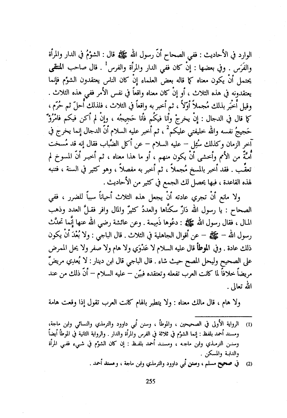 الْوَارِد فِي الْأَحَادِيثِ فَفِي الصِّحَاحِ أَنَّ رَسُولَ اللَّهِ - صَلَّى اللَّهُ عَلَيْهِ وَسَلَّم َ - قَالَ (الشُّؤْمُ فِي الدَّارِ وَالْمَرْأَةِ وَالْفَرَسِ) وَفِي بَعْضِهَا إِنْ كَانَ فَفِي الدَّارِ وَالْمَرْأَةِ وَالْفَرَسِ قَالَ صَاحِبُ الْمُنْتَقَى يُحْتَمَلُ أَنْ يَكُونَ مَعْنَاهُ كَمَا قَالَهُ بَعْضُ الْعُلَمَاءِ إِنْ كَانَ النَّاسُ يَعْتَقِدُونَ الشُّؤْمَ فَإِنَّمَا يَعْتَقِدُونَهُ فِي هَذِهِ الثَّلَاثِ أَوْ إِنْ كَانَ مَعْنَاهُ وَاقِعًا فِي نَفْسِ الْأَمْرِ فَفِي هَذِهِ الثَّلَاثِ وَقِيلَ أَخْبَرَ بِذَلِكَ مُجْمَلًا أَوَّلًا ثُمَّ أَخْبَرَ بِهِ وَاقِعًا فِي الثَّلَاثِ فَلِذَلِكَ أُحِلَّ ثُمَّ حُرِّمَ كَمَا قَالَ فِي الدَّجَّالِ إِنْ يَخْرُجْ وَأَنَا فِيكُمْ فَأَنَا حَجِيجُهُ وَإِنْ لَمْ أَكُنْ فِيكُمْ فَامْرؤ حَجِيجُ نَفْسِهِ وَالله خليفتي عَلَيْكُم ثمَّ أخبر - صَلَّى اللَّهُ عَلَيْهِ وَسَلَّم َ - أَنَّ الدَّجَّالَ إِنَّمَا يَخْرُجُ فِي آخِرِ الزَّمَانِ وَكَذَلِكَ سُئِلَ - صَلَّى اللَّهُ عَلَيْهِ وَسَلَّم َ - عَنْ أَكْلِ الضِّبَابِ فَقَالَ إِنَّهُ قَدْ مُسِخَتْ أُمَّةٌ مِنَ الْأُمَمِ وَأَخْشَى أَنْ يَكُونَ مِنْهُمْ أَوْ مَا هَذَا مَعْنَاهُ ثُمَّ أَخْبَرَ أَنَّ الْمُسُوخَ لَمْ تُعَقِّبْ فَقَدْ أَخْبَرَ بِالْمَسْخِ مُجْمَلًا ثُمَّ أَخْبَرَ بِهِ مُفَصَّلًا وَهُوَ كَثِيرٌ فِي السُّنَّةِ فَتَنَبَّهْ لِهَذِهِ الْقَاعِدَةِ فَبِهَا يَحْصُلُ لَكَ الْجَمْعُ فِي كَثِيرٍ مِنَ الْأَحَادِيثِ وَلَا مَانِعَ أَنْ تَجْرِيَ عَادَتُهُ أَنْ يَجْعَلَ هَذِهِ الثَّلَاثَ أَحْيَانًا سَبَبًا لِلضَّرَرِ فَفِي الصِّحَاحِ يَا رَسُولَ اللَّهِ دَارٌ سَكَنَّاهَا وَالْعَدَدُ كَثِيرٌ وَالْمَالُ وَافِرٌ فَقَلَّ الْعَدَدُ وَذَهَبَ الْمَالُ فَقَالَ رَسُولُ اللَّهِ - صَلَّى اللَّهُ عَلَيْهِ وَسَلَّم َ - دَعُوهَا ذَمِيمَةٌ وَعَنْ عَائِشَةَ رَضِيَ اللَّهُ عَنْهَا إِنَّمَا تَحَدَّثَ رَسُولُ اللَّهِ - صَلَّى اللَّهُ عَلَيْهِ وَسَلَّم َ - عَنْ أَقْوَالِ الْجَاهِلِيَّةِ فِي الثَّلَاثِ قَالَ الْبَاجِيُّ وَلَا بُعْدَ أَنْ يَكُونَ ذَلِكَ عَادَةً وَفِي الْمُوَطَّأ قَالَ - صَلَّى اللَّهُ عَلَيْهِ وَسَلَّم َ - لَا عَدْوَى وَلَا هَامَ وَلَا صَفَرَ وَلَا يَحُلَّ الْمُمْرِضُ عَلَى الصَّحِيحِ وَلْيَحُلَّ الْمُصِحُّ حَيْثُ شَاءَ قَالَ الْبَاجِيُّ قَالَ ابْنُ دِينَارٍ لَا يعدي مَرِيض مَرِيضا خلاف لما كَانَت الْعَرَب تَفْعَلهُ وتعتقده فَبين - صَلَّى اللَّهُ عَلَيْهِ وَسَلَّم َ - أَنَّ ذَلِكَ مِنْ عِنْدِ اللَّهِ تَعَالَى وَلَا هَامَ قَالَ مَالِكٌ مَعْنَاهُ وَلَا يُتَطَيَّرُ بِالْهَامِ كَانَتِ الْعَرَبُ تَقُولُ إِذَا وَقَعَتْ هَامَّةٌ