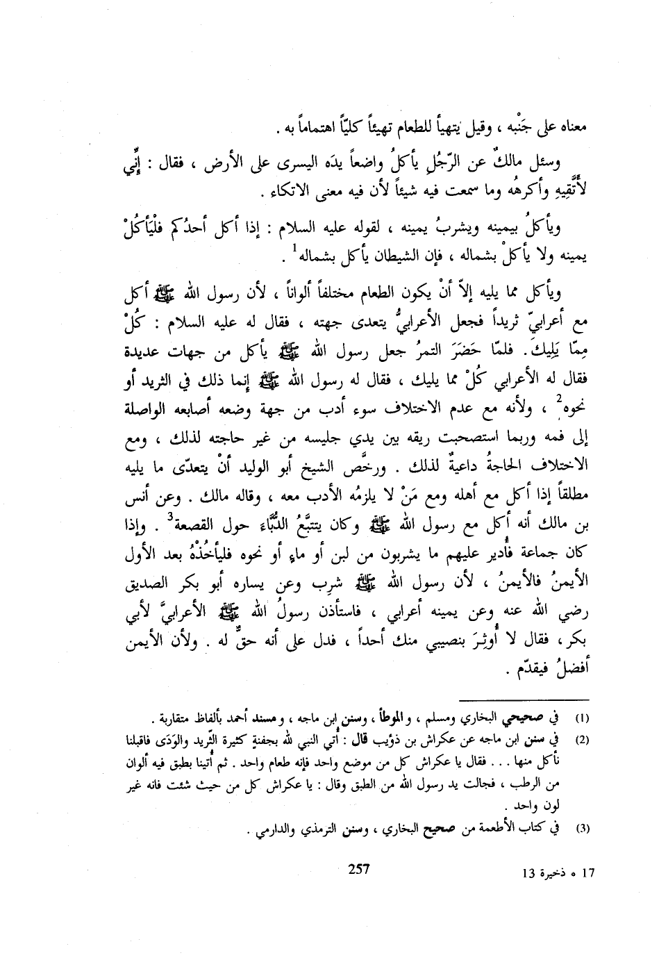 (إِذا أكل أحدكُم فَليَأْكُل يَمِينه وَلَا يَأْكُلْ بِشِمَالِهِ فَإِنَّ الشَّيْطَانَ يَأْكُلُ بِشِمَالِهِ) وَيَأْكُلُ مِمَّا يَلِيهِ إِلَّا أَنْ يَكُونَ الطَّعَامُ مُخْتَلِفًا أَلْوَانًا لِأَنَّ رَسُولَ اللَّهِ - صَلَّى اللَّهُ عَلَيْهِ وَسَلَّم َ - أَكَلَ مَعَ أَعْرَابِيٍّ ثَرِيدًا فَجَعَلَ الْأَعْرَابِيُّ يَتَعَدَّى جِهَته فَقَالَ لَهُ - صَلَّى اللَّهُ عَلَيْهِ وَسَلَّم َ - كُلْ مِمَّا يَلِيكَ فَلَمَّا حَضَرَ التَّمْرُ جَعَلَ رَسُول الله - صَلَّى اللَّهُ عَلَيْهِ وَسَلَّم َ - يَأْكُل من جِهَات عديد فَقَالَ لَهُ الْأَعْرَابِيُّ كُلْ مِمَّا يَلِيكَ فَقَالَ لَهُ رَسُولُ اللَّهِ - صَلَّى اللَّهُ عَلَيْهِ وَسَلَّم َ - إِنَّمَا ذَلِكَ فِي الثَّرِيدِ أَوْ نَحْوِهِ وَلِأَنَّهُ مَعَ عَدَمِ الِاخْتِلَافِ سُوءُ أَدِبٍ مِنْ جِهَةِ وَضْعِهِ أَصَابِعَهُ الْوَاصِلَةَ إِلَى فَمِهِ وَرُبَّمَا اسْتَصْحَبَتْ رِيقَهُ بَيْنَ يَدَيْ جَلِيسِهِ مِنْ غَيْرِ حَاجَتِهِ لِذَلِكَ وَمَعَ الِاخْتِلَافِ الْحَاجَةُ دَاعِيَةٌ لِذَلِكَ وَرَخَّصَ الشَّيْخُ أَبُو الْوَلِيدِ أَنْ يَتَعَدَّى مَا يَلِيهِ مُطْلَقًا إِذَا أَكَلَ مَعَ أَهْلِهِ وَمَعَ مَنْ لَا يلْزمه الْأَدَب مَعَه وَقَالَ مَالِكٌ وَعَنْ أَنَسِ بْنِ مَالِكٍ أَنَّهُ أَكَلَ مَعَ رَسُولِ اللَّهِ - صَلَّى اللَّهُ عَلَيْهِ وَسَلَّم َ - وَكَانَ يَتَتَبَّعُ الدُّبَّاءَ حَوْلَ الْقَصْعَةِ وَإِذَا كَانَ جَمَاعَةٌ فَأُدِيرَ عَلَيْهِمْ مَا يَشْرَبُونَ مِنْ لَبَنٍ أَوْ مَاءٍ أَوْ نَحْوِهِ فَلْيَأْخُذْهُ بَعْدَ الْأَوَّلِ الْأَيْمَنُ فَالْأَيْمَنُ لِأَنَّ رَسُولَ اللَّهِ - صَلَّى اللَّهُ عَلَيْهِ وَسَلَّم َ - شَرِبَ وَعَنْ يَسَارِهِ أَبُو بَكْرٍ الصِّدِّيقُ رَضِيَ اللَّهُ عَنْهُ وَعَنْ يَمِينِهِ أَعْرَابِيٌّ فَاسْتَأْذَنَ رَسُولُ الله - صَلَّى اللَّهُ عَلَيْهِ وَسَلَّم َ - الأعربي لِأَبِي بَكْرٍ فَقَالَ لَا أُوثِرُ بِنَصِيبِي مِنْكَ أحد فَدَلَّ عَلَى أَنَّهُ حَقٌّ لَهُ وَلِأَنَّ الْأَيْمَنَ أفضل فَيقدم