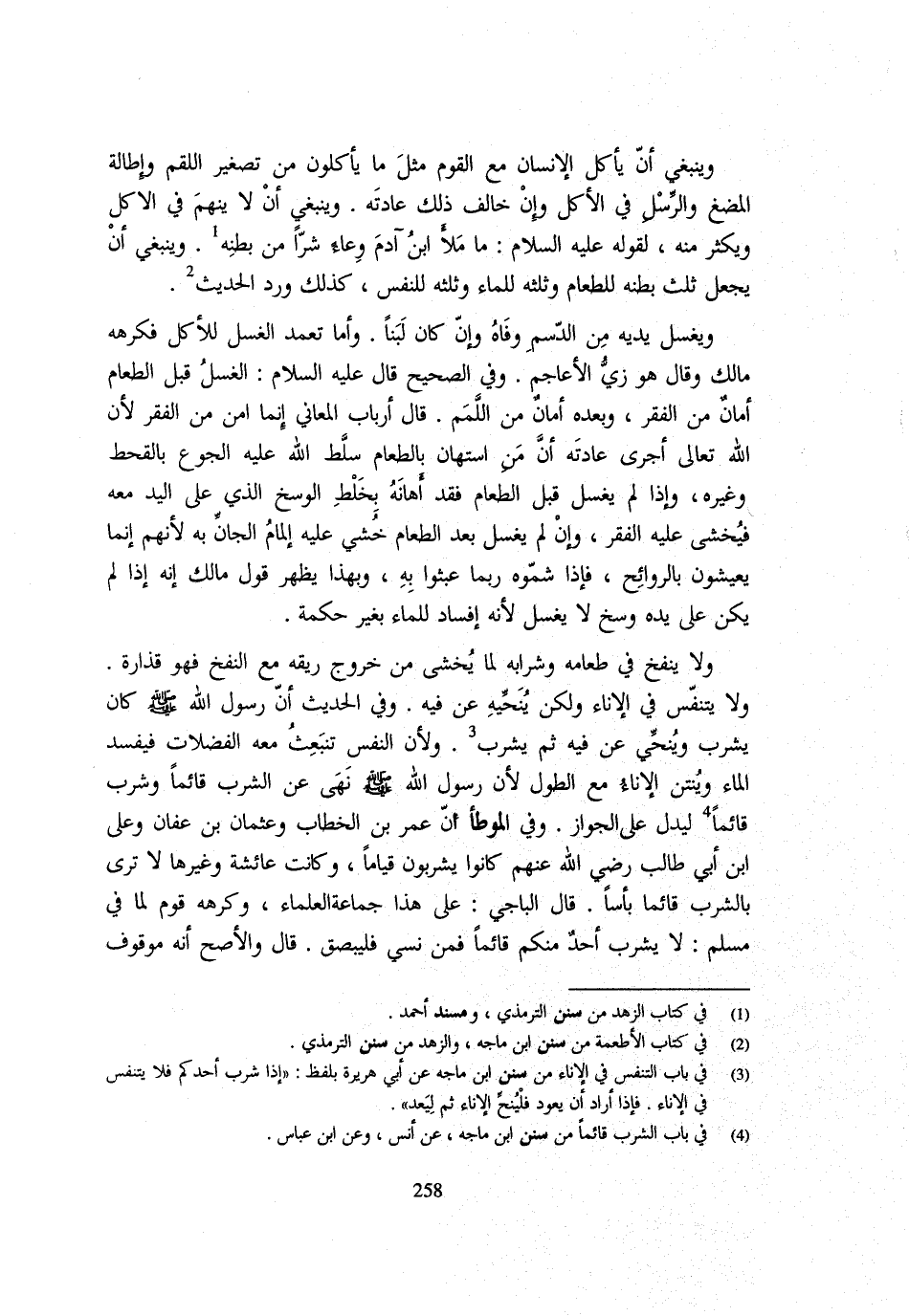 (مَا مَلَأَ ابْنُ آدَمَ وِعَاءً شَرًّا مِنْ بَطْنِهِ) وَيَنْبَغِي أَنْ يَجْعَلَ ثُلُثَ بَطْنِهِ لِلطَّعَامِ وَثُلُثَهُ لِلْمَاءِ وَثُلُثَهُ لِلنَّفَسِ كَذَلِكَ وَرَدَ الْحَدِيثُ وَيَغْسِلُ يَدَيْهِ مِنَ الدَّسَمِ وَفَاهُ وَإِنْ كَانَ لَبَنًا وَأَمَّا تَعَمُّدُ الْغَسْلِ لِلْأَكْلِ فَكَرِهَهُ مَالِكٌ وَقَالَ زِيّ الْأَعَاجِم وَفِي الصَّحِيح قَالَ - صَلَّى اللَّهُ عَلَيْهِ وَسَلَّم َ - الْغَسْلُ قَبْلَ الطَّعَامِ أَمَانٌ مِنَ الْفَقْرِ وَبَعْدَهُ أَمَانٌ مِنَ اللَّمَمِ قَالَ أَرْبَابُ الْمَعَانِيَ إِنَّمَا أَمْنٌ مِنَ الْفَقْرِ لِأَنَّ اللَّهَ تَعَالَى أَجْرَى عَادَتَهُ أَنَّ مَنِ اسْتَهَانَ بِالطَّعَامِ سَلَّطَ اللَّهُ عَلَيْهِ الْجُوعَ بِالْقَحْطِ وَغَيْرِهِ وَإِذَا لَمْ يَغْسِلْ قَبْلَ الطَّعَامِ فَقَدْ أَهَانَهُ بِخَلْطِ الْوَسَخِ الَّذِي عَلَى الْيَدِ مَعَهُ فَيُخْشَى عَلَيْهِ الْفَقْرُ وَإِنْ لَمْ يَغْسِلْ بَعْدَ الطَّعَامِ خُشِيَ عَلَيْهِ إِلْمَامُ الْجَانِّ بِهِ لِأَنَّهُمْ إِنَّمَا يَعِيشُونَ بِالرَّوَائِحِ فَإِذَا شَمُّوهُ رُبَّمَا عَبَثُوا بِهِ وَبِهَذَا يَظْهَرُ قَوْلُ مَالِكٍ إِنَّهُ إِذَا لَمْ يَكُنْ عَلَى يَدِهِ وَسَخٌ لَا يَغْسِلُ لِأَنَّهُ إِفْسَادٌ لِلْمَاءِ بِغَيْرِ حِكْمَةٍ وَلَا يَنْفُخُ فِي طَعَامِهِ وَشَرَابِهِ لِمَا يُخْشَى مِنْ خُرُوجِ رِيقِهِ مَعَ النَّفْخِ فَهُوَ قَذَارَةٌ وَلَا يَتَنَفَّسُ فِي الْإِنَاءِ وَلَكِنْ يُنَحِّيهِ عَنْ فِيهِ وَفِي الْحَدِيثِ أَنَّ رَسُولَ اللَّهِ - صَلَّى اللَّهُ عَلَيْهِ وَسَلَّم َ - كَانَ يَشْرَبُ وَيُنَحِّي عَنْ فِيهِ ثُمَّ يَشْرَبُ وَلِأَنَّ النَّفَسَ تَنْبَعِثُ مَعَهُ الْفَضَلَاتُ فَيُفْسِدُ الْمَاءَ وَيُنْتِنُ الْإِنَاءَ مَعَ الطُّولِ لِأَنَّ رَسُولَ اللَّهِ - صَلَّى اللَّهُ عَلَيْهِ وَسَلَّم َ - نَهَى عَنِ الشُّرْبِ قَائِمًا وَشَرِبَ قَائِمًا لِيَدُلَّ عَلَى الْجَوَازِ وَفِي الْمُوَطَّأِ أَنَّ عُمَرَ بْنَ الْخطاب وَعُثْمَان بن عَفَّان وَعلي ابْن أَبِي طَالِبٍ رَضِيَ اللَّهُ عَنْهُمْ كَانُوا يَشْرَبُونَ قِيَامًا وَكَانَتْ عَائِشَةُ وَغَيْرُهَا لَا تَرَى بِالشُّرْبِ قَائِمًا بَأْسًا قَالَ الْبَاجِيُّ عَلَى هَذَا جَمَاعَةُ الْعُلَمَاءِ وَكَرِهَهُ قَوْمٌ لِمَا فِي مُسْلِمٍ لَا يشربأحد مِنْكُمْ قَائِمًا فَمَنْ نَسِيَ فَلْيَبْصُقْ قَالَ وَالْأَصَحُّ أَنه مَوْقُوف