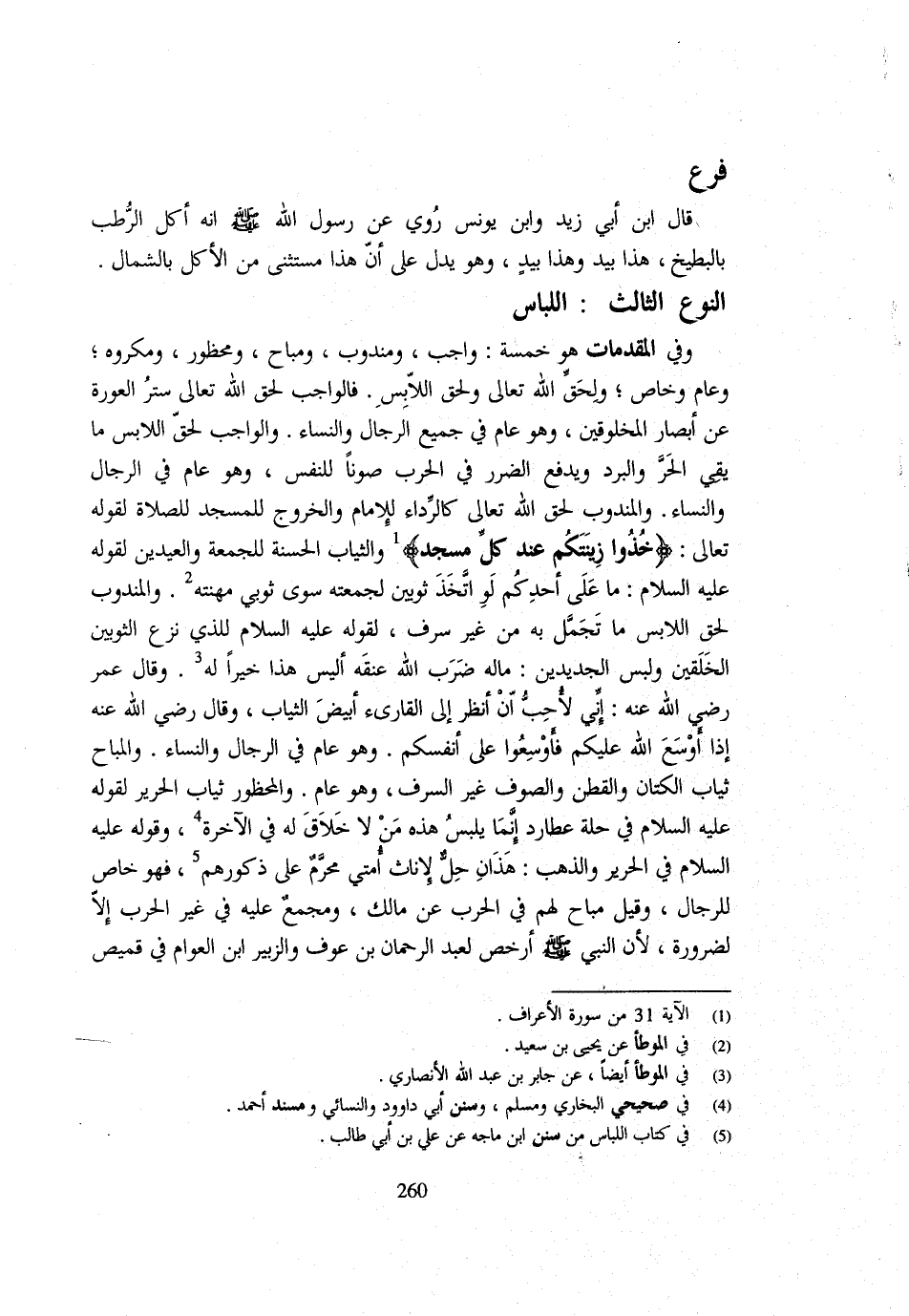 وَفِي الْمُقَدِّمَاتِ هُوَ خَمْسَةٌ وَاجِبٌ وَمَنْدُوبٌ وَمُبَاحٌ وَمَحْظُورٌ وَمَكْرُوهٌ وَعَامٌّ وَخَاصٌّ وَلِحَقِّ اللَّهِ تَعَالَى وَلِحَقِّ اللَّابِسِ فَالْوَاجِبُ لِحَقِّ اللَّهِ تَعَالَى سَتْرُ الْعَوْرَةِ عَنْ أَبْصَارِ الْمَخْلُوقِينَ وَهُوَ عَامٌّ فِي جَمِيعِ الرِّجَال وَالنِّسَاء وَالْوَاجِب لحق الملابس مَا يَقِي الْحَرَّ وَالْبَرْدَ وَيَدْفَعُ الضَّرَرَ فِي الْحَرْبِ صَوْنًا لِلنَّفْسِ وَهُوَ عَامٌّ فِي الرِّجَالِ وَالنِّسَاءِ وَالْمَنْدُوبُ لِحَقِّ اللَّهِ تَعَالَى كَالرِّدَاءِ لِلْإِمَامِ وَالْخُرُوجِ لِلْمَسْجِدِ لِلصَّلَاةِ لِقَوْلِهِ تَعَالَى {خُذُوا زِينَتَكُمْ عِنْد كل مَسْجِد} وَالثيَاب الْحَسَنَة للْجُمُعَة وَالْعِيدَيْنِ لقَوْله - صَلَّى اللَّهُ عَلَيْهِ وَسَلَّم َ - مَا عَلَى أَحَدِكُمْ لَوِ اتَّخَذَ ثَوْبَيْنِ لِجُمُعَتِهِ سِوَى ثَوْبَيْ مِهْنَتِهِ وَالْمَنْدُوبُ لِحَقِّ اللَّابِسِ مَا تجمل بِهِ من غير سرف لقَوْله - صَلَّى اللَّهُ عَلَيْهِ وَسَلَّم َ - لِلَّذِي نَزَعَ الثَّوْبَيْنِ الْخَلَقَيْنِ وَلَبِسَ الْجَدِيدَيْنِ مَا لَهُ ضَرَبَ اللَّهُ عُنُقَهُ أَلَيْسَ هَذَا خَيْرًا لَهُ وَقَالَ عُمَرُ رَضِيَ اللَّهُ عَنْهُ إِنِّي لَأُحِبُّ أَنْ أَنْظُرَ إِلَى الْقَارِئِ أَبْيَضَ الثِّيَابِ وَقَالَ رَضِيَ اللَّهُ عَنْهُ إِذَا أَوْسَعَ اللَّهُ عَلَيْكُمْ فَأَوْسِعُوا عَلَى أَنْفُسِكُمْ وَهُوَ عَامٌّ فِي الرِّجَال وَالنِّسَاء والمباح ثِيَاب الْكتاب والقط وَالصُّوفِ غَيْرَ السُّرُفِ وَهُوَ عَامٌّ وَالْمَحْظُورُ ثِيَابُ الْحَرِير لقَوْل - صَلَّى اللَّهُ عَلَيْهِ وَسَلَّم َ - فِي حُلَّةِ عُطَارِدٍ إِنَّمَا يَلْبَسُ هَذِهِ مَنْ لَا خلاق لَهُ فِي الْآخِرَة وَقَوله - صَلَّى اللَّهُ عَلَيْهِ وَسَلَّم َ - فِي الْحَرِيرِ وَالذَّهَبِ هَذَانِ حِلٌّ لِإِنَاثِ أُمَّتِي مُحَرَّمٌ عَلَى ذُكُورِهِمْ فَهُوَ خَاصٌّ لِلرِّجَالِ وَقِيلَ مُبَاحٌ لَهُمْ فِي الْحَرْبِ عَنْ مَالِكٍ وَمُجْمَعٌ عَلَيْهِ فِي غَيْرِ الْحَرْبِ إِلَّا لِضَرُورَةٍ لِأَنَّ النَّبِي - صَلَّى اللَّهُ عَلَيْهِ وَسَلَّم َ - أرخص لعبد الرَّحْمَن بن عَوْف وَالزُّبَيْر ابْن الْعَوَّامِ فِي قَمِيصِ