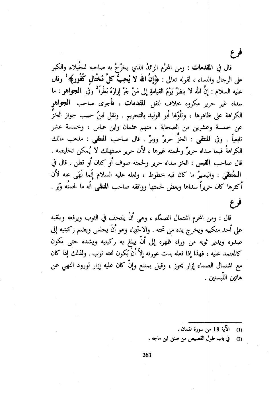 قَالَ فِي الْمُقَدِّمَاتِ وَمِنَ الْمُحَرَّمِ الزَّائِدُ الَّذِي يَخْرُجُ بِهِ صَاحِبُهُ لِلْخُيَلَاءِ وَالْكِبْرِ عَلَى الرِّجَالِ وَالنِّسَاءِ لِقَوْلِهِ تَعَالَى {إِنَّ اللَّهَ لَا يحب كل مختال كفور} وَقَالَ - صَلَّى اللَّهُ عَلَيْهِ وَسَلَّم َ -