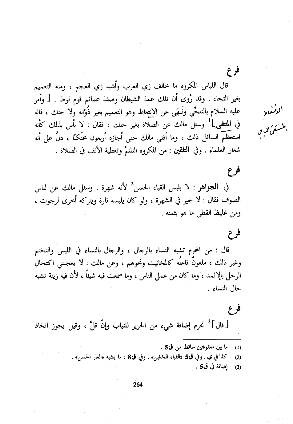 قَالَ اللِّبَاسُ الْمَكْرُوهُ مَا خَالَفَ زِيَّ الْعَرَبِ وَأَشْبَهَ زِيَّ الْعَجَمِ وَمِنْهُ التَّعْمِيمُ بِغَيْرِ الْتِحَاءٍ وَقَدْ رُويَ أَنَّ تِلْكَ عِمَّةُ الشَّيْطَانِ وَصفَة عمائم قوم لوط وَأمر - صَلَّى اللَّهُ عَلَيْهِ وَسَلَّم َ - بالتلحي وَنَهَى عَنِ الِانْتِعَاطِ وَهُوَ التَّعْمِيمُ بِغَيْرِ ذُؤَابَةٍ وَلَا حَنَكٍ قَالَهُ فِي الْمُنْتَقَى وَسُئِلَ مَالِكٌ عَنِ الصَّلَاةِ بِغَيْرِ حَنَكٍ فَقَالَ لَا بَأْسَ بِذَلِكَ كَأَنَّهُ اسْتَعْظَمَ السَّائِلُ ذَلِكَ وَمَا أَفْتَى مَالِكٌ حَتَّى أَجَازَهُ أَرْبَعُونَ مُحَنَّكًا دَلَّ عَلَى أَنَّهُ شِعَارُ الْعُلَمَاءِ وَفِي التَّلْقِينِ مِنَ الْمَكْرُوهِ التَّلَثُّمُ وَتَغْطِيَةُ الْأَنْفِ فِي الصَّلَاةِ