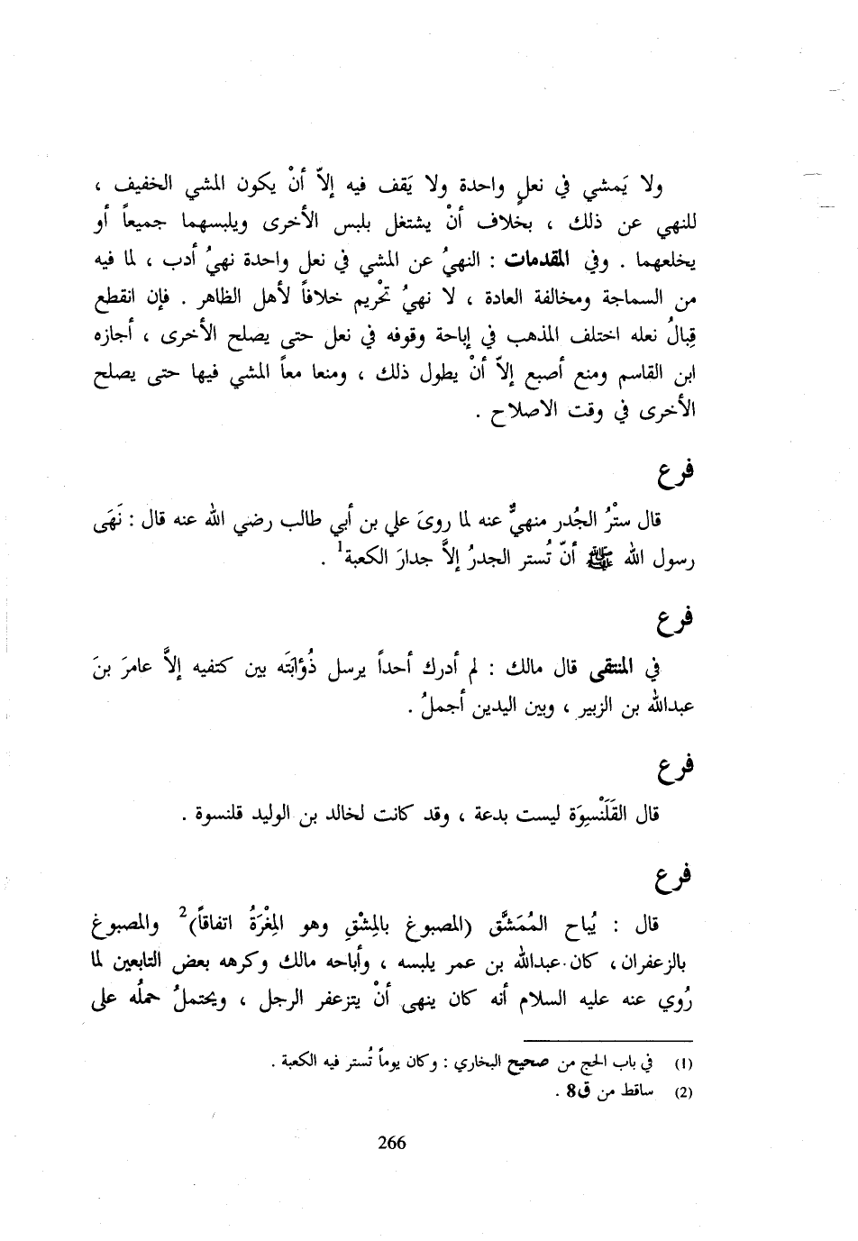 وَلَا يمشي فِي نعل وَاحِد وَلَا يقف فِيهِ إِلَّا أَنْ يَكُونَ الْمَشْيُ الْخَفِيفُ لِلنَّهْيِ عَنْ ذَلِكَ بِخِلَافِ أَنْ يَشْتَغِلَ بِلُبْسِ الْأُخْرَى وَيَلْبَسَهُمَا جَمِيعًا أَوْ يَخْلَعَهُمَا وَفِي الْمُقَدِّمَاتِ النَّهْيُ عَنِ الْمَشْيِ فِي نَعْلٍ وَاحِدَةٍ نَهْيُ أَدَبٍ لِمَا فِيهِ مِنَ السَّمَاجَةِ وَمُخَالَفَةِ الْعَادَةِ لَا نَهْيُ تَحْرِيمٍ خِلَافًا لِأَهْلِ الظَّاهِرِ فَإِنِ انْقَطَعَ قُبَالُ نَعْلِهِ اخْتَلَفَ الْمَذْهَبُ فِي إِبَاحَةِ وُقُوفِهِ فِي نَعْلٍ حَتَّى يُصْلِحَ الْأُخْرَى أَجَازَهُ ابْنُ الْقَاسِمِ وَمنع أصْبع إِلَّا أَنْ يَطُولَ ذَلِكَ وَمَنَعَا مَعًا الْمَشْيَ فِيهَا حَتَّى يُصْلِحَ الْأُخْرَى فِي وَقْتِ الْإِصْلَاحِ