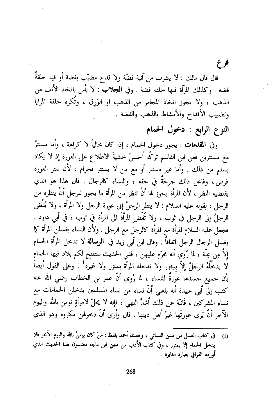 (لَا يَنْظُرُ الرَّجُلُ إِلَى عَوْرَةِ الرَّجُلِ وَلَا الْمَرْأَةِ وَلَا يُفْضِ الرَّجُلُ إِلَى الرَّجُلِ فِي ثَوْبٍ وَلَا تُفْضِ الْمَرْأَةُ إِلَى الْمَرْأَةِ فِي ثوب) فِي أبي دَاوُد فَجعل - صَلَّى اللَّهُ عَلَيْهِ وَسَلَّم َ - الْمَرْأَةَ مَعَ الْمَرْأَةِ كَالرَّجُلِ مَعَ الرَّجُلِ وَلِأَنَّ النِّسَاءَ يُغَسِّلْنَ الْمَرْأَةَ كَمَا يُغَسِّلُ الرِّجَالُ الرَّجُلَ اتِّفَاقًا وَقَالَ ابْنُ أَبِي زَيْدٍ فِي الرِّسَالَةِ لَا تَدْخُلُ الْمَرْأَةُ الْحَمَّامَ إِلَّا مِنْ عِلَّةٍ لِمَا رُوِيَ أَنَّهُ مُحَرَّمٌ عَلَيْهِنَّ فَفِي الْحَدِيثِ