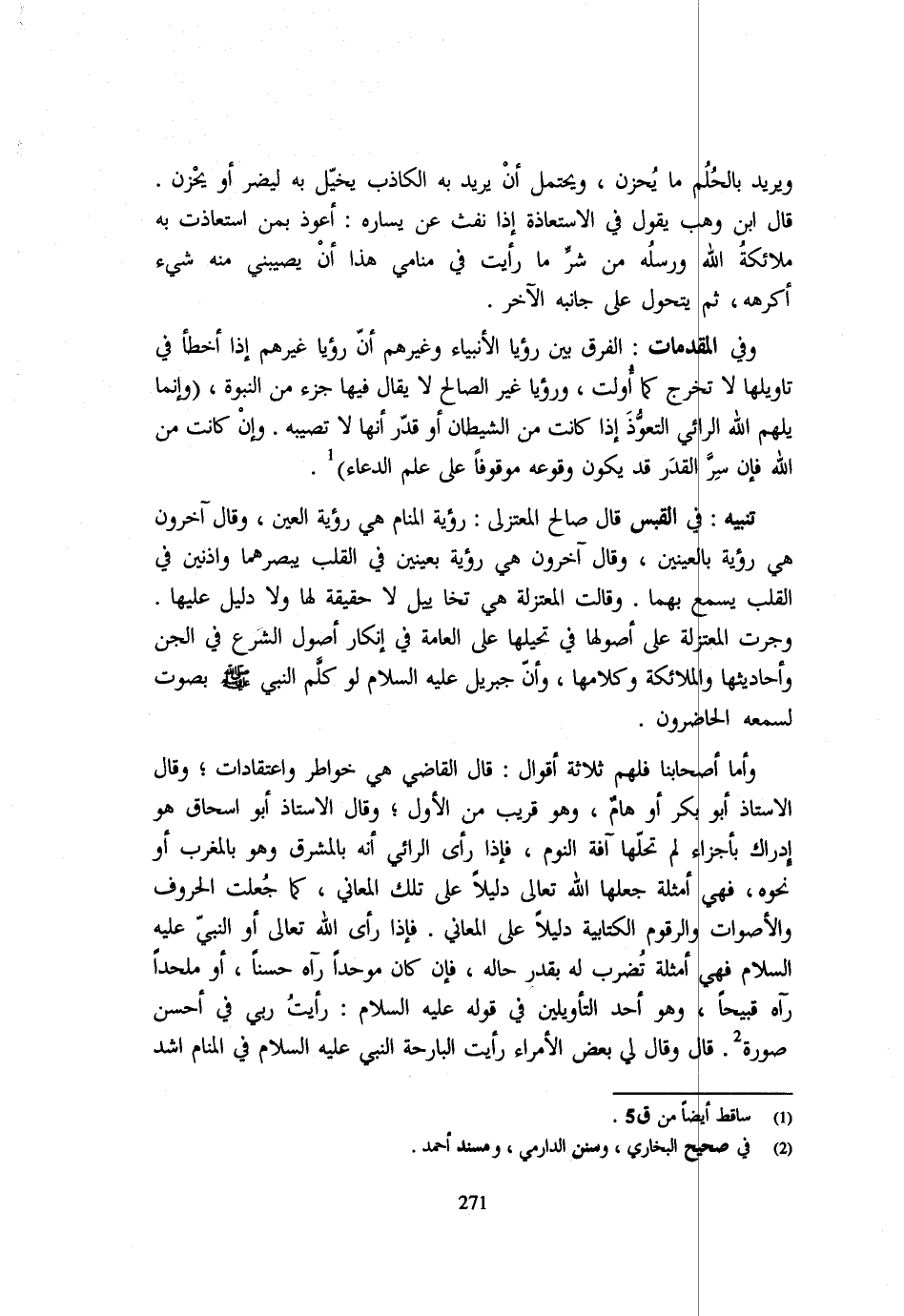 وَيُرِيدُ بِالْحُلْمِ مَا يُحْزِنُ وَيُحْتَمَلُ أَنْ يُرِيدَ بِهِ الْكَاذِب يخيل بِهِ ليضر أَبُو يُحْزِنَ قَالَ ابْنُ وَهْبٍ يَقُولُ فِي الِاسْتِعَاذَةِ إِذَا نَفَثَ عَنْ يَسَارِهِ أَعُوذُ بِمَنِ اسْتَعَاذَتْ بِهِ مَلَائِكَةُ اللَّهِ وَرُسُلُهُ مِنْ شَرِّ مَا رَأَيْتُ فِي مَنَامِي هَذَا أَنْ يُصِيبَنِي مِنْهُ شَيْءٌ أَكْرَهُهُ ثُمَّ يَتَحَوَّلُ عَلَى جَانِبِهِ الْآخَرِ وَفِي الْمُقَدِّمَاتِ الْفَرْقُ بَيْنَ رُؤْيَا الْأَنْبِيَاءِ وَغَيْرِهِمْ أَنَّ رُؤْيَا غَيْرِهِمْ إِذَا أَخْطَأَ فِي تَأْوِيلِهَا لَا تَخْرُجُ كَمَا أُوِّلَتْ وَرُؤْيَا غَيْرُ الصَّالِحِ لَا يُقَالُ فِيهَا جُزْءٌ مِنَ النُّبُوَّةِ وَإِنَّمَا يُلْهِمُ اللَّهُ الرَّائِيَ التَّعَوُّذَ إِذَا كَانَتْ مِنَ الشَّيْطَانِ أَوْ قَدَّرَ أَنَّهَا لَا تُصِيبُهُ وَإِنْ كَانَتْ مِنَ اللَّهِ فَإِنَّ سِرَّ الْقَدَرِ قَدْ يَكُونُ وُقُوعُهُ مَوْقُوفًا عَلَى عِلْمِ الدُّعَاءِ تَنْبِيهٌ فِي الْقَبَسِ قَالَ صَالِحٌ الْمُعْتَزِلِيُّ رُؤْيَةُ الْمَنَامِ هِيَ رُؤْيَةُ الْعَيْنِ وَقَالَ آخَرُونَ هِيَ رُؤْيَةٌ بِالْعَيْنَيْنِ وَقَالَ آخَرُونَ هِيَ رُؤْيَةٌ بِعَيْنَيْنِ فِي الْقَلْبِ يُبْصِرُهِمَا وَأُذُنَيْنِ فِي الْقَلْبِ يَسْمَعُ بِهِمَا وَقَالَت الْمُعْتَزلَة هِيَ تخاييل لَا حَقِيقَةَ لَهَا وَلَا دَلِيلَ عَلَيْهَا وَجَرَتِ الْمُعْتَزلَة على أُصُولهَا فِي تحليها عَلَى الْعَامَّةِ فِي إِنْكَارِ أُصُولِ الشَّرْعِ فِي الْجِنِّ وَأَحَادِيثِهَا وَالْمَلَائِكَةِ وَكَلَامِهَا وَأَنَّ جِبْرِيلَ عَلَيْهِ السَّلَامُ لَوْ كَلَّمَ النَّبِيَّ - صَلَّى اللَّهُ عَلَيْهِ وَسَلَّم َ - بِصَوْتٍ لَسَمِعَهُ الْحَاضِرُونَ وَأَمَّا أَصْحَابُنَا فَلَهُمْ ثَلَاثَةُ أَقْوَالٍ قَالَ الْقَاضِي هِيَ خَوَاطِرُ وَاعْتِقَادَاتٌ وَقَالَ الْأُسْتَاذُ أَبُو بَكْرٍ أَوْهَامٌ وَهُوَ قَرِيبٌ مِنَ الْأَوَّلِ وَقَالَ الْأُسْتَاذُ أَبُو إِسْحَاقَ هُوَ إِدْرَاكٌ بِأَجْزَاءٍ لَمْ تَحُلَّهَا آفَةُ النَّوْمِ فَإِذَا رَأَى الرَّائِي أَنَّهُ بِالْمَشْرِقِ وَهُوَ بِالْمَغْرِبِ أَوْ نَحْوِهِ فَهِيَ أَمْثِلَة جعله اللَّهُ تَعَالَى دَلِيلًا عَلَى تِلْكَ الْمَعَانِي كَمَا جُعِلَتِ الْحُرُوفُ وَالْأَصْوَاتُ وَالرُّقُومُ الْكِتَابِيَّةُ دَلِيلًا عَلَى الْمَعَانِي فَإِذَا رَأَى اللَّهَ تَعَالَى أَوِ النَّبِيَّ - صَلَّى اللَّهُ عَلَيْهِ وَسَلَّم َ - فَهِيَ أَمْثِلَةٌ تُضْرَبُ لَهُ بِقَدْرِ حَالِهِ فَإِنْ كَانَ مُوَحِّدًا رَآهُ حَسَنًا أَوْ مُلْحِدًا رَآهُ قبيحا وَهُوَ أحد التَّأْويلَيْنِ فِي قَوْله - صَلَّى اللَّهُ عَلَيْهِ وَسَلَّم َ - رَأَيْتُ رَبِّي فِي أَحْسَنِ صُورَةٍ قَالَ وَقَالَ لي بعض الْأُمَرَاء رَأَيْت البارحة النَّبِي - صَلَّى اللَّهُ عَلَيْهِ وَسَلَّم َ - فِي الْمَنَامِ أَشَدَّ