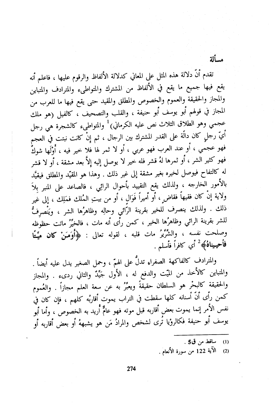 تَقَدَّمَ أَنَّ دَلَالَةَ هَذِهِ الْمُثُلِ عَلَى الْمَعَانِي كَدَلَالَةِ الْأَلْفَاظِ وَالرُّقُومِ عَلَيْهَا فَاعْلَمْ أَنَّهُ يَقَعُ فِيهَا جَمِيعُ مَا يَقَعُ فِي الْأَلْفَاظِ مِنَ الْمُشْتَرَكِ وَالْمُتَوَاطِئِ وَالْمُتَرَادِفِ وَالْمُتَبَايِنِ وَالْمَجَازِ وَالْحَقِيقَةِ وَالْعُمُومِ وَالْخُصُوصِ وَالْمُطْلَقِ وَالْمُقَيَّدِ حَتَّى يَقَعَ فِيهَا مَا لِلْعَرَبِ مِنَ الْمَجَازِ فِي قَوْلِهِمْ أَبُو يُوسُف أَبُو حنيفَة وَالْقلب والتصحيف كالفيل هُوَ مَلِكٌ عَجَمِيٌّ وَهُوَ الطَّلَاقُ الثَّلَاثُ نَصَّ عَلَيْهِ الْكَرْمَانِيُّ وَالْمُتَوَاطِئُ كَالشَّجَرَةِ هِيَ رَجُلٌ أَيُّ رَجُلٍ كَانَ دَالَّةً عَلَى الْقَدْرِ الْمُشْتَرِكِ بَيْنَ الرِّجَالِ ثُمَّ إِنْ كَانَتْ نَبَتَتْ فِي الْعَجَمِ فَهُوَ عَجَمِيٌّ أَوْ عِنْدَ الْعَرَبِ فَهُوَ عَرَبِيُّ أَوْ لَا ثَمَرَ لَهَا فَلَا خَيْرَ فِيهِ أَولهَا شَوْكٌ فَهُوَ كَثِيرُ الشَّرِّ أَوْ ثَمَرُهَا لَهُ قِشْرٌ فَلَهُ خَيْرٌ لَا يُوصَلُ إِلَيْهِ إِلَّا بَعْدَ مَشَقَّةٍ أَوْ لَا قِشْرَ لَهُ كَالتُّفَّاحِ فَيُوصَلُ لِخَيْرِهِ بِغَيْرِ مَشَقَّةٍ إِلَى غَيْرِ ذَلِكَ وَهَذَا هُوَ الْمُقَيَّدُ وَالْمُطْلَقُ فَيُقَيَّدُ بِالْأُمُورِ الْخَارِجَةِ وَلذَلِك يَقع التقيد بِأَحْوَالِ الرَّائِي فَالصَّاعِدُ عَلَى الْمِنْبَرِ بِلَا وِلَايَةٍ إِنْ كَانَ فَقِيهًا فَقَاضٍ أَوْ أَمِيرًا فَوَالٍ أَوْ مِنْ بَيْتِ الْمَلِكِ فَمَلِكٌ إِلَى غَيْرِ ذَلِكَ وَلِذَلِكَ يَنْصَرِفُ لِلْخَيْرِ بِقَرِينَةِ الرَّائِي وَحَالِهِ وَظَاهِرُهَا الشَّرُّ وَيَنْصَرِفُ لِلشَّرِّ بِقَرِينَةِ الرَّائِي وَظَاهِرُهَا الْخَيْرُ كَمَنْ رَأَى أَنَّهُ مَاتَ فَالْخَيِّرُ مَاتَتْ حُظُوظُهُ وَصَلَحَتْ نَفْسُهُ وَالشِّرِّيرُ مَاتَ قَلْبُهُ لِقَوْلِهِ تَعَالَى {أَو من كَانَ مَيتا فأحييناه} اي كَافِر فَأَسْلَمَ وَالْمُتَرَادِفُ كَالْفَاكِهَةِ الصَّفْرَاءِ تَدُلُّ عَلَى الْهَمِّ وَحَمْلُ الصَّغِيرِ يَدُلُّ عَلَيْهِ أَيْضًا وَالْمُتَبَايِنُ كَالْأَخْذِ مِنَ الْمَيِّتِ وَالدَّفْعِ لَهُ الْأَوَّلُ جَيِّدٌ وَالثَّانِي رَدِيءٌ وَالْمَجَازُ وَالْحَقِيقَةُ كَالْبَحْرِ هُوَ السُّلْطَانُ حَقِيقَةً وَيُعَبَّرُ بِهِ عَنْ سَعَةِ الْعِلْمِ مَجَازًا وَالْعُمُومُ كَمَنْ رَأَى أَنَّ أَسْنَانَهُ كُلَّهَا سَقَطَتْ فِي التُّرَابِ يَمُوتُ أَقَارِبُهُ كُلُّهُمْ فَإِنْ كَانَ فِي نَفْسِ الْأَمْرِ إِنَّمَا يَمُوتُ بَعْضُ أَقَارِبِهِ قَبْلَ مَوْتِهِ فَهُوَ عَامٌّ أُرِيدَ بِهِ الْخُصُوصُ وَأَمَّا أَبُو يُوسُفَ أَبُو حَنِيفَةَ فَكَالرُّؤْيَا تُرَى لِشَخْصٍ وَالْمرَاد من هُوَ يُشبههُ أَبُو بعض أَقَاربه أَو