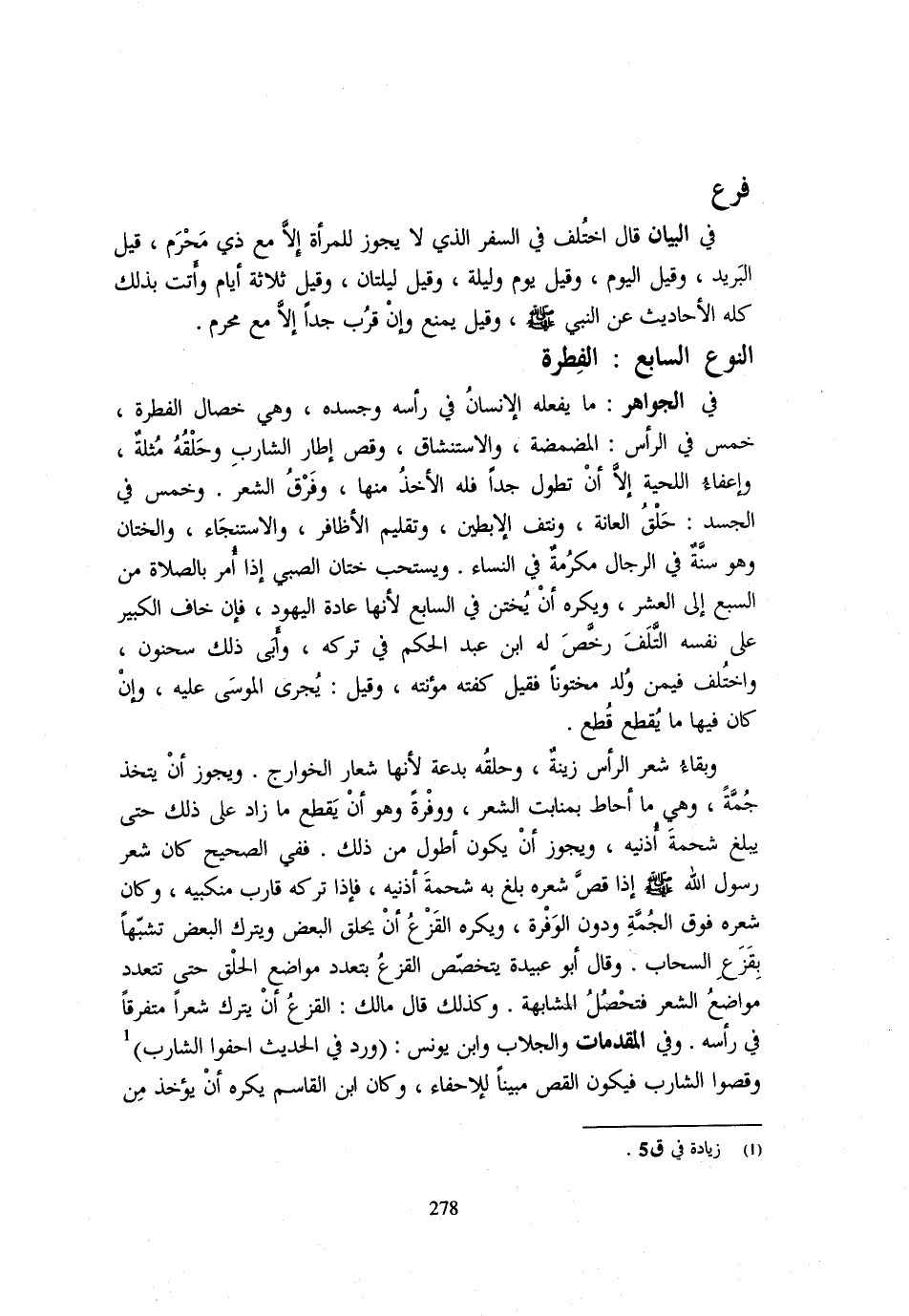 فِي الْبَيَانِ قَالَ اخْتُلِفَ فِي السَّفَرِ الَّذِي لَا يَجُوزُ لِلْمَرْأَةِ إِلَّا مَعَ ذِي مَحْرَمٍ قِيلَ الْبَرِيدُ وَقِيلَ الْيَوْمُ وَقِيلَ يَوْمٌ وَلَيْلَةٌ وَقِيلَ لَيْلَتَانِ وَقِيلَ ثَلَاثَةُ أَيَّامٍ وَأَتَتْ بِذَلِكَ كُلِّهِ الْأَحَادِيثُ عَنِ النَّبِيِّ - صَلَّى اللَّهُ عَلَيْهِ وَسَلَّم َ - وَقِيلَ يُمْنَعُ وَإِنْ قَرُبَ جِدًّا إِلَّا مَعَ مَحْرَمٍ