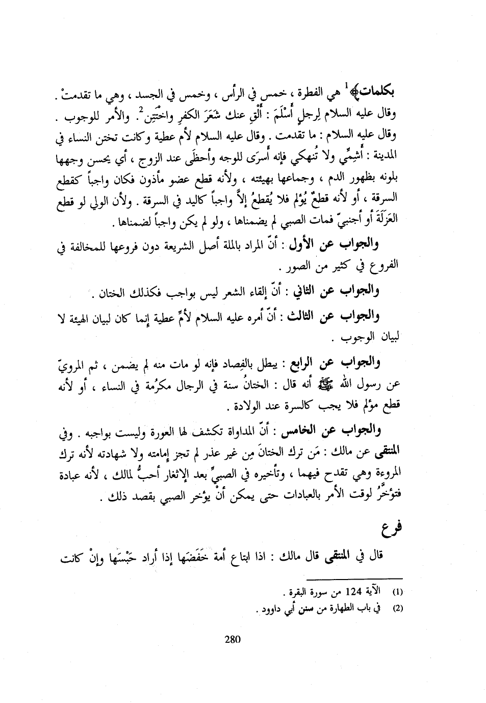 (الْخِتَانُ سُنَّةٌ فِي الرِّجَالِ مَكْرُمَةٌ فِي النِّسَاءِ أَوْ لِأَنَّهُ قَطْعٌ مُؤْلِمٌ فَلَا يَجِبُ كَالسُّرَّةِ عِنْدَ الْوِلَادَةِ) وَالْجَوَابُ عَنِ الْخَامِسِ أَنَّ الْمُدَاوَاةَ تُكْشَفُ لَهَا الْعَوْرَةُ وَلَيْسَتْ بِوَاجِبَةٍ وَفِي الْمُنْتَقَى عَنْ مَالِكٍ مَنْ تَرَكَ الْخِتَانَ مِنْ غَيْرِ عُذْرٍ لَمْ تَجُزْ إِمَامَتُهُ وَلَا شَهَادَتُهُ لِأَنَّهُ تَرَكَ الْمُرُوءَةَ وَهِيَ تَقْدَحُ فِيهِمَا وَتَأْخِيرُهُ فِي الصَّبِيِّ بَعْدَ الْإِثْغَارِ أَحَبُّ لِمَالِكٍ لِأَنَّهُ عِبَادَةٌ فَتُؤَخَّرُ لِوَقْتِ الْأَمْرِ بِالْعِبَادَاتِ حَتَّى يُمْكِنَ أَنْ يُؤَخَّرَ الصَّبِيُّ بِقَصْدِ ذَلِكَ
