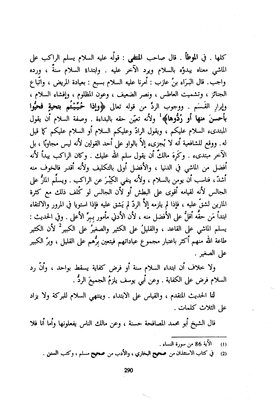 كلهَا فِي الْمُوَطَّأ قَالَ صَاحب المنتفى قَوْله - صَلَّى اللَّهُ عَلَيْهِ وَسَلَّم َ - يُسَلِّمُ الرَّاكِبُ عَلَى الْمَاشِي مَعْنَاهُ يَبْدَؤُهُ بِالسَّلَامِ وَيَرُدُّ الْآخَرُ عَلَيْهِ وَابْتِدَاءُ السَّلَامِ سُنَّةٌ وَرَدُّهُ وَاجِب قَالَ الْبَراء بن عَازِب أمرنَا - صَلَّى اللَّهُ عَلَيْهِ وَسَلَّم َ - بِسَبْعٍ بِعِيَادَةِ الْمَرِيضِ وَاتِّبَاعِ الْجَنَائِزِ وَتَشْمِيتِ الْعَاطِسِ وَنَصْرِ الضَّعِيفِ وَعَوْنِ الْمَظْلُومِ وَإِفْشَاءِ السَّلَامِ وَإِبْرَارِ الْقَسَمِ وَوُجُوبُ الرَّدِّ مِنْ قَوْله تَعَالَى {وَإِذَا حُيِّيتُمْ بِتَحِيَّةٍ فَحَيُّوا بِأَحْسَنَ مِنْهَا أَوْ رُدُّوهَا} وَلِأَنَّهُ تَعَيَّنَ حَقُّهُ بِالْبُدَاءَةِ وَصِفَةُ السَّلَامِ أَنْ يَقُولَ الْمُبْتَدِئُ السَّلَامُ عَلَيْكُمْ وَيَقُولَ الرَّادُّ وَعَلَيْكُمُ السَّلَامُ أَوِ السَّلَامُ عَلَيْكُمْ كَمَا قِيلَ لَهُ وَوَقَعَ لِلشَّافِعِيَّةِ أَنَّهُ لَا يُجْزِئُ إِلَّا بِالْوَاوِ عَلَى أَحَدِ الْقَوْلَيْنِ لِأَنَّهُ لَيْسَ مُجَاوِبًا بَلِ الْآخَرُ مُبْتَدِئٌ وَكَرِهَ مَالِكٌ أَنْ يَقُولَ سَلَّمَ اللَّهُ عَلَيْكَ وَكَانَ الرَّاكِبُ يَبْدَأُ لِأَنَّهُ أَفْضَلُ مِنَ الْمَاشِي فِي الدُّنْيَا وَالْأَفْضَلُ أَوْلَى بِالتَّكْلِيفِ وَلِأَنَّهُ أَقْدَرُ فَالْخَوْفُ مِنْهُ أَشَدُّ فَنَاسَبَ أَنْ يُؤمن بِالسَّلَامِ وَلِأَنَّهُ يَنْفِي الكبرعن الرَّاكِبِ وَيُسَلِّمُ الْمَارُّ عَلَى الْجَالِسِ لِأَنَّهُ لِقِيَامِهِ أَقْوَى عَلَى الْبَطْشِ أَوْ لِأَنَّ الْجَالِسَ لَوْ كُلِّفَ ذَلِكَ مَعَ كَثْرَةِ الْمَارِّينَ لَشَقَّ عَلَيْهِ فَإِذَا لَمْ يَلْزَمْهُ إِلَّا الرَّدُّ لَمْ يَشُقَّ عَلَيْهِ فَإِذَا اسْتَوَيَا فِي الْمُرُورِ وَالِالْتِقَاءِ ابْتَدَأَ مَنْ حَقُّهُ أَقَلُّ عَلَى الْأَفْضَلِ مِنْهُ لِأَنَّ الْأَدْنَى مَأْمُورٌ بِبِرِّ الْأَعْلَى وَفِي الْحَدِيثِ