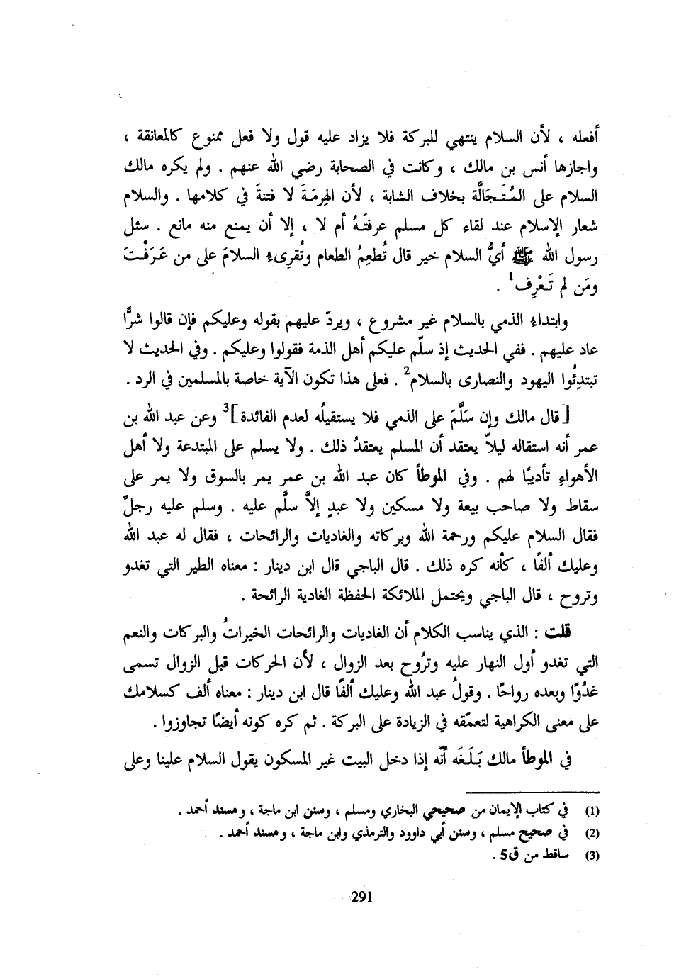 (لَا تَبْتَدِئُوا الْيَهُودَ وَالنَّصَارَى بِالسَّلَامِ) فَعَلَى هَذَا تَكُونُ الْآيَةُ خَاصَّةً بِالْمُسْلِمِينَ فِي الرَّدِّ قَالَ مَالِكٌ وَإِنْ سَلَّمَ عَلَى الذِّمِّيِّ فَلَا يَسْتَقِيلُهُ لِعَدَمِ الْفَائِدَةِ وَعَنْ عَبْدِ اللَّهِ بْنِ عمر أَنه استقاله لَيْلًا يَعْتَقِدَ أَنَّ الْمُسْلِمَ يَعْتَقِدُ ذَلِكَ وَلَا يُسَلِّمُ عَلَى الْمُبْتَدِعَةِ وَلَا أَهْلِ الْأَهْوَاءِ تَأْدِيبًا لَهُمْ وَفِي الْمُوَطَّأِ كَانَ عَبْدُ اللَّهِ بْنُ عُمَرَ يَمُرُّ بِالسُّوقِ وَلَا يَمُرُّ عَلَى سَقَاطٍ وَلَا صَاحِبِ بِيعَةٍ وَلَا مِسْكِينٍ وَلَا عَبْدٍ إِلَّا سَلَّمَ عَلَيْهِ وَسَلَّمَ عَلَيْهِ رَجُلٌ فَقَالَ السَّلَامُ عَلَيْكُمْ وَرَحْمَةُ اللَّهِ وَبَرَكَاتُهُ وَالْغَادِيَاتُ وَالرَّائِحَاتُ فَقَالَ لَهُ عَبْدُ اللَّهِ وَعَلَيْكَ أَلْفًا كَأَنَّهُ كَرِهَ ذَلِكَ قَالَ الْبَاجِيُّ قَالَ ابْنُ دِينَارٍ مَعْنَاهُ الطَّيْرُ الَّتِي تَغْدُو وَتَرُوحُ قَالَ الْبَاجِيُّ وَيُحْتَمَلُ الْمَلَائِكَةُ الْحَفَظَةُ الْغَادِيَةُ الرَّائِحَةُ قُلْتُ الَّذِي يُنَاسِبُ الْكَلَامَ أَنَّ الْغَادِيَاتِ وَالرَّائِحَاتِ الْخَيْرَاتُ وَالْبَرَكَاتُ وَالنِّعَمُ الَّتِي تَغْدُو أَوَّلَ النَّهَارِ عَلَيْهِ وَتَرُوحُ بَعْدَ الزَّوَالِ، لِأَنَّ الْحَرَكَاتِ قَبْلَ الزَّوَالِ تُسَمَّى غَدْوًا وَبَعْدَهُ رَوَاحًا وَقَوْلُ عَبْدِ اللَّهِ وَعَلَيْكَ أَلْفًا قَالَ ابْنُ دِينَارٍ مَعْنَاهُ أَلْفٌ كَسَلَامِكَ عَلَى مَعْنَى الْكَرَاهِيَةِ لِتَعَمُّقِهِ فِي الزِّيَادَةِ عَلَى الْبَرَكَةِ ثمَّ كره كَونه أَيْضا تجاوزوا فِي الْمُوَطَّأ مَالك بَلَغَهُ أَنَّهُ إِذَا دَخَلَ الْبَيْتَ غَيْرَ الْمَسْكُونِ يَقُولُ السَّلَامُ عَلَيْنَا وَعَلَى