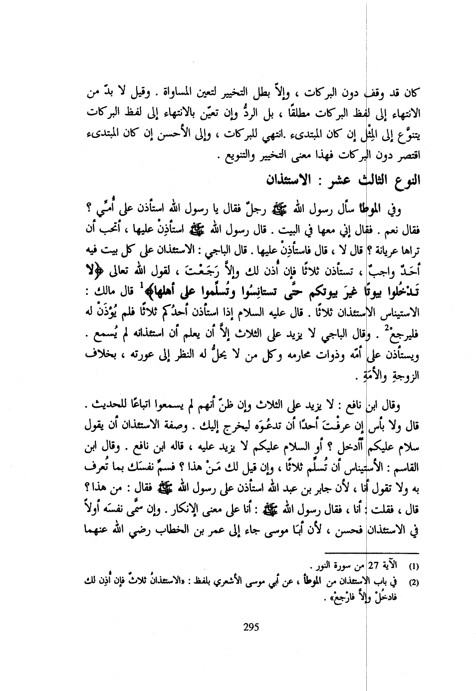 وَفِي الْمُوَطَّأِ سَأَلَ رَسُولَ اللَّهِ - صَلَّى اللَّهُ عَلَيْهِ وَسَلَّم َ - رَجُلٌ فَقَالَ يَا رَسُولَ اللَّهِ أَسْتَأْذِنُ عَلَى أُمِّي فَقَالَ نَعَمْ فَقَالَ إِنِّي مَعَهَا فِي الْبَيْتِ قَالَ رَسُولُ اللَّهِ - صَلَّى اللَّهُ عَلَيْهِ وَسَلَّم َ - اسْتَأْذِنْ عَلَيْهَا أَتُحِبُّ أَنْ تَرَاهَا عُرْيَانَةً قَالَ لَا قَالَ فَاسْتَأْذِنْ عَلَيْهَا قَالَ الْبَاجِيُّ الِاسْتِئْذَانُ عَلَى كُلِّ بَيْتٍ فِيهِ أَحَدٌ وَاجِبٌ تَسْتَأْذِنُ ثَلَاثًا فَإِنْ أُذِنَ لَكَ وَإِلَّا رَجَعْتَ لِقَوْلِ اللَّهِ تَعَالَى {لَا تَدْخُلُوا بُيُوتًا غَيْرَ بُيُوتِكُمْ حَتَّى تستأنسوا وتسلموا على أَهلهَا} قَالَ مَالك الاستيناس الاسْتِئْذَان ثَلَاثًا قَالَ - صَلَّى اللَّهُ عَلَيْهِ وَسَلَّم َ -