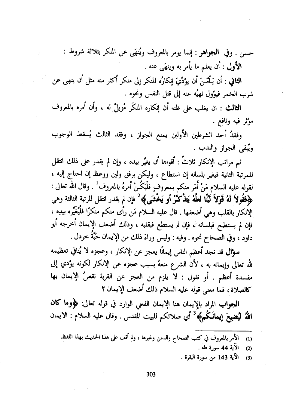 حسن وَفِي الْجَوَاهِر إِنَّمَا يومر بِالْمَعْرُوفِ وَيُنْهَى عَنِ الْمُنْكَرِ بِثَلَاثَةِ شُرُوطٍ الْأَوَّلُ أَنْ يَعْلَمَ مَا يَأْمُرُ بِهِ وَيَنْهَى عَنْهُ الثَّانِي أَنْ يَأْمَنَ أَنْ يُؤَدِّيَ إِنْكَارُهُ الْمُنْكَرَ إِلَى مُنْكَرٍ أَكْثَرَ مِنْهُ مِثْلَ أَنْ يَنْهَى عَن شرب الْخمر فيؤول نَهْيُهُ عَنْهُ إِلَى قَتْلِ النَّفْسِ وَنَحْوِهِ الثَّالِثُ أَن يغلب على ظَنّه أَن إِنْكَاره الْمُنكر مُزِيلٌ لَهُ وَأَنَّ أَمْرَهُ بِالْمَعْرُوفِ مُؤَثِّرٌ فِيهِ وَنَافِعٌ وَفَقْدُ أَحَدِ الشَّرْطَيْنِ الْأَوَّلَيْنِ يَمْنَعُ الْجَوَازَ وَفَقْدُ الثَّالِثِ يُسْقِطُ الْوُجُوبَ وَيَبْقَى الْجَوَازُ وَالنَّدْبُ ثُمَّ مَرَاتِبُ الْإِنْكَارِ ثَلَاثٌ أَقْوَاهَا أَنْ يُغَيِّرَ بِيَدِهِ وَإِنْ لَمْ يَقْدِرْ عَلَى ذَلِكَ انْتَقَلَ لِلْمَرْتَبَةِ الثَّانِيَةِ فَيُغَيِّرُ بِلِسَانِهِ إِنِ اسْتَطَاعَ وَلْيَكُنْ بِرِفْقٍ وَلِينٍ وَوَعْظٍ إِنِ احْتَاجَ إِلَيْهِ لِقَوْلِهِ - صَلَّى اللَّهُ عَلَيْهِ وَسَلَّم َ -