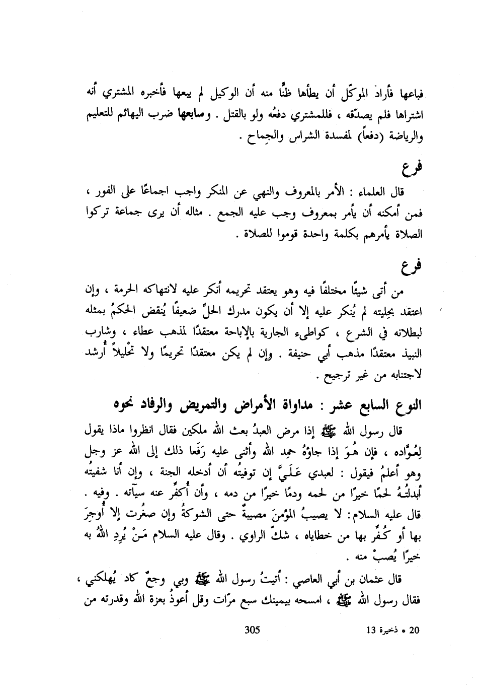 (النَّوْعُ السَّابِعَ عشر مداواة الْأَمْرَاض وَالتَّمْرِيضُ وَالرِّفَادُ نَحْوُهُ)