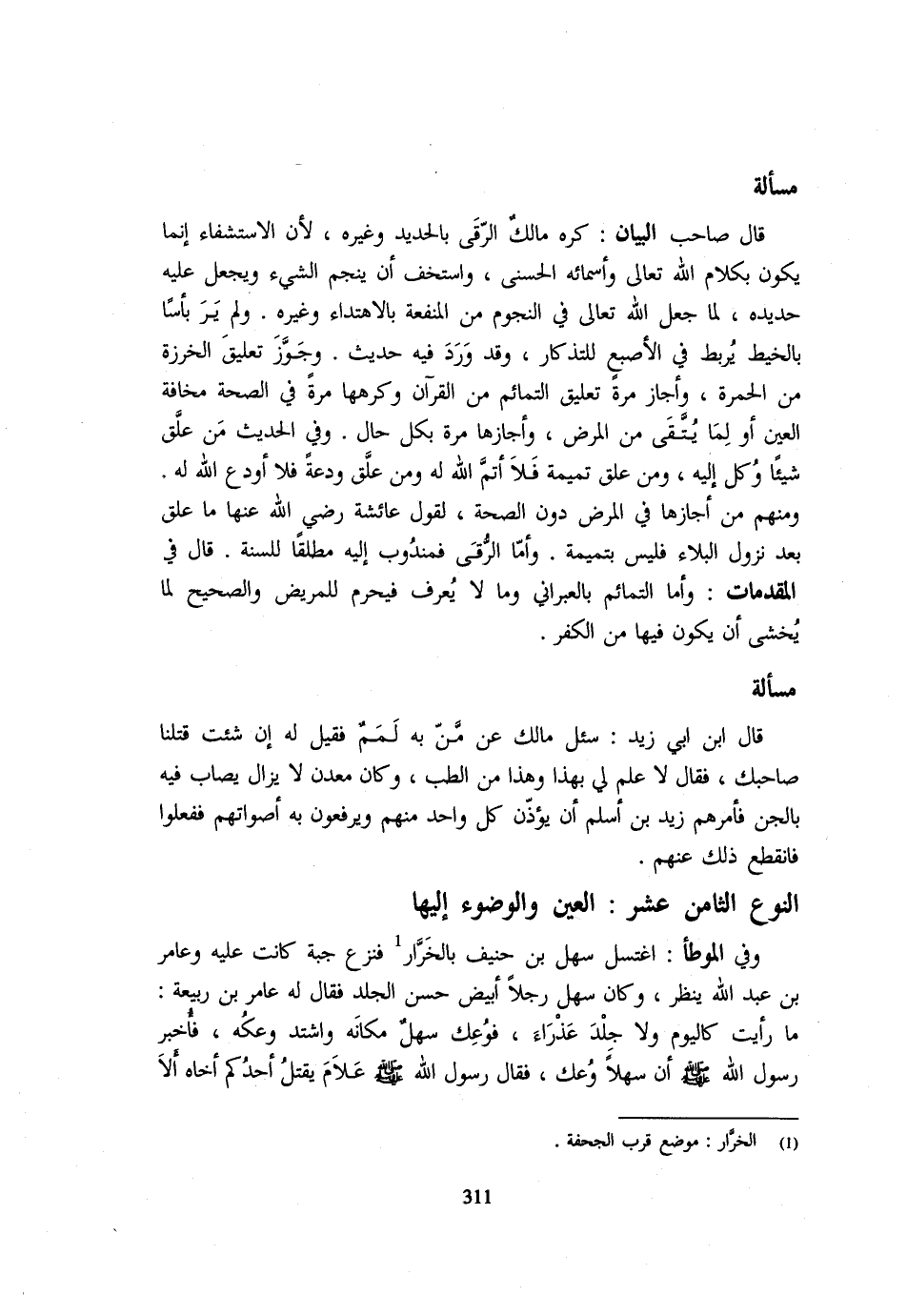قَالَ صَاحِبُ الْبَيَانِ كَرِهَ مَالِكٌ الرُّقَى بِالْحَدِيدِ وَغَيْرِهِ لِأَنَّ الِاسْتِشْفَاءَ إِنَّمَا يَكُونُ بِكَلَامِ اللَّهِ تَعَالَى وَأَسْمَائِهِ الْحُسْنَى وَاسْتَخَفَّ أَنْ يَنْجُمَ الشَّيْءُ وَيَجْعَلَ عَلَيْهِ حَدِيدَهُ لِمَا جَعَلَ اللَّهُ تَعَالَى فِي النُّجُومِ مِنَ الْمَنْفَعَةِ بِالِاهْتِدَاءِ وَغَيْرِهِ وَلَمْ يَرَ بَأْسًا بِالْخَيْطِ يُرْبَطُ فِي الْأُصْبُعِ لِلتَّذْكَارِ وَقَدْ وَرَدَ فِيهِ حَدِيثٌ وَجَوَّزَ تَعْلِيقَ الْخَرَزَةِ مِنَ الْحُمْرَةِ وَأَجَازَ مَرَّةً تَعْلِيقَ التَّمَائِمِ من الْقُرْآن وَكَرِهَهَا مَرَّةً فِي الصِّحَّةِ مَخَافَةَ الْعَيْنِ أَوْ لِمَا يُتَّقَى مِنَ الْمَرَضِ وَأَجَازَهَا مَرَّةً بِكُلِّ حَالٍ وَفِي الْحَدِيثِ مَنْ عَلَّقَ شَيْئًا وُكِلَ إِلَيْهِ وَمَنْ عَلَّقَ تَمِيمَةً فَلَا أَتَمَّ اللَّهُ لَهُ وَمَنْ عَلَّقَ وَدَعَةً فَلَا أَوْدَعَ اللَّهُ لَهُ وَمِنْهُمْ مَنْ أَجَازَهَا فِي الْمَرَضِ دُونَ الصِّحَّةِ لِقَوْلِ عَائِشَةَ رَضِيَ اللَّهُ عَنْهَا مَا عُلِّقَ بَعْدَ نُزُولِ الْبَلَاءِ فَلَيْسَ بِتَمِيمَةٍ وَأَمَّا الرُّقَى فَمَنْدُوبٌ إِلَيْهِ مُطْلَقًا لِلسُّنَّةِ قَالَ فِي الْمُقَدِّمَاتِ وَأَمَّا التَّمَائِمُ بِالْعِبْرَانِيِّ وَمَا لَا يُعْرَفُ فَيَحْرُمُ لِلْمَرِيضِ وَالصَّحِيحِ لِمَا يُخْشَى أَنْ يَكُونَ فِيهَا مِنَ الْكُفْرِ