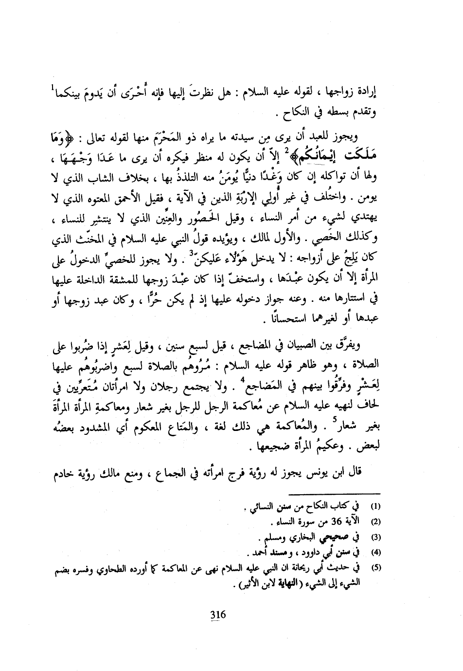(هَل نظرت إِلَيْهَا فَإِنَّهُ أَحْرَى أَن يَدُوم بَيْنَكُمَا وَتَقَدَّمَ بَسْطُهُ فِي النِّكَاحِ) وَيَجُوزُ لِلْعَبْدِ أَنْ يَرَى مِنْ سَيِّدَتِهِ مَا يَرَاهُ ذُو الْمَحْرَمِ مِنْهَا لِقَوْلِهِ تَعَالَى {وَمَا مَلَكَتْ أَيْمَانُكُمْ} إِلَّا أَنْ يَكُونَ لَهُ مَنْظَرٌ فَيُكْرَهُ أَنْ يرى مَا عدا وَجههَا وَلها أَن تواكله إِن كَانَ وَغدا دنيا يومن مِنْهُ التَّلَذُّذُ بِهَا بِخِلَافِ الشَّابِّ الَّذِي لَا يُؤْمَنُ وَاخْتُلِفَ فِي غَيْرِ أُولِي الْإِرْبَةِ الَّذِينَ فِي الْآيَةِ فَقِيلَ الْأَحْمَقُ الْمَعْتُوهُ الَّذِي لَا يَهْتَدِي لِشَيْءٍ مِنْ أَمْرِ النِّسَاءِ وَقِيلَ الْحَصُورُ وَالْعِنِّينُ الَّذِي لَا يَنْتَشِرُ لِلنِّسَاءِ وَكَذَلِكَ الْخَصِيُّ وَالْأول لمَالِك وَيُؤَيِّدهُ قَول النَّبِي - صَلَّى اللَّهُ عَلَيْهِ وَسَلَّم َ - فِي الْمُخَنَّثِ الَّذِي كَانَ يَلِجُ عَلَى أَزْوَاجِهِ لَا يَدْخُلُ هَؤُلَاءِ عَلَيْكُنَّ وَلَا يَجُوزُ لِلْخَصِيِّ الدُّخُولُ عَلَى الْمَرْأَةِ إِلَّا أَنْ يَكُونَ عَبْدَهَا واستخف إِذا كَانَ عبد زَوجهَا للْمَشَقَّة الداخلية عَلَيْهَا فِي اسْتِتَارِهَا مِنْهُ وَعَنْهُ جَوَازُ دُخُولِهِ عَلَيْهَا إِذْ لَمْ يَكُنْ حُرًّا وَكَانَ عَبْدَ زَوْجِهَا أَوْ عَبْدَهَا أَوْ لِغَيْرِهِمَا اسْتِحْسَانًا وَيُفَرَّقُ بَيْنَ الصِّبْيَانِ فِي الْمَضَاجِعِ قِيلَ لِسَبْعِ سِنِينَ وَقِيلَ لِعَشْرٍ إِذَا ضُرِبُوا عَلَى الصَّلَاةِ وَهُوَ ظَاهر قَوْله - صَلَّى اللَّهُ عَلَيْهِ وَسَلَّم َ -