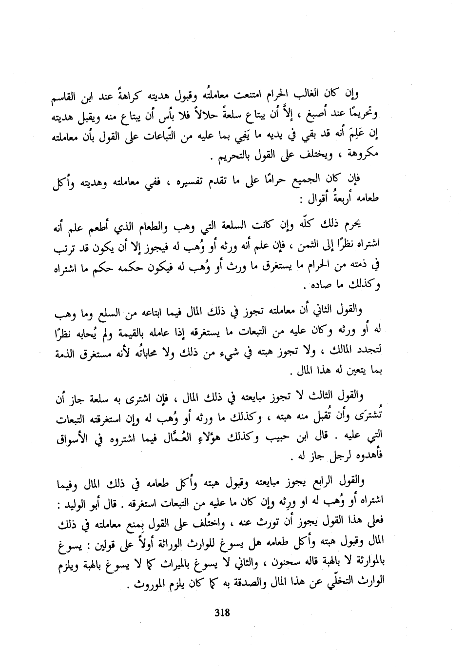 وَإِنْ كَانَ الْغَالِبُ الْحَرَامَ امْتَنَعَتْ مُعَامَلَتُهُ وَقَبُولُ هَدِيَّتِهِ كَرَاهَةً عِنْدَ ابْنِ الْقَاسِمِ وَتَحْرِيمًا عِنْدَ أَصْبَغَ إِلَّا أَنْ يَبْتَاعَ سِلْعَةً حَلَالًا فَلَا بَأْسَ أَنْ يَبْتَاعَ مِنْهُ وَيَقْبَلَ هَدِيَّتَهُ إِنْ عَلِمَ أَنَّهُ قَدْ بَقِيَ فِي يَدَيْهِ مَا يَفِي بِمَا عَلَيْهِ من التباعات عَلَى الْقَوْلِ بِأَنَّ مُعَامَلَتَهُ مَكْرُوهَةٌ وَيُخْتَلَفُ عَلَى الْقَوْلِ بِالتَّحْرِيمِ فَإِنْ كَانَ الْجَمِيعُ حَرَامًا عَلَى مَا تَقَدَّمَ تَفْسِيرُهُ فَفِي مُعَامَلَتِهِ وَهَدِيَّتِهِ وَأَكْلِ طَعَامِهِ أَرْبَعَةُ أَقْوَالٍ يَحْرُمُ ذَلِكَ كُلُّهُ وَإِنْ كَانَتِ السِّلْعَةُ الَّتِي وَهَبَ وَالطَّعَامُ الَّذِي أَطْعَمَ عُلِمَ أَنَّهُ اشْتَرَاهُ نَظَرًا إِلَى الثَّمَنِ فَإِنْ عُلِمَ أَنَّهُ وَرِثَهُ أَوْ وُهِبَ لَهُ فَيَجُوزُ إِلَّا أَنْ يَكُونَ قَدْ تَرَتَّبَ فِي ذِمَّتِهِ مِنَ الْحَرَامِ مَا يَسْتَغْرِقُ مَا وَرِثَ أَوْ وُهِبَ لَهُ فَيَكُونُ حُكْمُهُ حُكْمَ مَا اشْتَرَاهُ وَكَذَلِكَ مَا صَادَهُ وَالْقَوْلُ الثَّانِي أَنَّ مُعَامَلَتَهُ تَجُوزُ فِي ذَلِكَ الْمَالِ فِيمَا ابْتَاعَهُ مِنَ السِّلَعِ وَمَا وُهِبَ لَهُ أَوْ وَرِثَهُ وَكَانَ عَلَيْهِ مِنَ التَّبِعَاتِ مَا يَسْتَغْرِقُهُ إِذَا عَامَلَهُ بِالْقِيمَةِ وَلَمْ يُحَابِهِ نَظَرًا لِتَجَدُّدِ الْمَالِكِ وَلَا تَجُوزُ هِبَتُهُ فِي شَيْءٍ مِنْ ذَلِكَ وَلَا مُحَابَاتُهُ لِأَنَّهُ مُسْتَغْرَقُ الذِّمَّةِ بِمَا يَتَعَيَّنُ لَهُ هَذَا الْمَالُ وَالْقَوْلُ الثَّالِثُ لَا تَجُوزُ مُبَايَعَتُهُ فِي ذَلِكَ الْمَالِ فَإِنِ اشْتَرَى بِهِ سِلْعَةً جَازَ أَنْ تُشْتَرَى وَأَنْ تُقْبَلَ مِنْهُ هِبَتُهُ وَكَذَلِكَ مَا وَرِثَهُ أَوْ وُهِبَ لَهُ وَإِنِ استغرقه التَّبِعَاتُ الَّتِي عَلَيْهِ قَالَ ابْنُ حَبِيبٍ وَكَذَلِكَ هَؤُلَاءِ الْعُمَّالُ فِيمَا اشْتَرَوْهُ فِي الْأَسْوَاقِ فَأَهْدَوْهُ لِرَجُلٍ جَازَ لَهُ وَالْقَوْلُ الرَّابِعُ يَجُوزُ مُبَايَعَتُهُ وَقَبُولُ هِبَتِهِ وَأَكْلُ طَعَامِهِ فِي ذَلِكَ الْمَالِ وَفِيمَا اشْتَرَاهُ أَوْ وُهِبَ لَهُ أَوْ وَرِثَهُ وَإِنْ كَانَ مَا عَلَيْهِ مِنَ التَّبِعَاتِ اسْتَغْرَقَهُ قَالَ أَبُو الْوَلِيدِ فَعَلَى هَذَا الْقَوْلِ يَجُوزُ أَنْ تُورَثَ عَنْهُ وَاخْتُلِفَ عَلَى الْقَوْلِ بِمَنْعِ مُعَامَلَتِهِ فِي ذَلِكَ الْمَالِ وَقَبُولِ هِبَتِهِ وَأَكْلِ طَعَامه هَل يسوغ للْوَارِث الوارثة أَولا عَلَى قَوْلَيْنِ يَسُوغُ بِالْمُوَارَثَةِ لَا بِالْهِبَةِ قَالَهُ سَحْنُونٌ وَالثَّانِي لَا يَسُوغُ بِالْمِيرَاثِ كَمَا لَا يَسُوغُ بِالْهِبَةِ وَيَلْزَمُ الْوَارِثَ التَّخَلِّي عَنْ هَذَا الْمَالِ وَالصَّدَقَةُ بِهِ كَمَا كَانَ يَلْزَمُ الْمَوْرُوثَ
