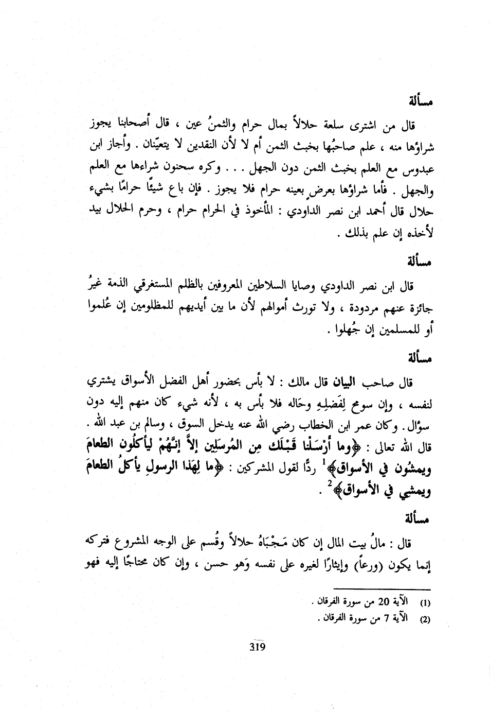 قَالَ صَاحِبُ الْبَيَانِ قَالَ مَالِكٌ لَا بَأْسَ بِحُضُورِ أَهْلِ الْفَضْلِ الْأَسْوَاقَ يَشْتَرِي لِنَفْسِهِ وَإِنْ سُومِحَ لِفَضْلِهِ وَحَالِهِ فَلَا بَأْسَ بِهِ لِأَنَّهُ شَيْءٌ كَانَ مِنْهُمْ إِلَيْهِ دُونَ سُؤَالٍ وَكَانَ عُمَرُ ابْن الْخطاب رَضِي الله عته يَدْخُلُ السُّوقَ وَسَالِمُ بْنُ عَبْدِ اللَّهِ قَالَ اللَّهُ تَعَالَى {وَمَا أَرْسَلْنَا قَبْلَكَ مِنَ الْمُرْسَلِينَ إِلا إِنَّهُمْ لَيَأْكُلُونَ الطَّعَامَ وَيَمْشُونَ فِي الأَسْوَاقِ} ردا لقَوْل الْمُشْركين {مَا لهَذَا الرَّسُول يَأْكُل الطَّعَام وَيَمْشي فِي الْأَسْوَاق}