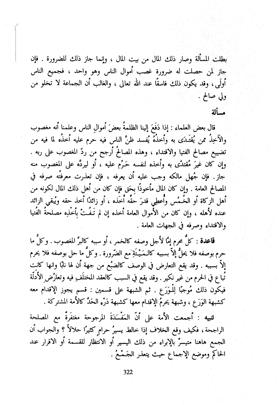 قَالَ بَعْضُ الْعُلَمَاءِ إِذَا دَفَعَ إِلَيْنَا الظَّلَمَةُ بَعْضَ أَمْوَالِ النَّاسِ وَعَلِمْنَا أَنَّهُ مَغْصُوبٌ وَالْآخِذَ مِمَّنْ يُقْتَدَى بِهِ وَأَخْذَهُ يُفْسِدُ ظَنَّ النَّاسِ فِيهِ حَرُمَ عَلَيْهِ أَخْذُهُ لِمَا فِيهِ مِنْ تَضْيِيعِ مَصَالِحِ الْفُتْيَا وَالِاقْتِدَاءِ وَهَذِهِ الْمَصَالِحُ أَرْجَحُ مِنْ رَدِّ الْمَغْصُوبِ عَلَى رَبِّهِ وَإِنْ كَانَ غَيْرَ مُقْتَدًى بِهِ وَأَخَذَهُ لِنَفْسِهِ حَرُمَ عَلَيْهِ أَوْ لِيَرُدَّهُ عَلَى الْمَغْصُوبِ مِنْهُ جَازَ فَإِنْ جُهِلَ مَالِكُهُ وَجَبَ عَلَيْهِ أَنْ يَعْرِّفَهُ فَإِنْ تَعَذَّرَتْ مَعْرفَته صرف فِي الْمَصَالِحِ الْعَامَّةِ وَإِنْ كَانَ الْمَالُ مَأْخُوذًا بِحَقٍّ فَإِنْ كَانَ مِنْ أَهْلِ ذَلِكَ الْمَالِ لِكَوْنِهِ مِنْ أَهْلِ الزَّكَاةِ أَوِ الْخُمُسِ وَأُعْطِيَ قَدْرَ حَقِّهِ أَخَذَهُ أَوْ زَائِدًا أَخَذَ حَقَّهُ ويبقي الزَّائِد عَنهُ لِأَهْلِهِ وَإِنْ كَانَ مِنَ الْأَمْوَالِ الْعَامَّةِ أَخَذَهُ إِنْ لَمْ تَفُتْ بِأَخْذِهِ مَصْلَحَةُ الْفُتْيَا وَالِاقْتِدَاءِ وَصَرَفَهُ فِي الْجِهَاتِ الْعَامَّةِ قَاعِدَةٌ كُلُّ مُحَرَّمٍ إِمَّا لِأَجْلِ وَصْفِهِ كَالْخَمْرِ أَوْ سَبَبِهِ كَالْبُرِّ الْمَغْصُوبِ وَكُلُّ مَا حَرُمَ بِوَصْفِهِ فَلَا يَحِلُّ إِلَّا بِسَبَبِهِ كَالْمَيْتَةِ مَعَ الضَّرُورَةِ وَكُلُّ مَا حرم بِوَصْفِهِ فَلَا يَحْرُمُ إِلَّا بِسَبَبِهِ وَقَدْ يَقَعُ التَّعَارُض فِي الْوَصْف كالضبع مِنْ جِهَةِ أَنَّ لَهَا نَابًا وَأَنَّهَا كَانَتْ تُبَاعُ فِي الْحَرَمِ مِنْ غَيْرِ نَكِيرٍ وَقَدْ يَقع فِي السَّبَب كالعقد المتخلف فِيهِ وَتَعَارُضِ الْأَدِلَّةِ فَيَكُونُ ذَلِكَ مُوجِبًا لِلْوَرَعِ ثُمَّ الشُّبْهَةُ عَلَى قِسْمَيْنِ قِسْمٍ يَجُوزُ الْإِقْدَامُ مَعَهُ كَشُبْهَةِ الْوَرَعِ وَشُبْهَةٍ يَحْرُمُ الْإِقْدَامُ مَعَهَا كَشُبْهَةِ دَرْءِ الْحَدِّ كَالْأَمَةِ الْمُشْتَرَكَةِ تَنْبِيهٌ أَجْمَعَتِ الْأُمَّةُ عَلَى أَنَّ الْمَفْسَدَةَ الْمَرْجُوحَةَ مُغْتَفَرَةٌ مَعَ الْمَصْلَحَةِ الرَّاجِحَةِ فَكَيْفَ وَقَعَ الْخِلَافُ إِذَا خَالَطَ يَسِيرٌ حَرَامٌ كَثِيرًا حَلَالًا وَالْجَوَابُ أَنَّ الْجَمْعَ هَاهُنَا مُتَيَسِّرٌ بِالْإِبْرَاءِ مِنْ ذَلِكَ الْيَسِيرِ أَوِ الِانْتِظَارِ لِلْقِسْمَةِ أَوِ الْإِقْرَارِ عِنْدَ الْحَاكِمِ وَمَوْضِعِ الْإِجْمَاعِ حَيْثُ يَتَعَذَّرُ الْجَمْعُ