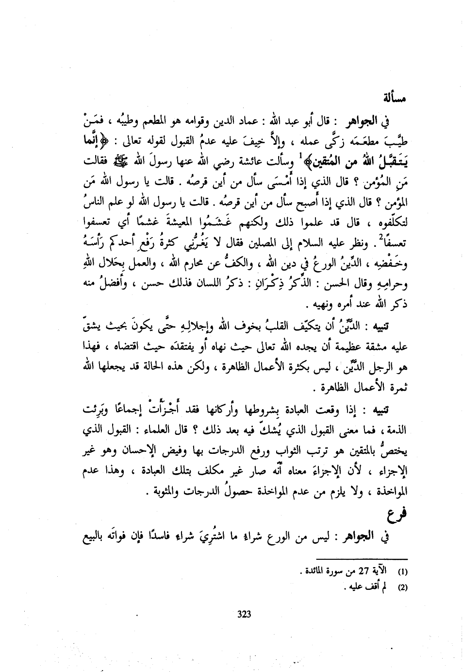 فِي الْجَوَاهِرِ قَالَ أَبُو عَبْدِ اللَّهِ عِمَادُ الدِّينِ وَقِوَامُهُ هُوَ الْمَطْعَمُ وَطِيبُهُ فَمَنْ طيب مطعمه زكى عَمَلُهُ وَإِلَّا خِيفَ عَلَيْهِ عَدَمُ الْقَبُولِ لِقَوْلِهِ تَعَالَى {إِنَّمَا يتَقَبَّل الله من الْمُتَّقِينَ} وَسَأَلَتْ عَائِشَةُ رَضِيَ اللَّهُ عَنْهَا رَسُولَ اللَّهِ - صَلَّى اللَّهُ عَلَيْهِ وَسَلَّم َ - فَقَالَت من الْمُؤمن قَالَ الَّذِي إِذا أَمْسَى سَأَلَ مِنْ أَيْنَ قُرْصُهُ قَالَتْ يَا رَسُولَ الله مَنِ الْمُؤْمِنُ قَالَ الَّذِي إِذَا أَصْبَحَ سَأَلَ مِنْ أَيْنَ قُرْصُهُ قَالَتْ يَا رَسُولَ اللَّهِ لَوْ عَلِمَ النَّاسُ لَتَكَلَّفُوهُ قَالَ قَدْ عَلِمُوا ذَلِكَ وَلَكِنَّهُمْ غَشَمُوا الْمَعِيشَةَ غَشْمًا أَيْ تَعَسَّفُوا تعسفا وَنظر - صَلَّى اللَّهُ عَلَيْهِ وَسَلَّم َ - إِلَى الْمُصَلِّينَ فَقَالَ لَا يَغُرُّنِي كَثْرَةُ رَفْعِ أَحَدِكُمْ رَأْسَهُ وَخَفْضِهِ الدِّينُ الْوَرَعُ فِي دِينِ اللَّهِ وَالْكَفُّ عَنْ مَحَارِمِ اللَّهِ وَالْعَمَلُ بِحَلَالِ اللَّهِ وَحَرَامِهِ وَقَالَ الْحَسَنُ الذِّكْرُ ذِكْرَانِ ذِكْرُ اللِّسَانِ فَذَلِكَ حَسَنٌ وَأَفْضَلُ مِنْهُ ذِكْرُ اللَّهِ عِنْدَ أَمْرِهِ وَنَهْيِهِ تَنْبِيهٌ الدِّينُ أَنْ يَتَكَيَّفَ الْقَلْبُ بِخَوْفِ اللَّهِ وَإِجْلَالِهِ حَتَّى يَكُونَ بِحَيْثُ يَشُقُّ عَلَيْهِ مَشَقَّةً عَظِيمَةً أَنْ يَجِدَهُ اللَّهُ تَعَالَى حَيْثُ نَهَاهُ أَوْ يَفْتَقِدَهُ حَيْثُ اقْتَضَاهُ فَهَذَا هُوَ الرَّجُلُ الدَّيِّنُ لَيْسَ بِكَثْرَةِ الْأَعْمَالِ الظَّاهِرَةِ وَلَكِنْ هَذِهِ الْحَالَةُ قَدْ يَجْعَلُهَا اللَّهُ ثَمَرَةَ الْأَعْمَالِ الظَّاهِرَةِ تَنْبِيهٌ إِذَا وَقَعَتِ الْعِبَادَةُ بِشُرُوطِهَا وَأَرْكَانِهَا فَقَدْ أَجْزَأَتْ إِجْمَاعًا وَبَرِئَتِ الذِّمَّةُ فَمَا مَعْنَى الْقَبُولِ الَّذِي يُشَكُّ فِيهِ بَعْدَ ذَلِكَ قَالَ الْعُلَمَاءُ الْقَبُولُ الَّذِي يَخْتَصُّ بِالْمُتَّقِينَ هُوَ تَرَتُّبُ الثَّوَابِ وَرَفْعُ الدَّرَجَاتِ بِهَا وَفَيْضُ الْإِحْسَانِ وَهُوَ غَيْرُ الْإِجْزَاءِ لِأَنَّ الْإِجْزَاءَ مَعْنَاهُ أَنَّهُ صَارَ غَيْرَ مُكَلَّفٍ بِتِلْكَ الْعِبَادَةِ وَهَذَا عدم المواخذة وَلَا يلْزم من عدم المواخذة حُصُولُ الدَّرَجَاتِ وَالْمَثُوبَةُ